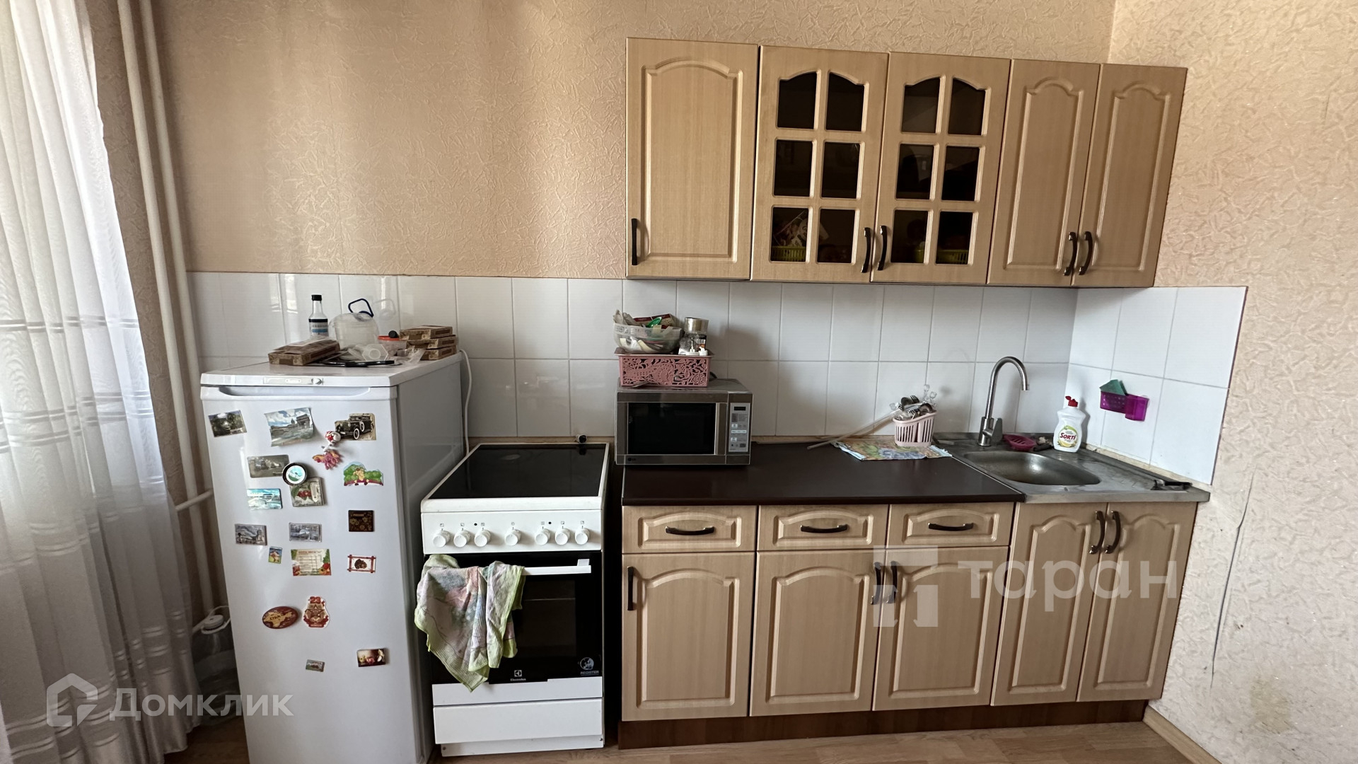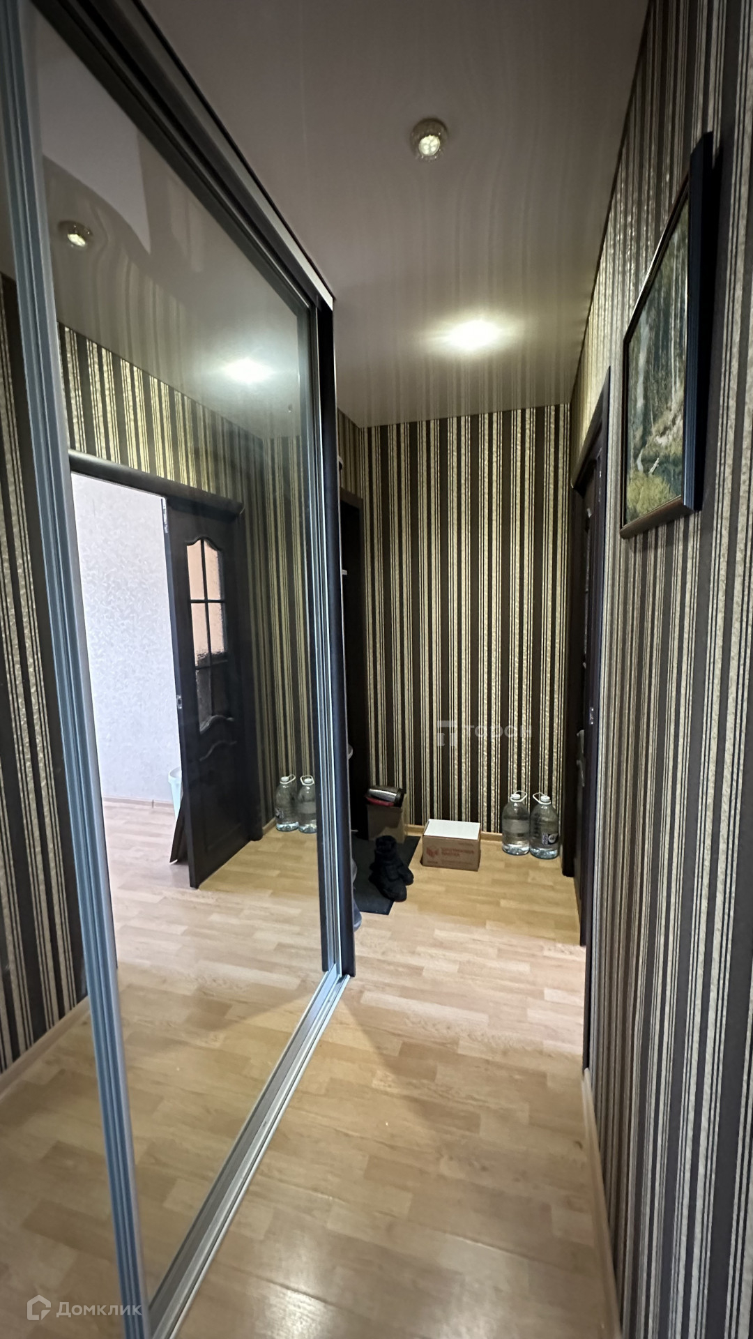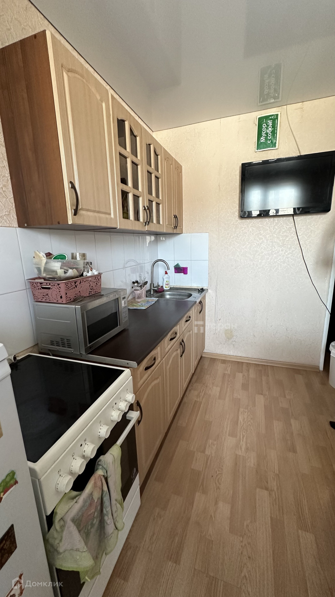 В квартире остается кухонный гарнитур и встроенный шкаф с зеркалами.