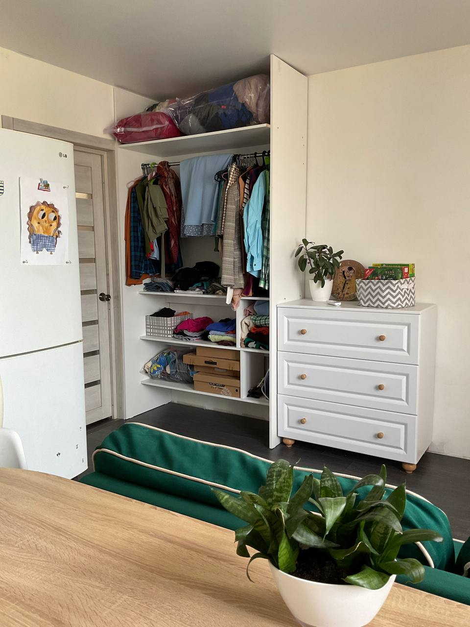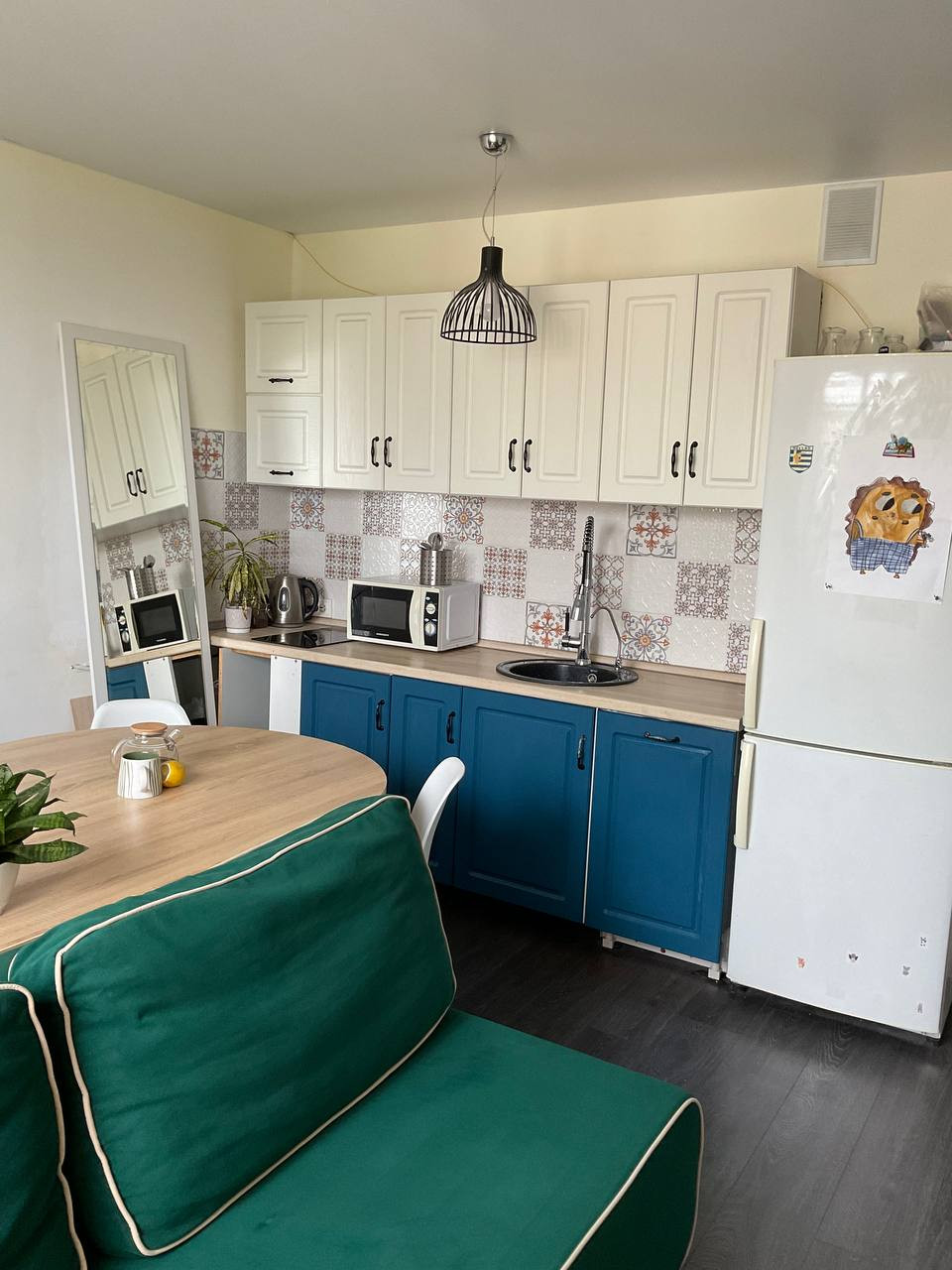 Необычный стол делит кухню на несколько зон: зона отдыха, хранения, рабочее место и обеденная зона. На кухне остается: кухонный гарнитур (без посудомоечной машины), диван, холодильник, кондиционер, стеллаж для хранения одежды.
