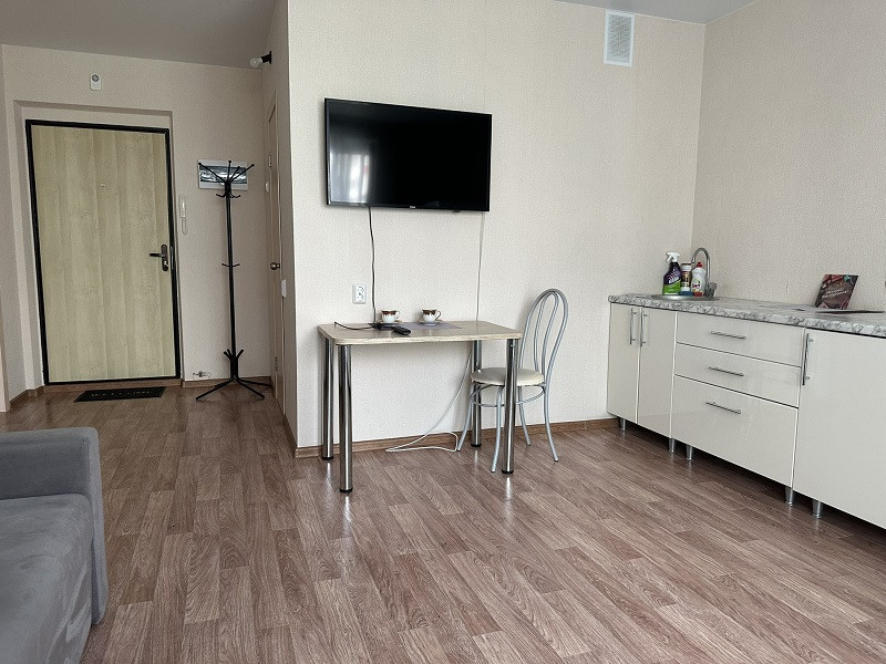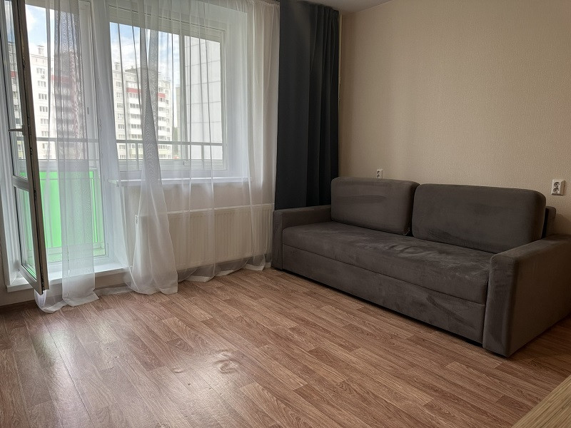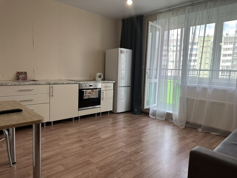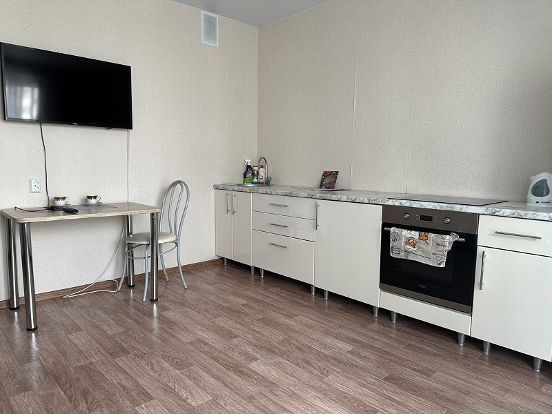 Квартира меблирована: кухонный гарнитур, обеденная зона, диван, прихожая. Из бытовой техники: телевизор, холодильник, стиральная машина, варочная поверхность и духовая печь.