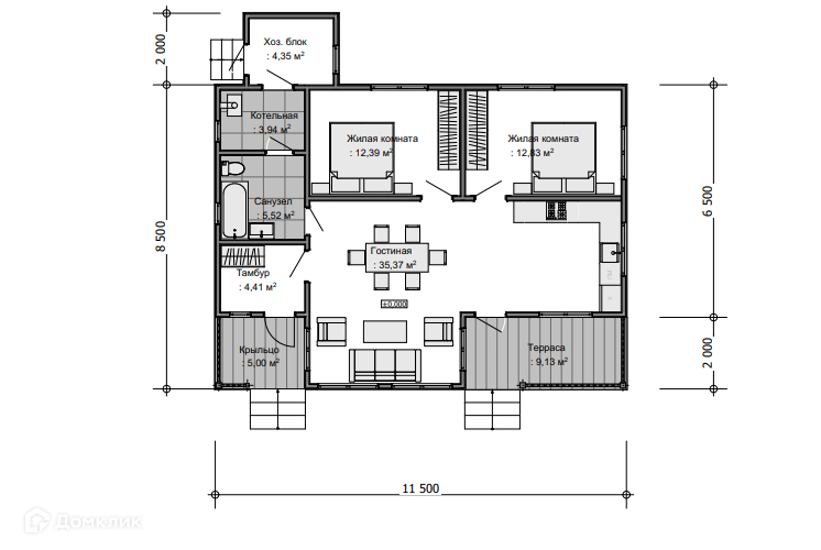 Одноэтажный каркасный дом оптимальной планировки с двумя спальнями и большой кухней гостиной, в центре которой расположен настоящий дровяной камин!