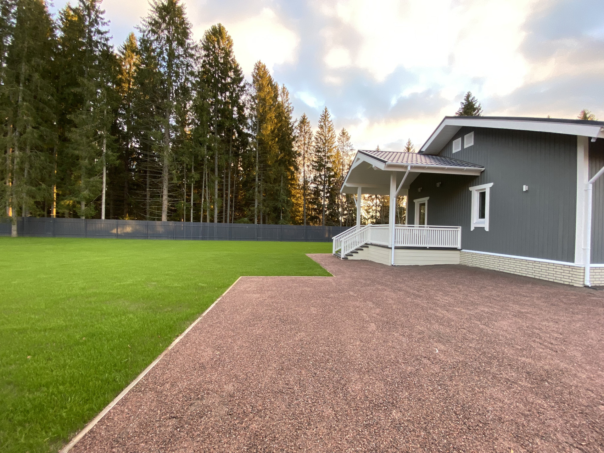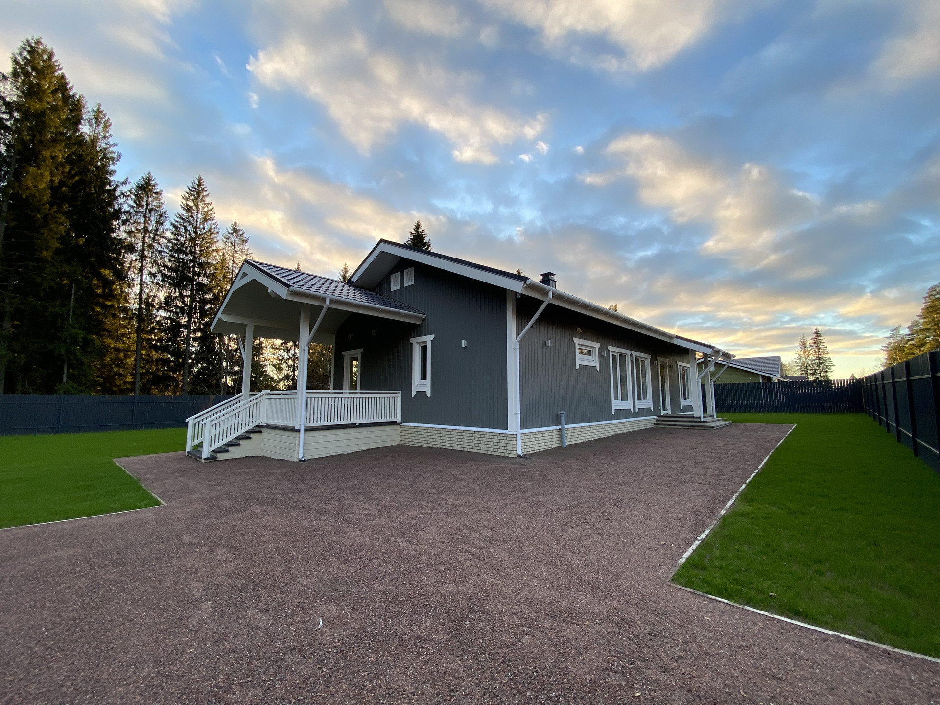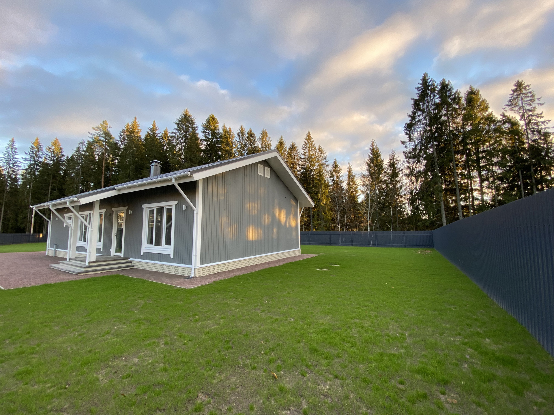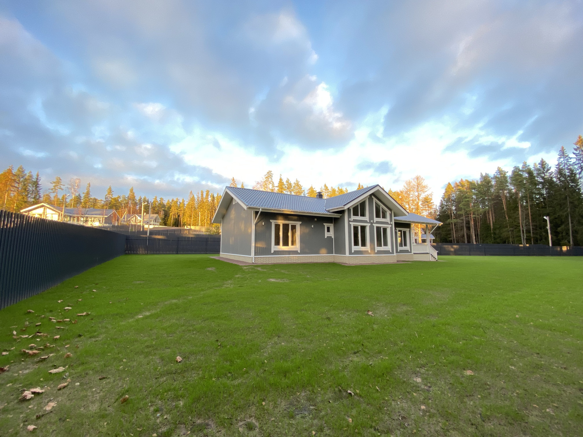Периметр огорожен забором, выполнены ландшафтные работы, отсыпаны дорожки, засеян газон, сделана отмостка по периметру дома, установлены электрические откатные ворота. Организовано несколько парковочных машиномест.