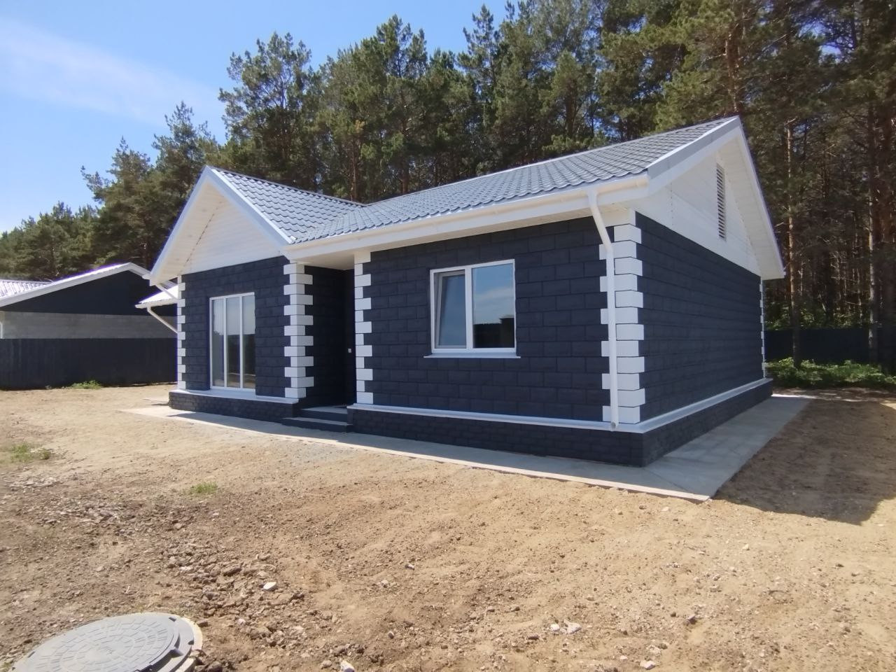 Фундамент дома утепленная железобитоная плита 40 см, утепленная отмостка, стены состоят из термоблоков 40 см.,крыша утеплена минерально-ватным утеплителем 30 см.