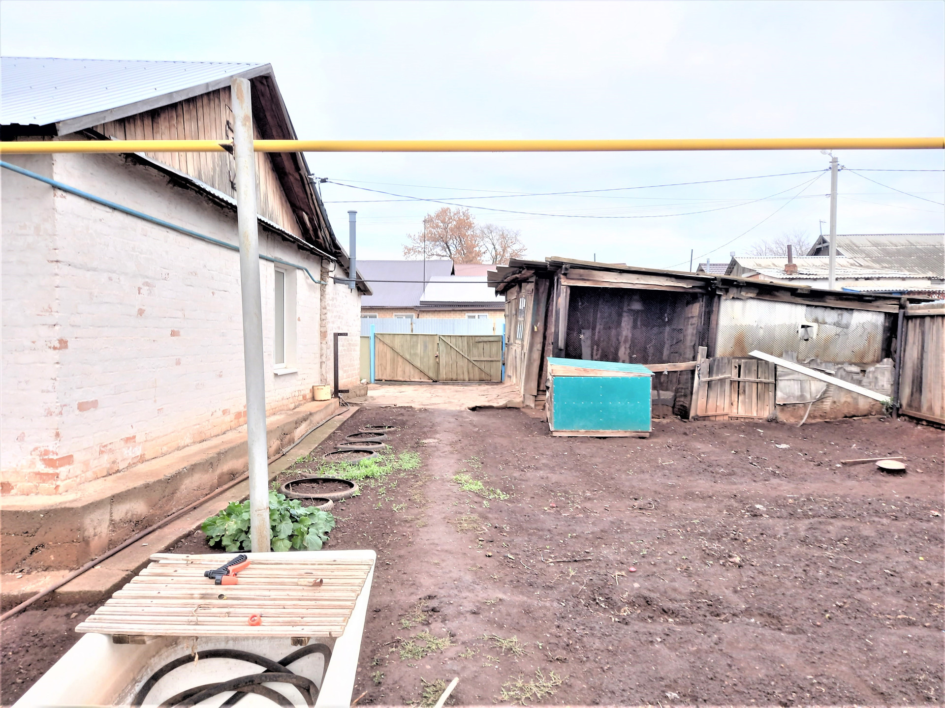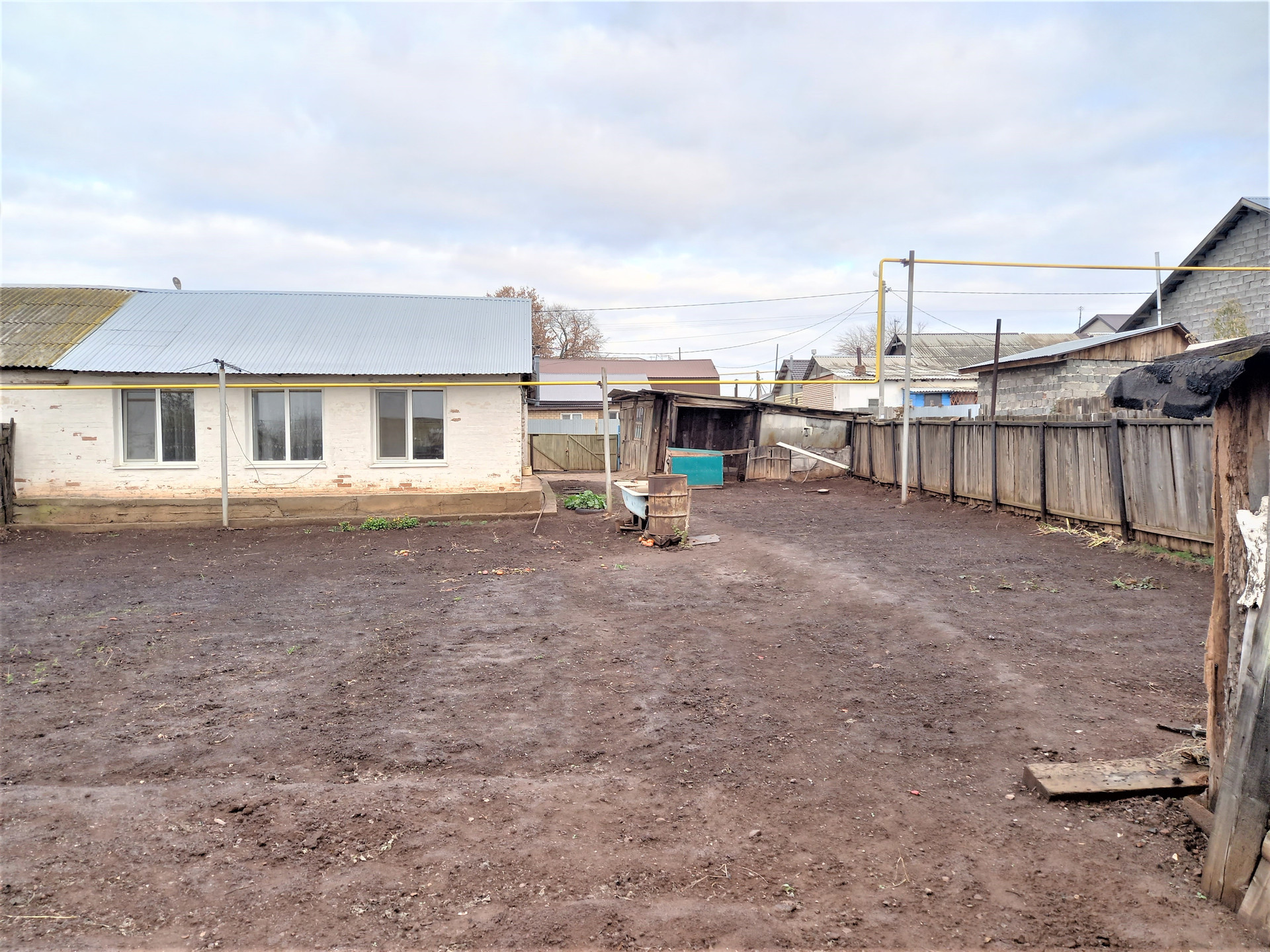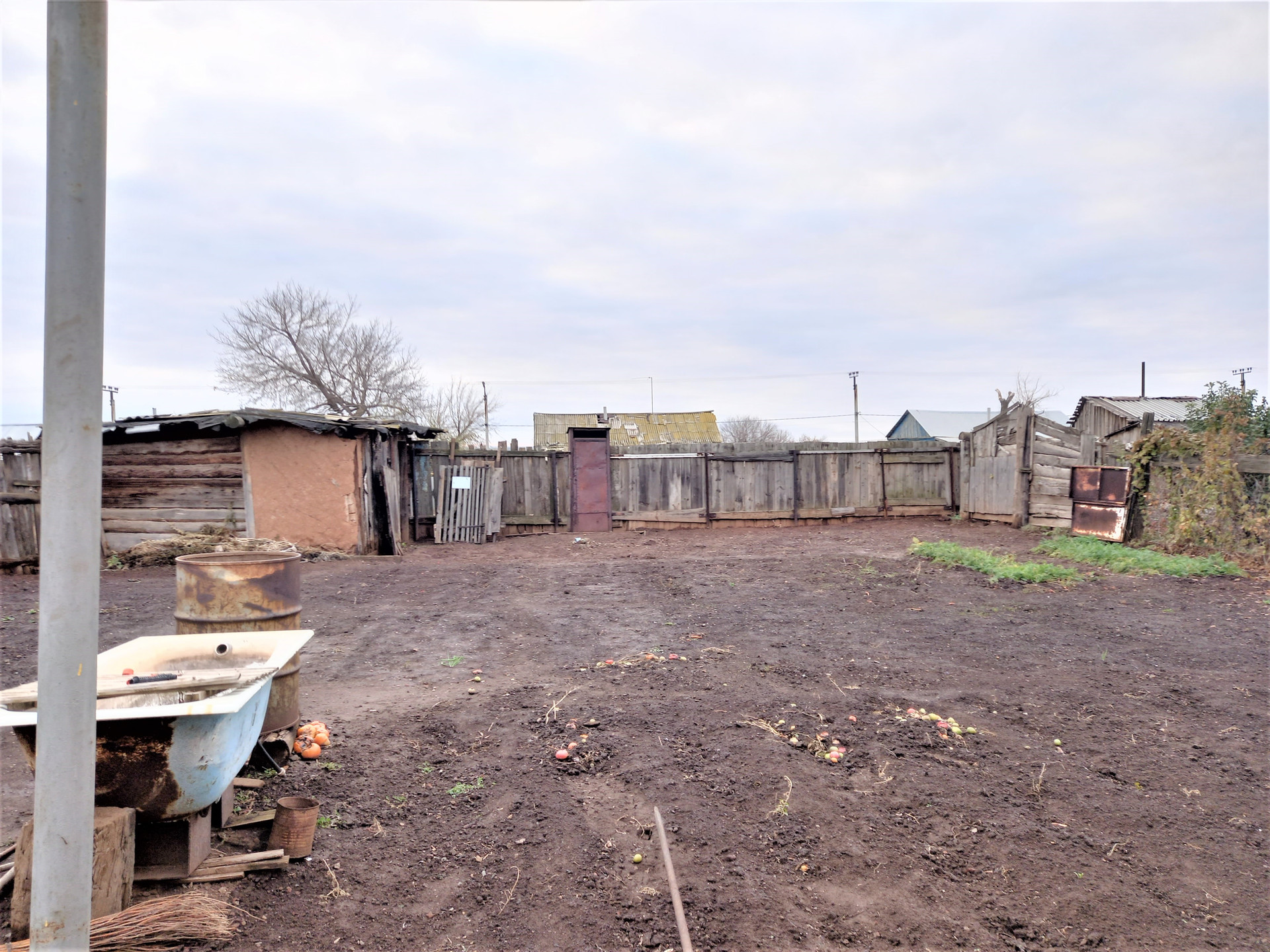 Деревянная хозпостройка с погребом, которую можно использовать под гараж, на заднем дворе сарай для скотины или птицы. Забор по всему периметру участка.