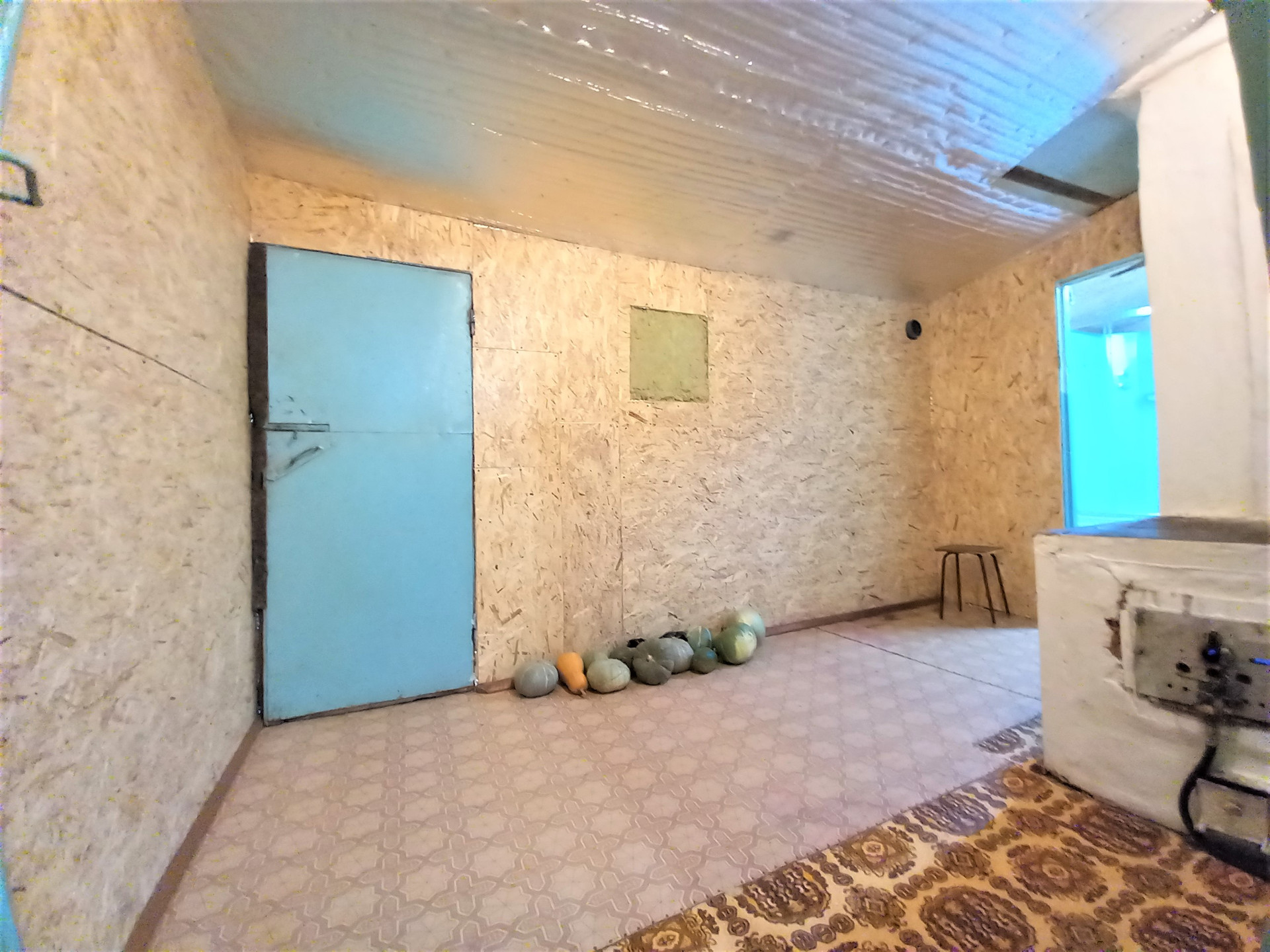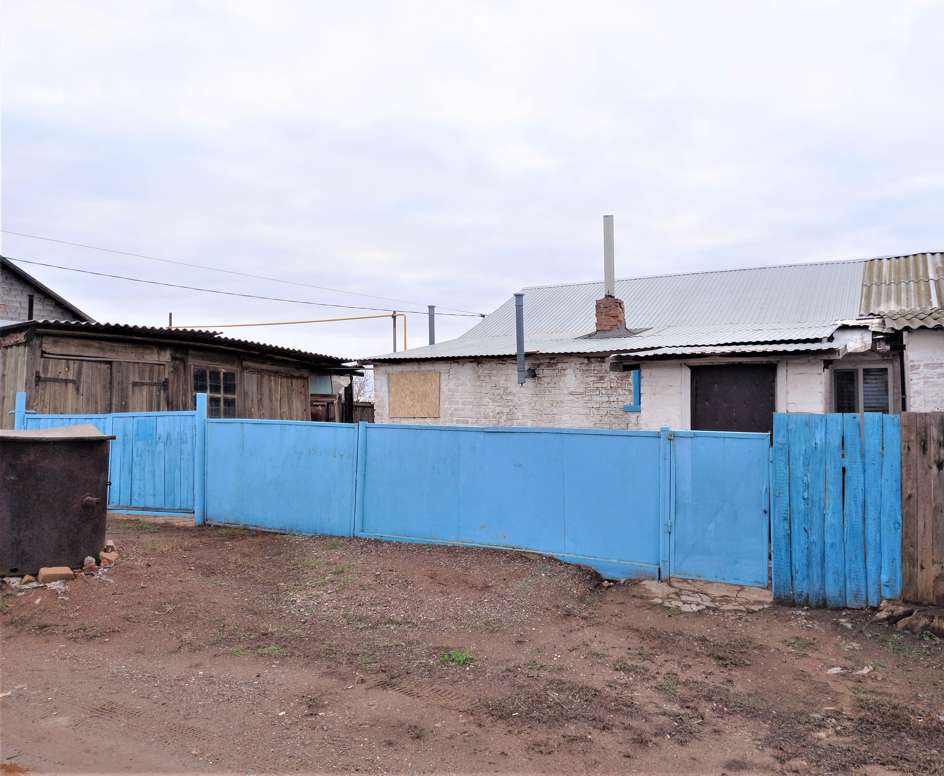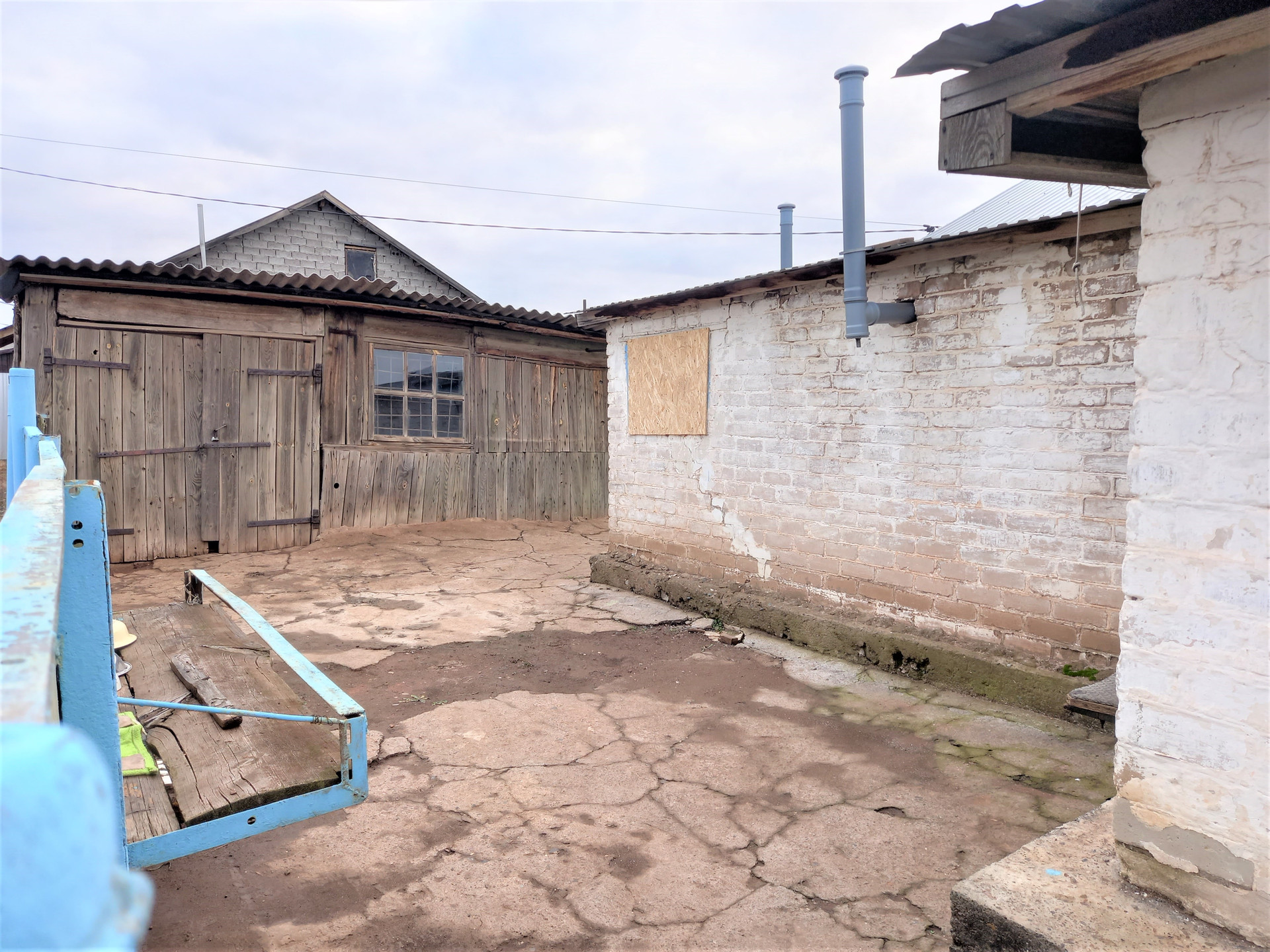 Деревянная хозпостройка с погребом, которую можно использовать под гараж, на заднем дворе сарай для скотины или птицы. Забор по всему периметру участка.