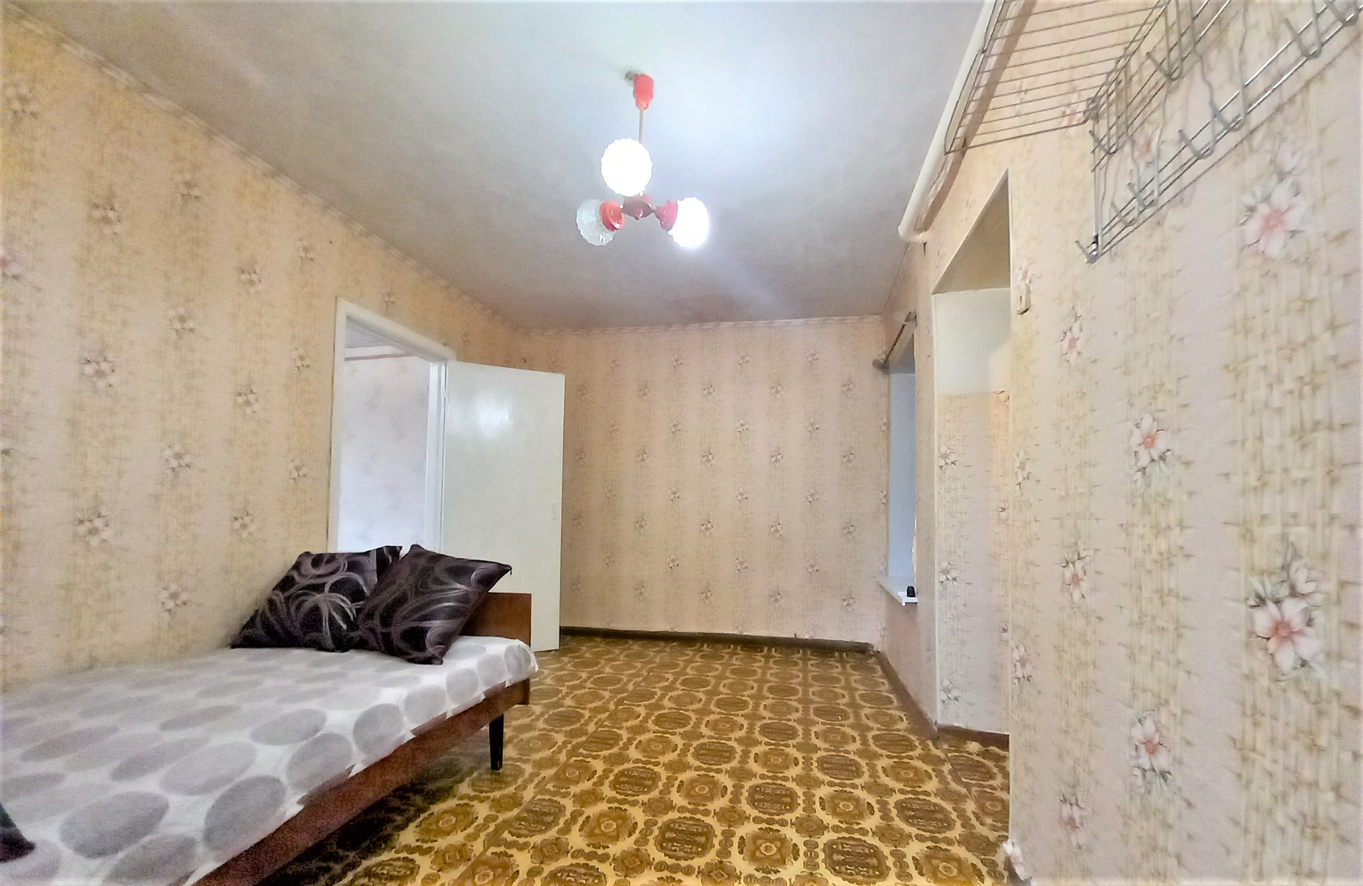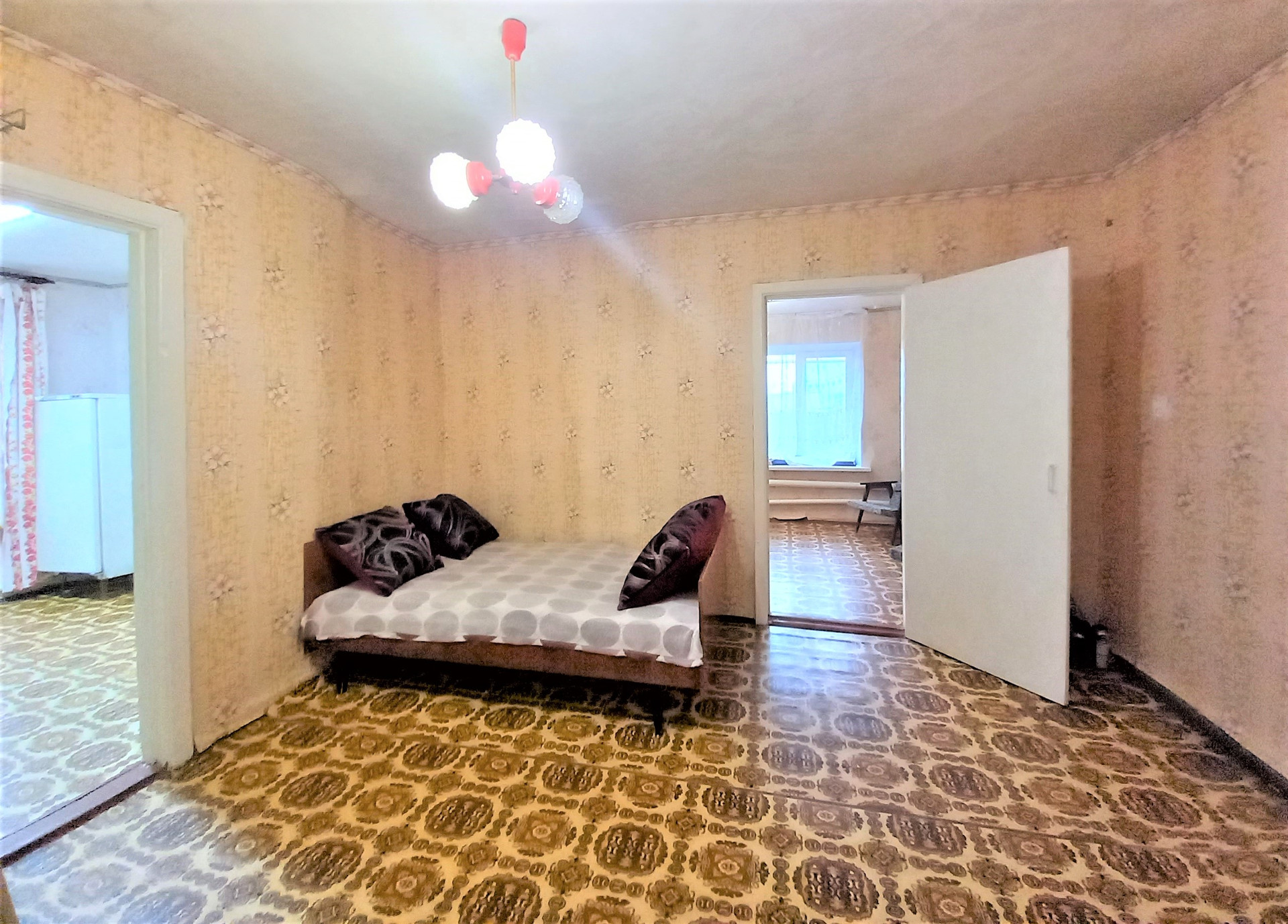 3 комнаты, кухня 9,1 кв.м. Есть варианты для перепланировки (например, перенести кухню в другое помещение и изолировать еще одну комнату.