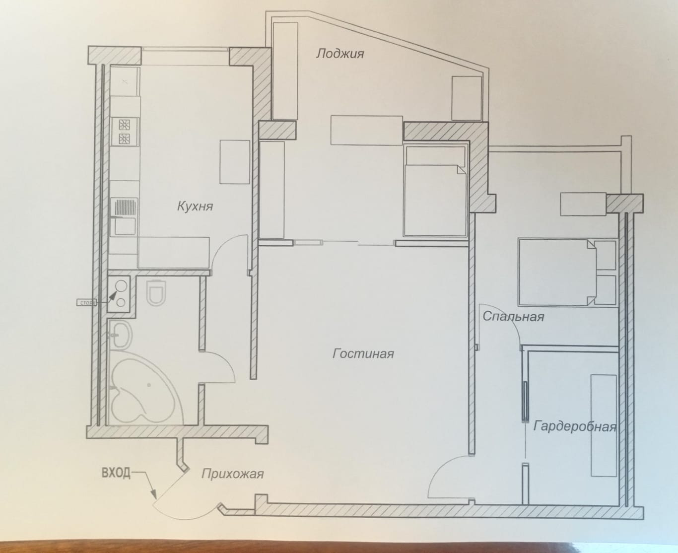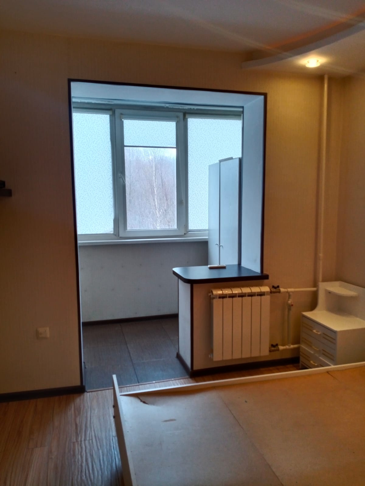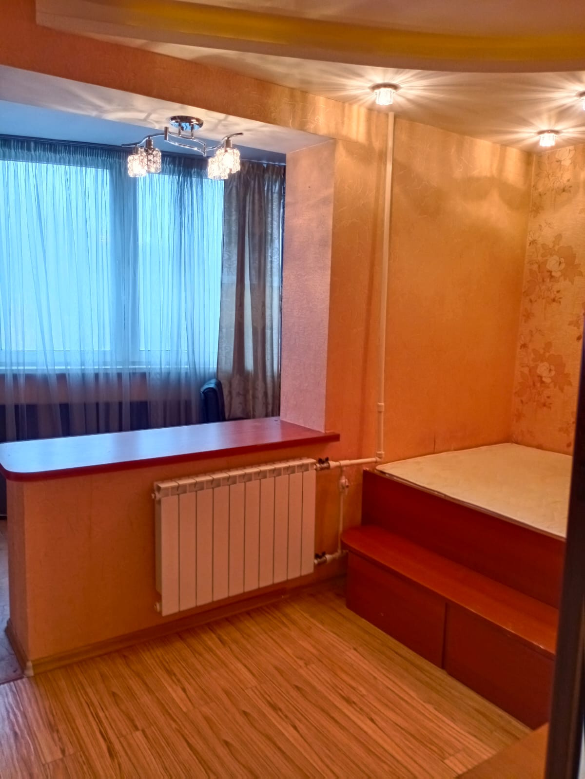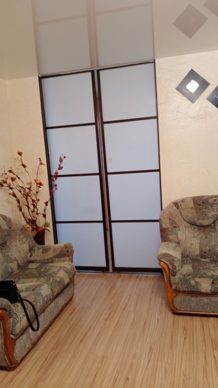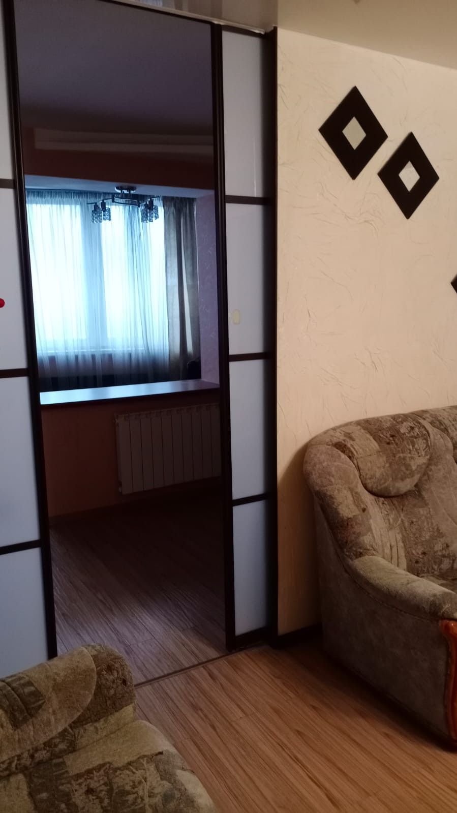 Квартира двухкомнатная: большая комната за счёт присоединения  лоджии и жилой площади  разделена на 2 зоны: гостиная и кабинет  со спальным местом; малая комната так же за счёт присоединения лоджии разделена на 2 зоны: гардеробная и спальная. По факту это как ТРЁХКОМНАТНАЯ  квартира.