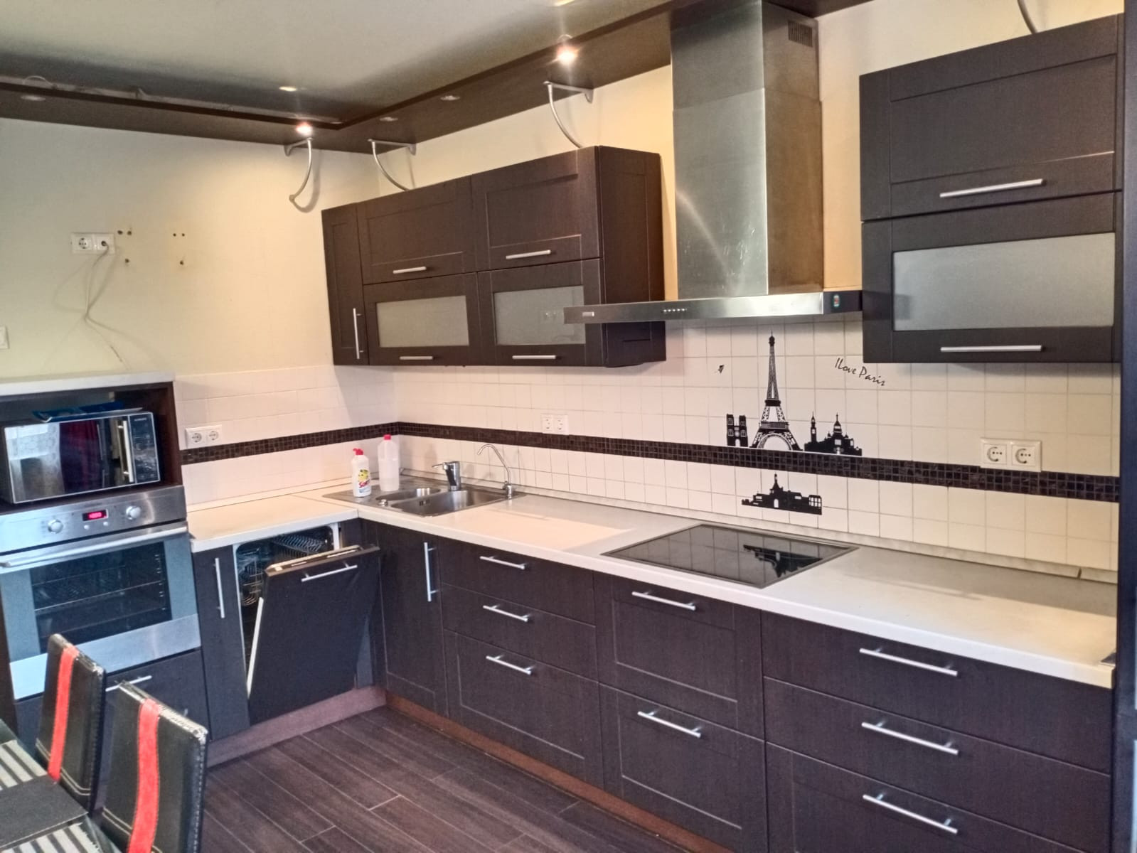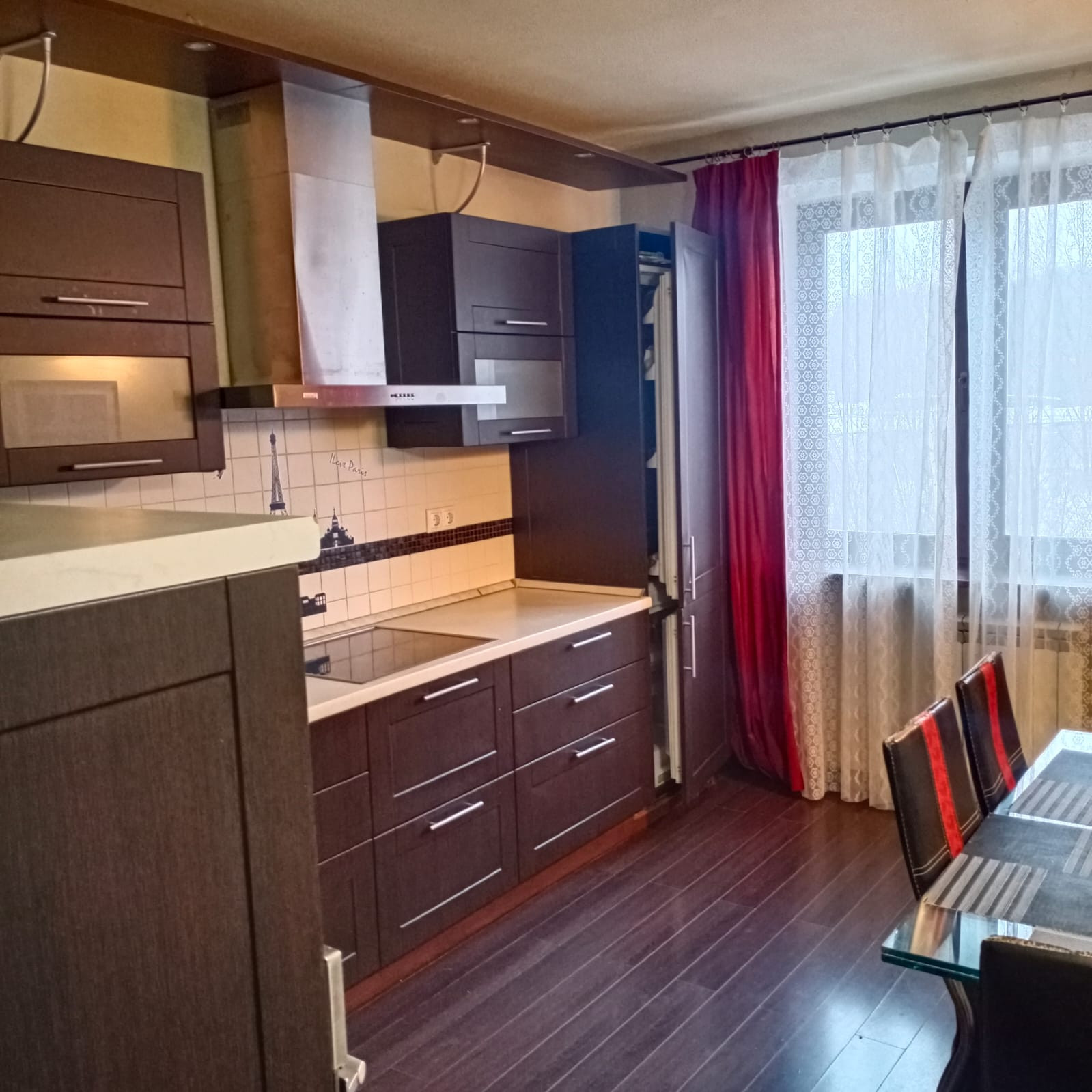 Просторная  современная  кухня со встроенной  техникой: холодильник, электрическая варочная панель, посудомоечная машина, духовой шкаф.