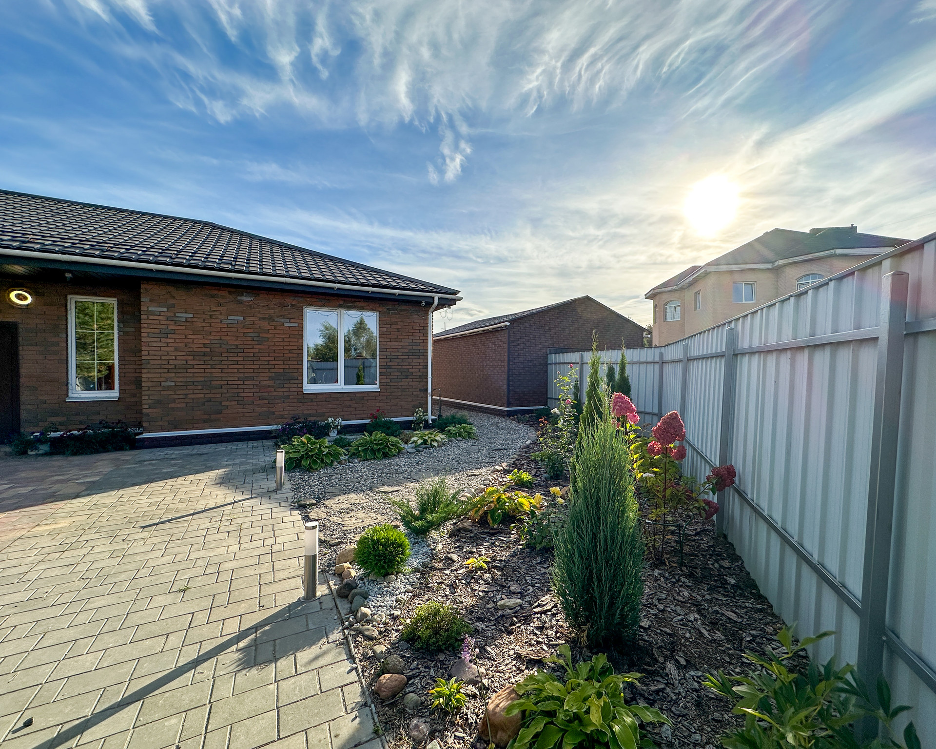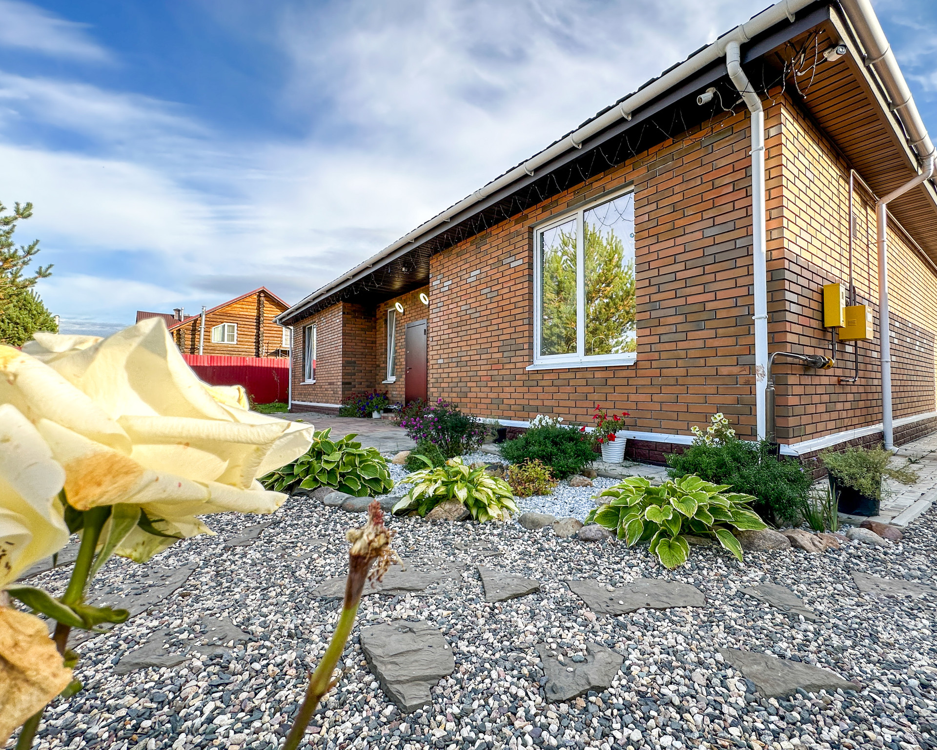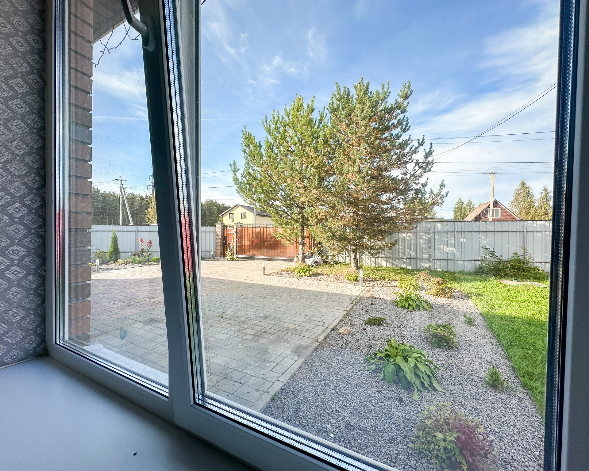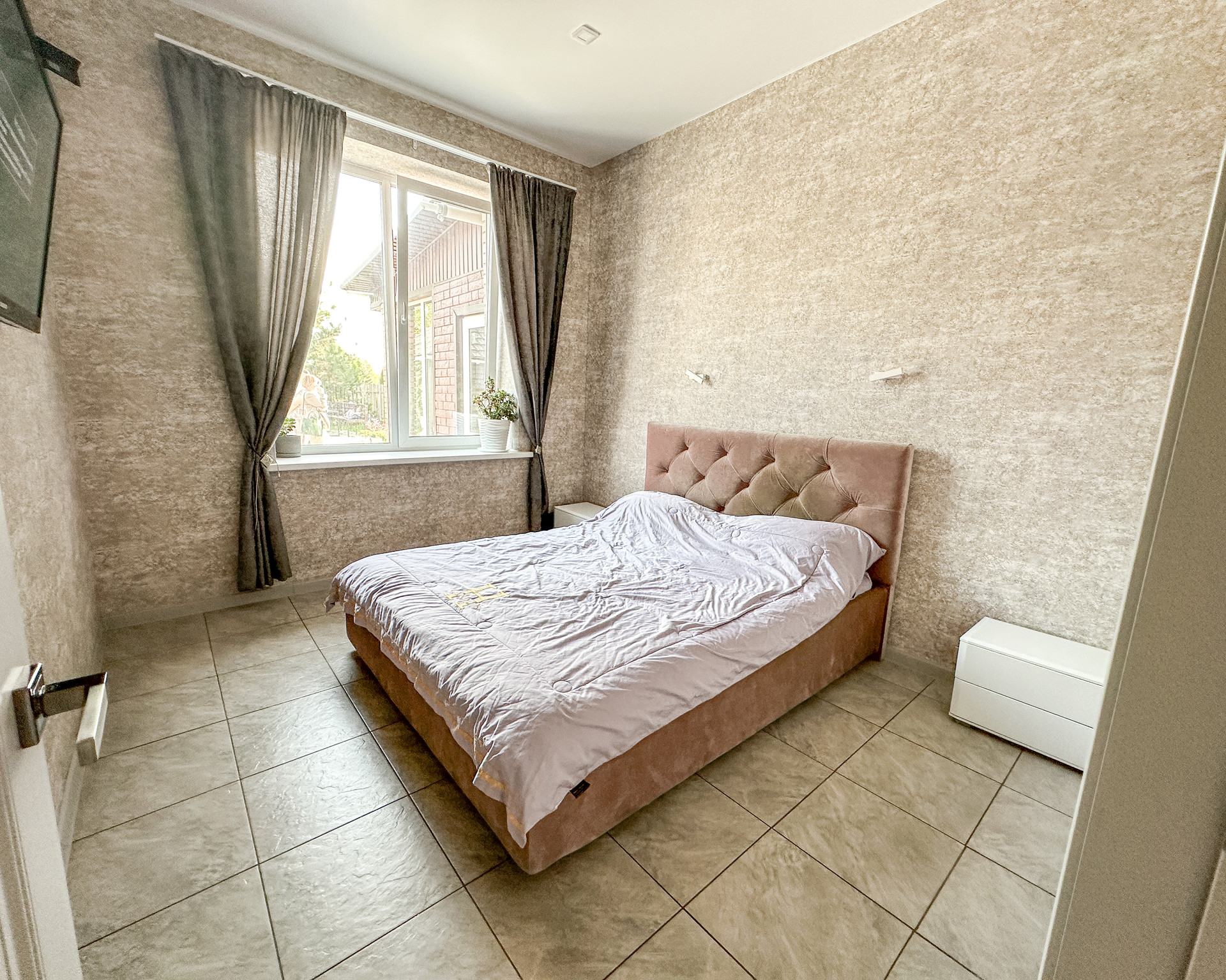 В доме три отдельные спальни, находятся в отдалении от основных помещение (гостиной, кухни, террасы -удобно, тихо), большая гостиная (27 квм) с выделенной зоной кухни (плюс 11 квм), в кухне кладовая, по всей площади дома теплый пол, плитка. Стены-дизайнерская штукатурка и обои. Ванная комната (6,5 квм), большой тепловой узел-прачечная (9 квм). Из него второй выход на веранду. Две гардеробные (6 и 3 квм), тамбур (4 квм) и холл (7 квм).