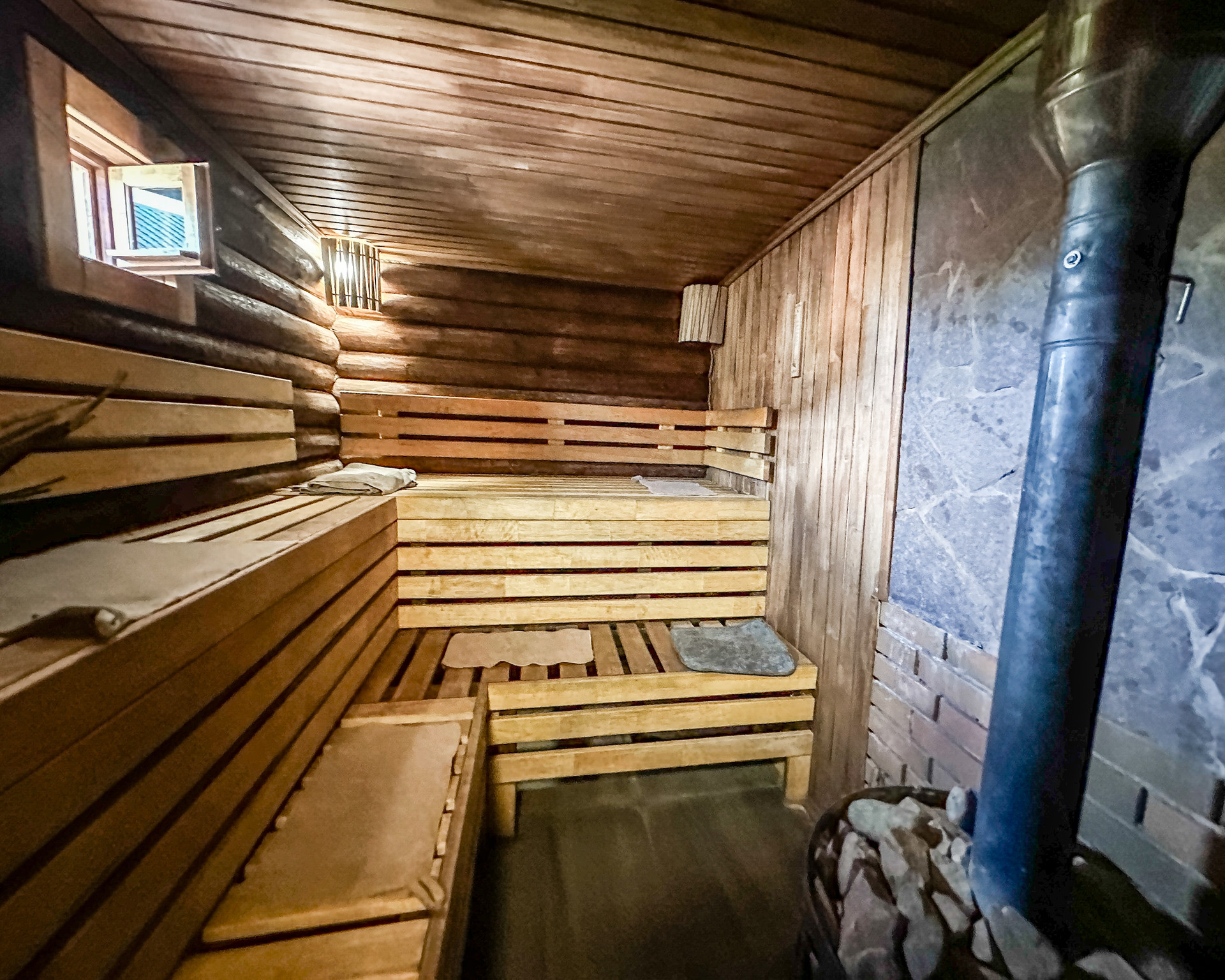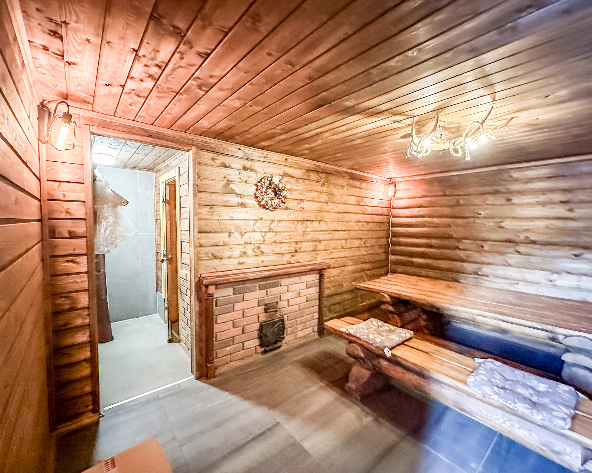 -Бревенчатая баня-сруб 6х6 метров (в бане система канализации (туалет), бойлер, печь, гостевая комната с мебелью, дизайнерские светильники)