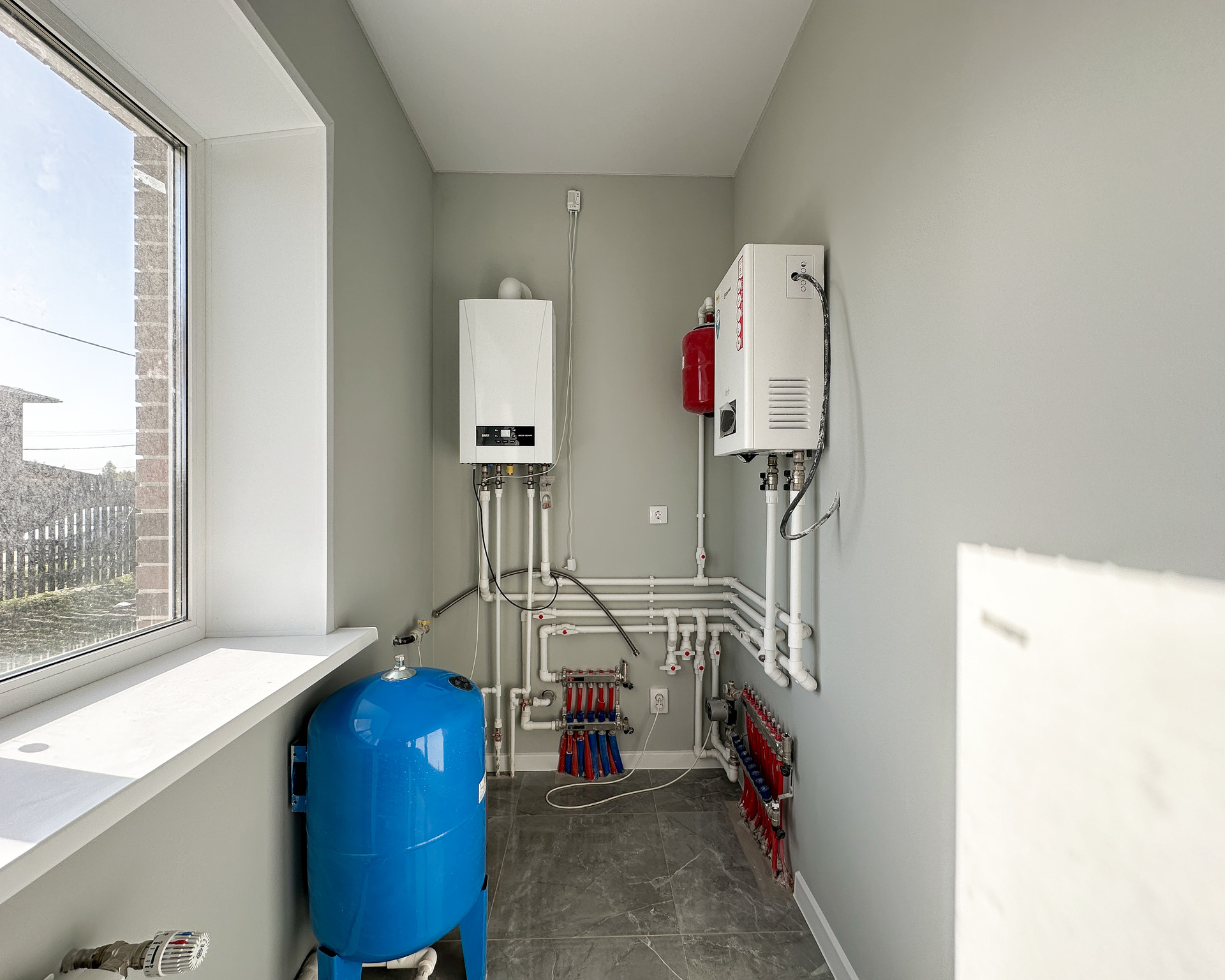 В ДОМЕ ГАЗ (установлены газовый котел BAXI и резервный электрический котел TERMEX),