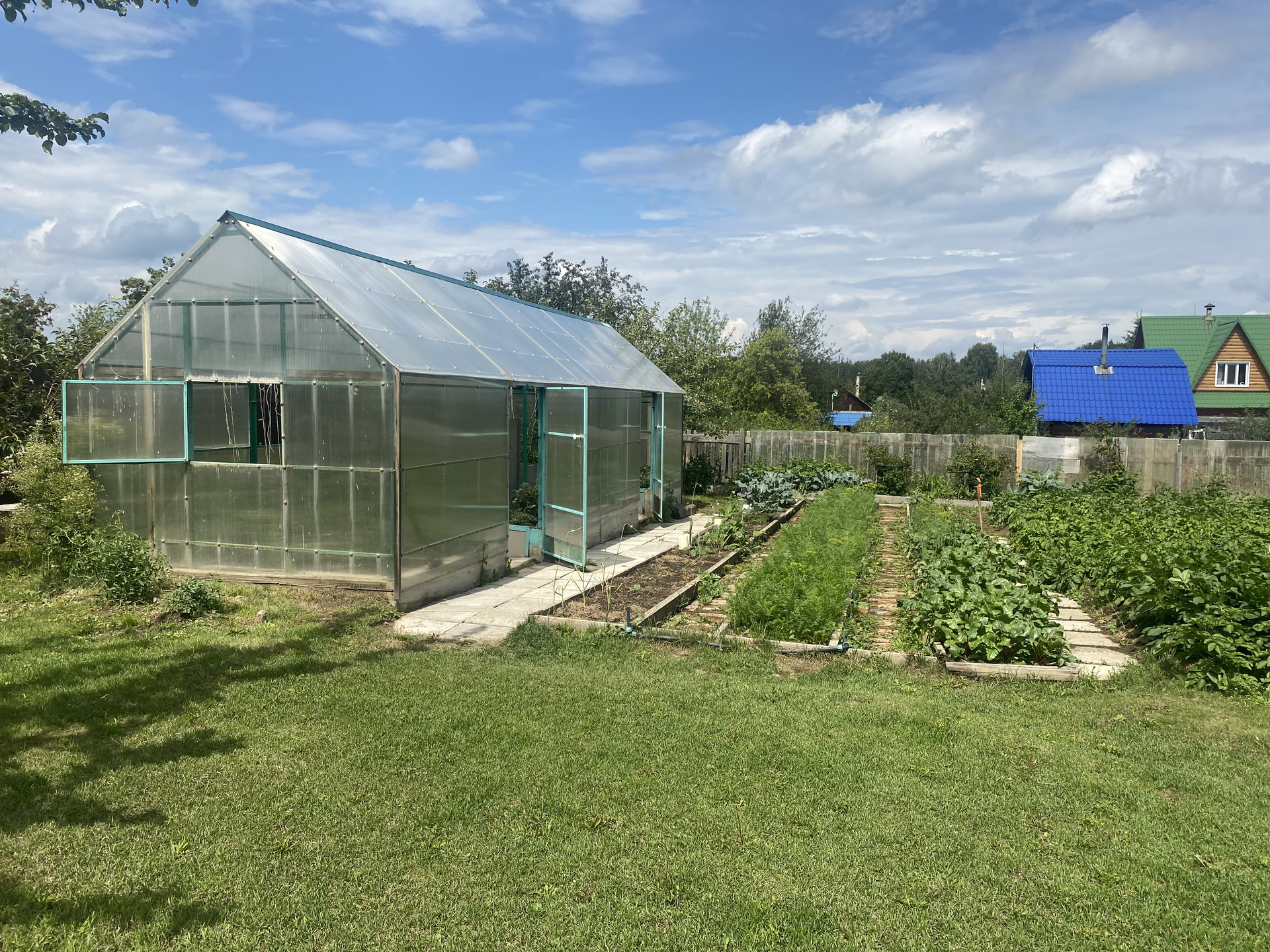 -Сам участок правильной прямоугольной формы, земля плодородная, мульчированная. Все посадки: деревья, кусты, ягоды. Большая капитальная теплица 2.5 на 12 м на фундаменте.