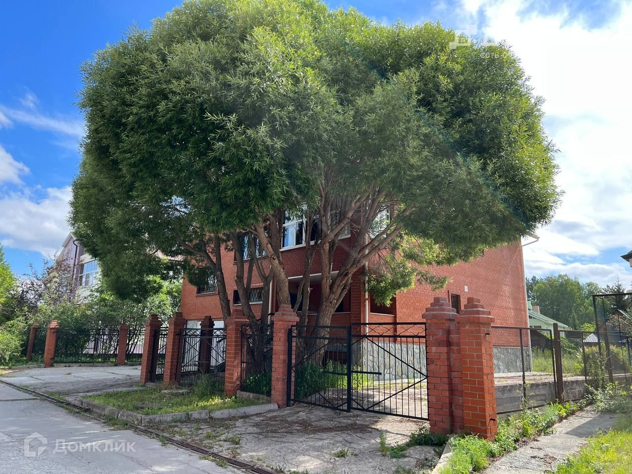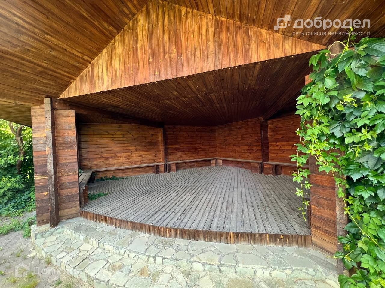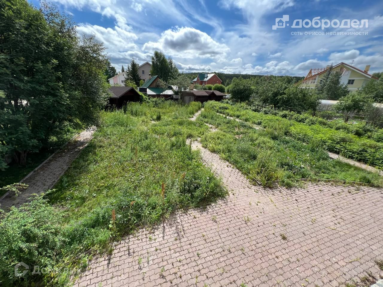 На участке беседка, колодец, вымощенные дорожки из плитки, освещение.
