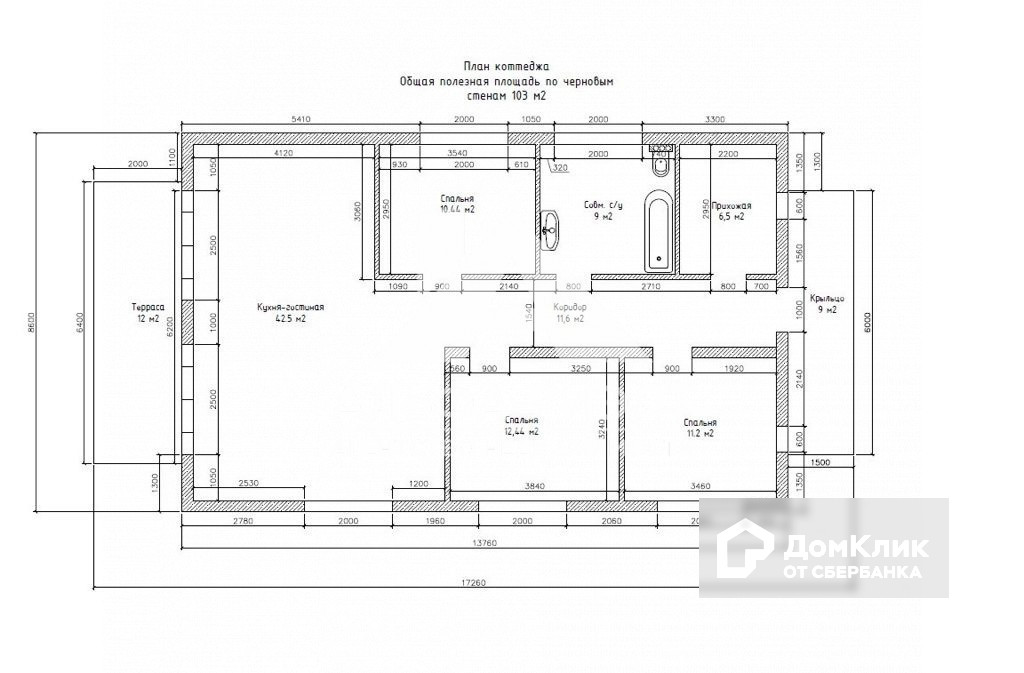 Сам дом: общая площадь 103 кв.метра, жилая 34,8 кв. метра (12,44+11,20+10,44), кухня-столовая 42,55 кв.метра, прихожая 6,5 кв.м., санузел совмещенный 9 кв.метров.