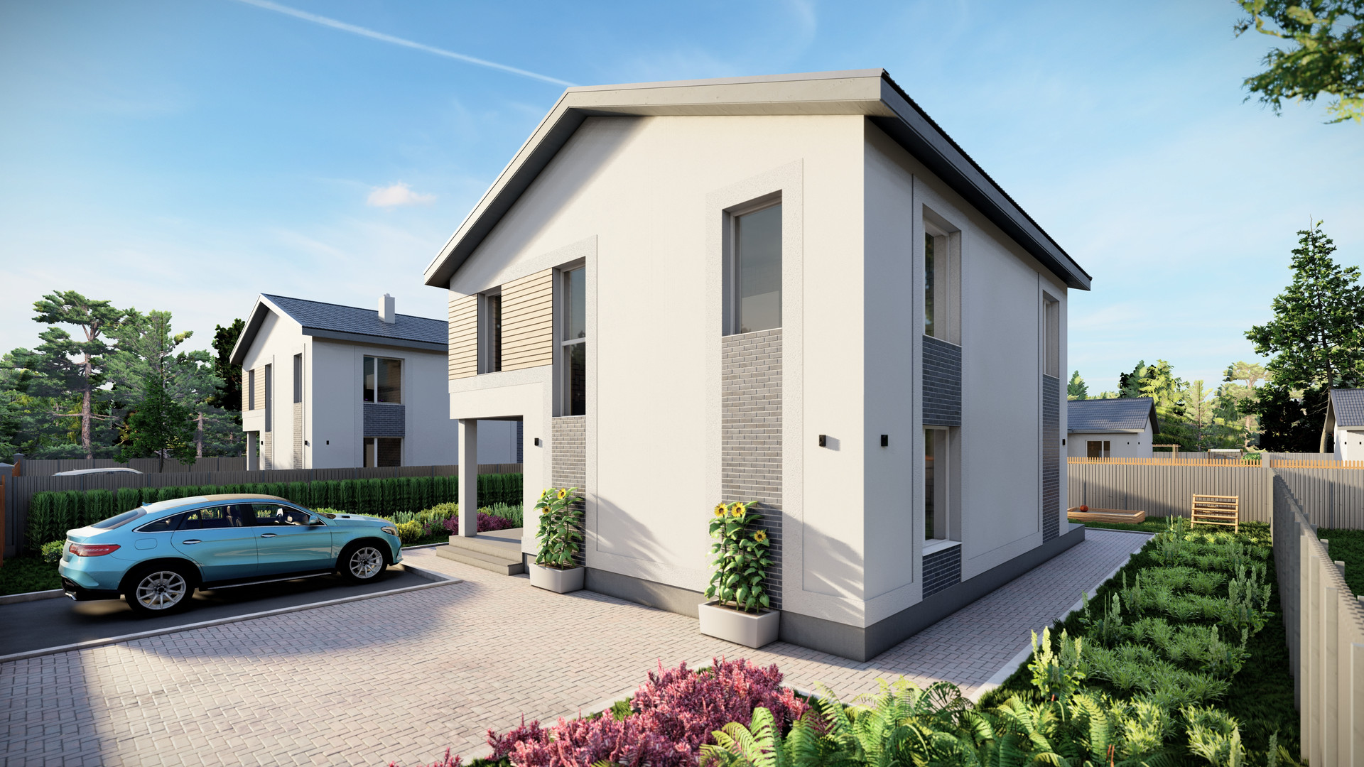 Участок огорожен с 4-х сторон забором, на каждом из участков высажены ели и елки.