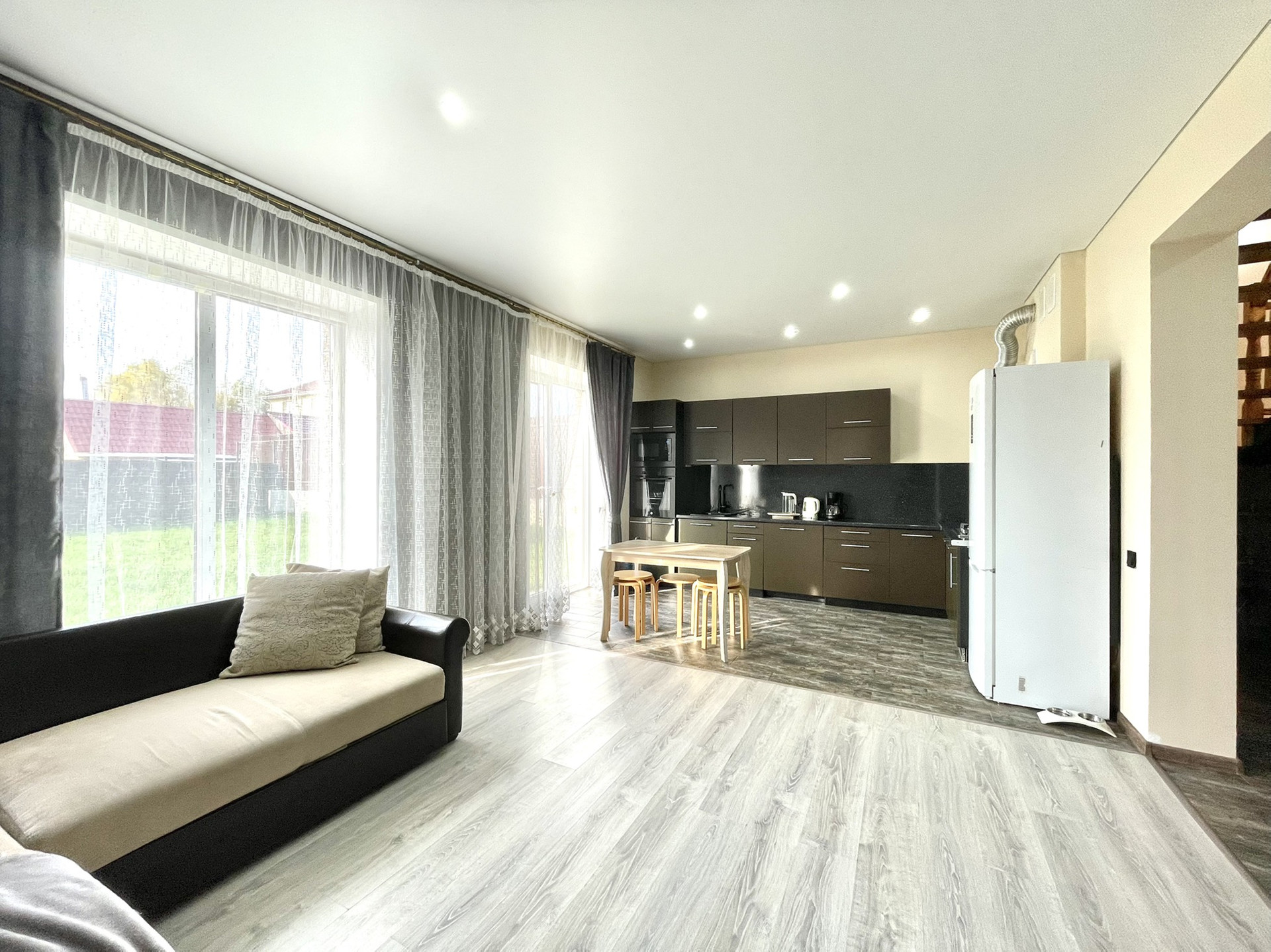 ✅Дом состоит из кухни-столовой с панорамными окнами и выходом на участок, санузла, прихожей, гардеробной( или постирочной) на первом этаже, и трех жилых комнат, коридора и санузла - на втором.