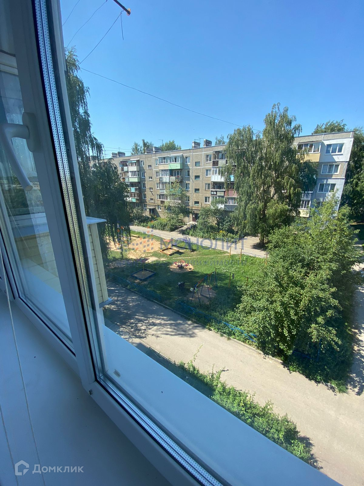 Вид из окон во двор на детскую площадку. В квартире остаётся кухонный гарнитур, мебель частично.