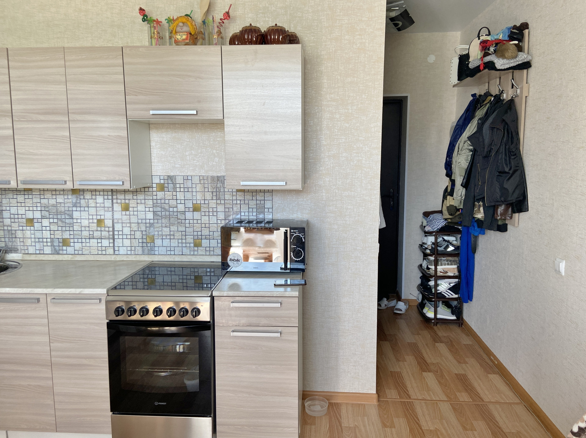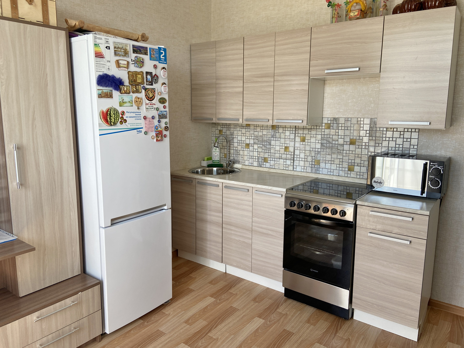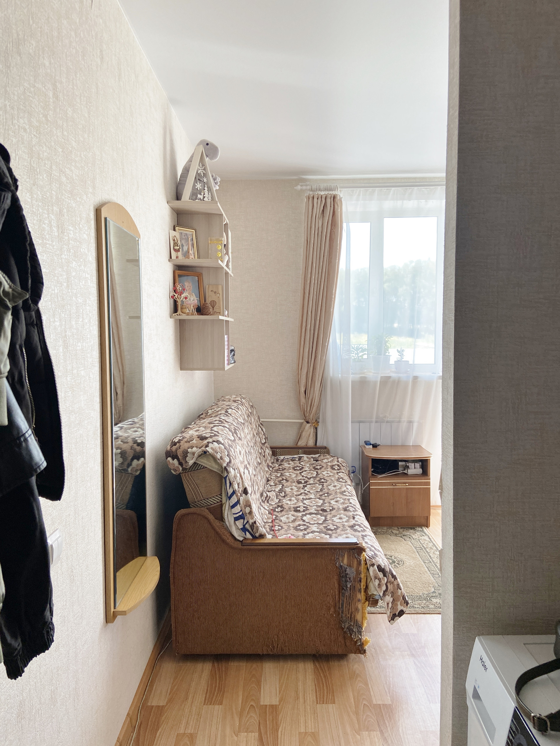 Остается кухонный гарнитур, гостиная, полки.