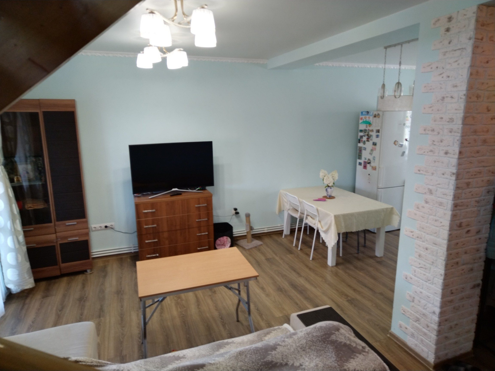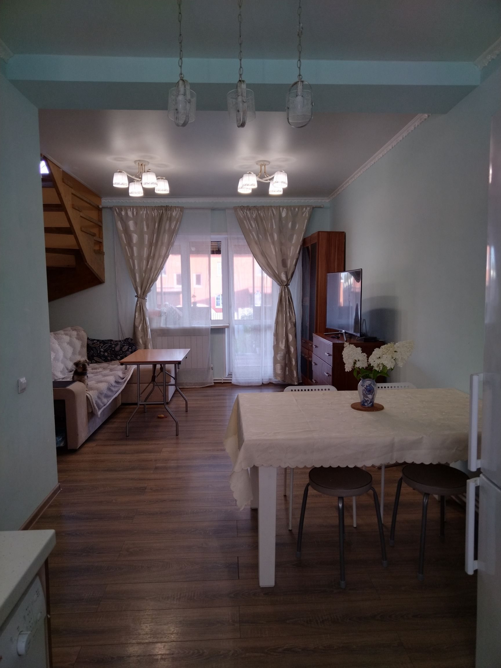 Ремонт выполнен в светлых тонах. В доме очень просторно. На второй этаж ведёт красивая, крепкая, деревянная лестница.