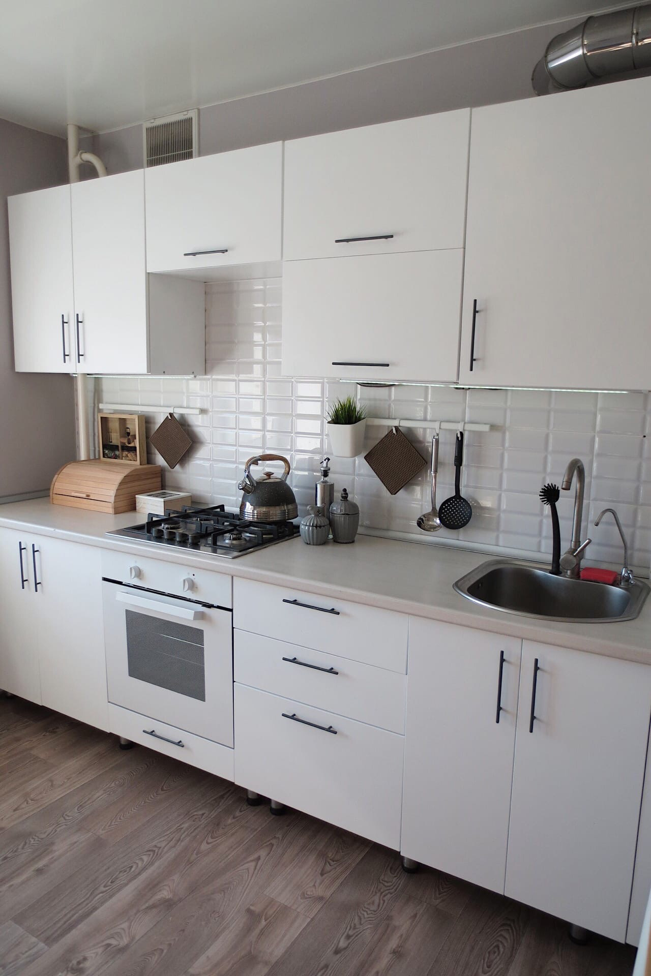 В квартире остается кухонный гарнитур, мебель в ванной и гардеробной, кондиционер.