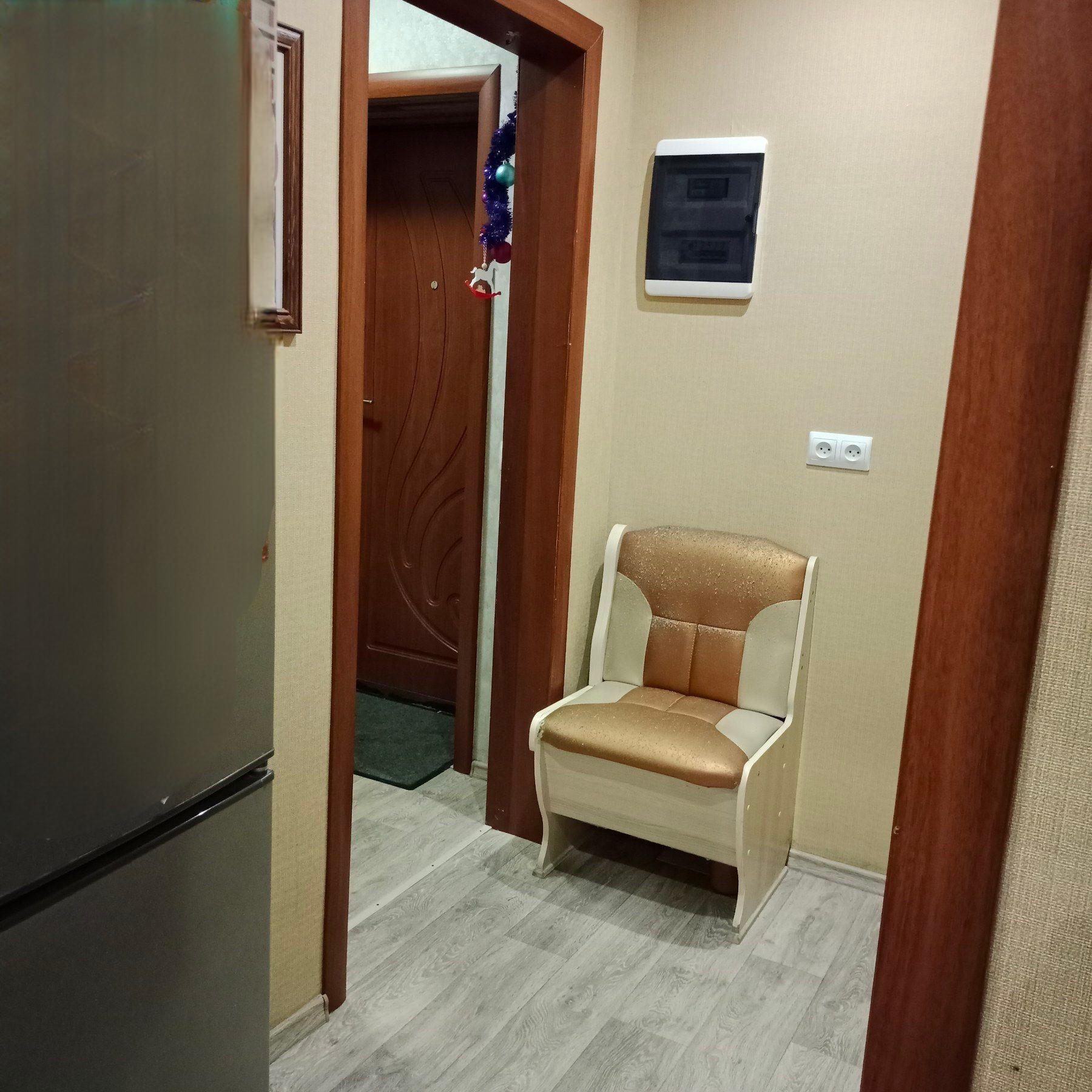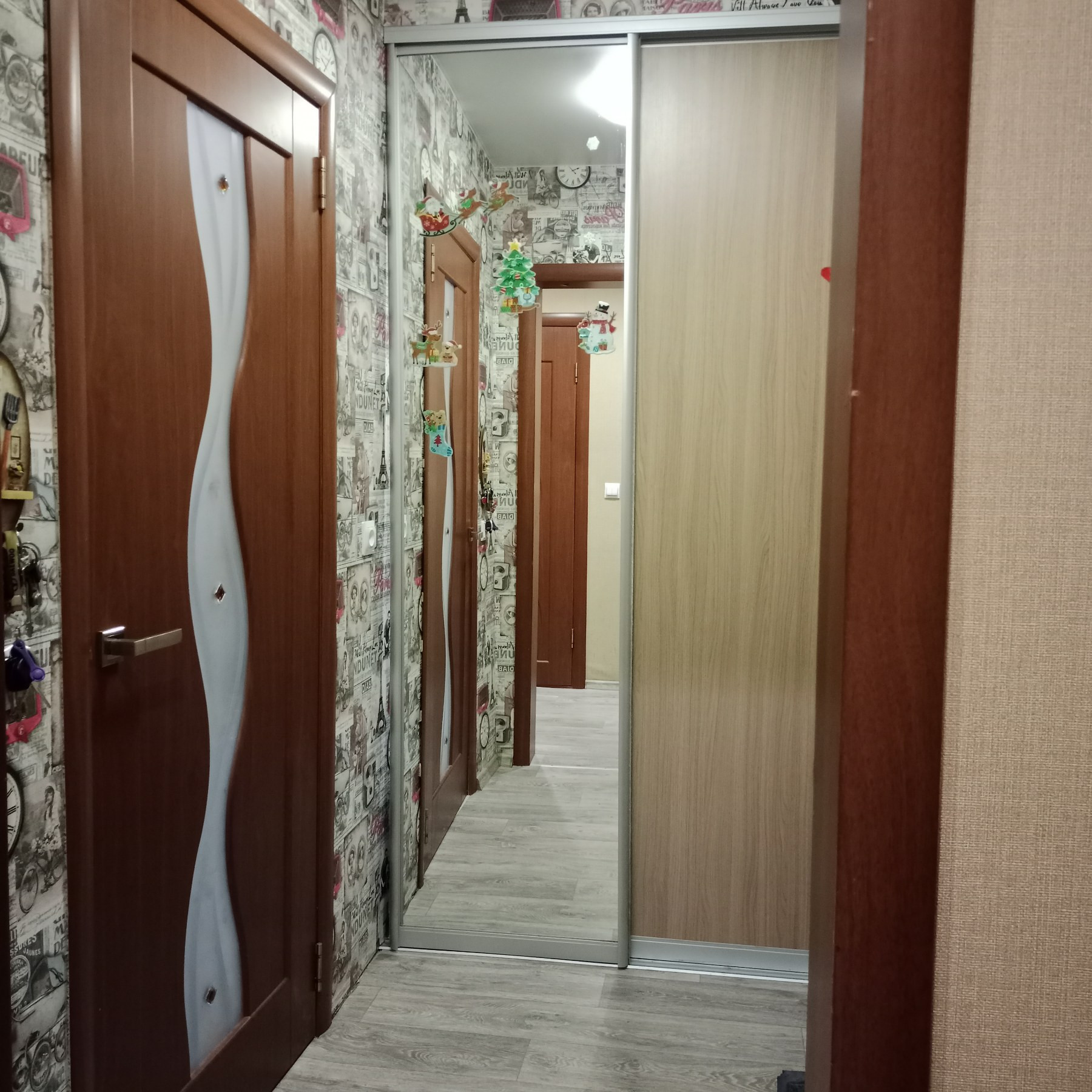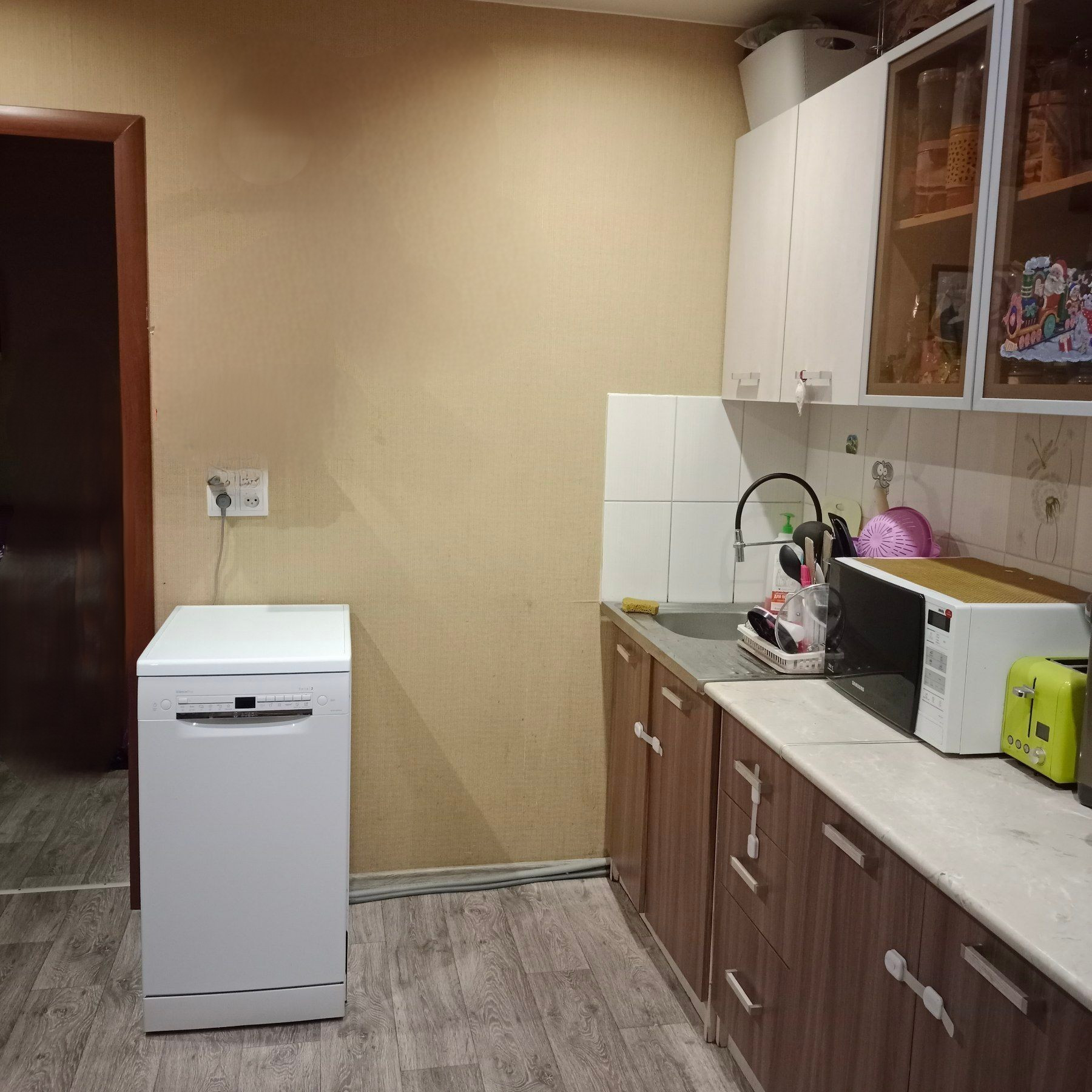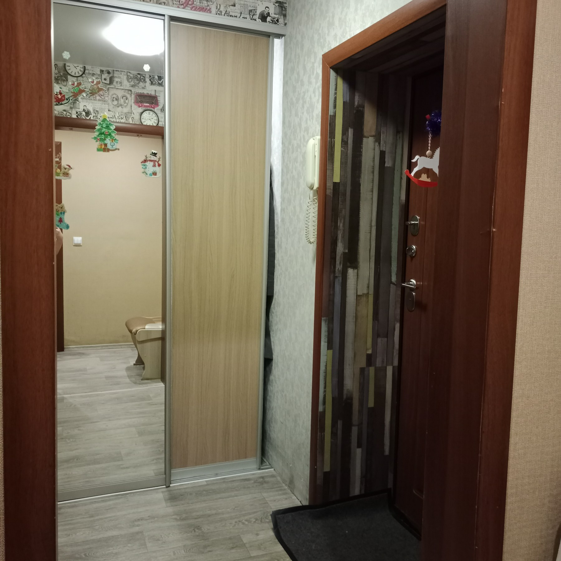 Остается кухонный гарнитур и встроенный шкаф-купе (вместительная гардеробная) в прихожей