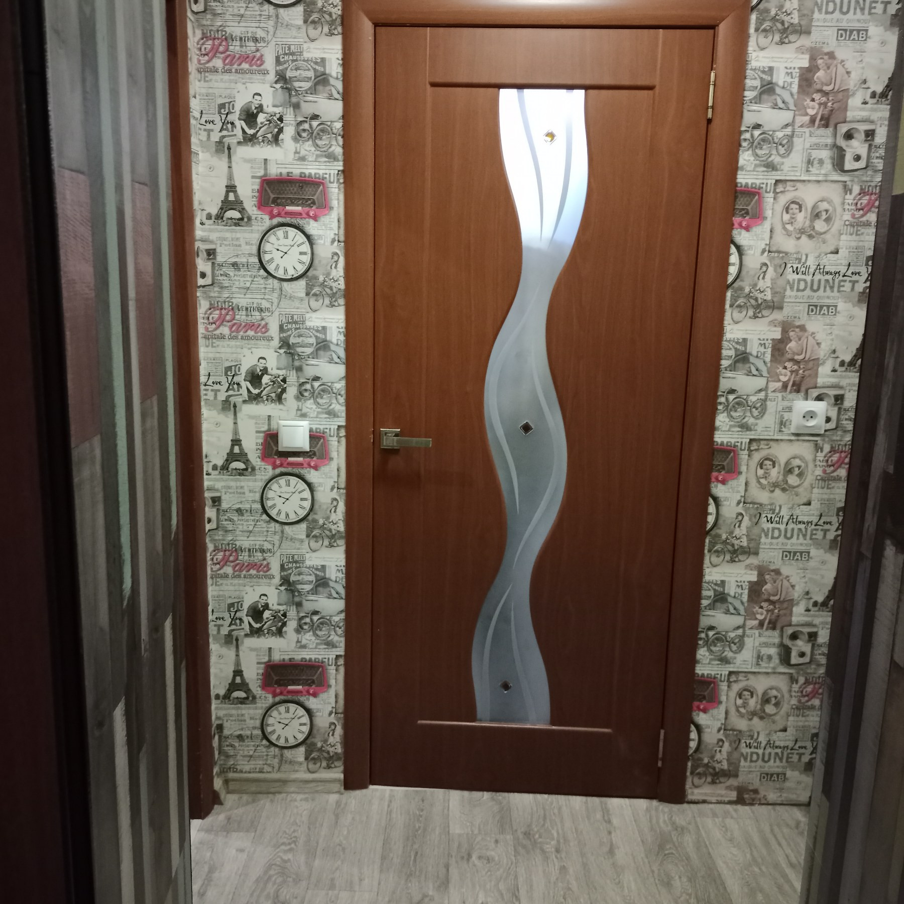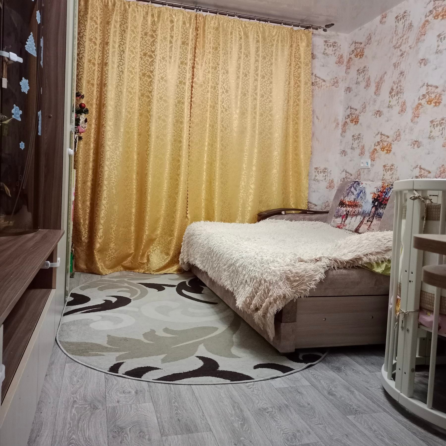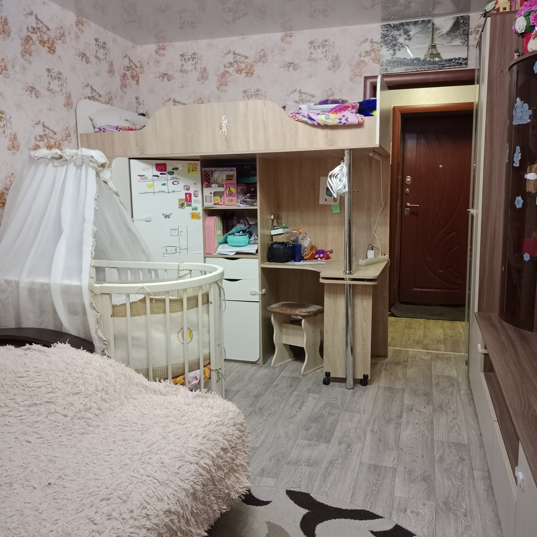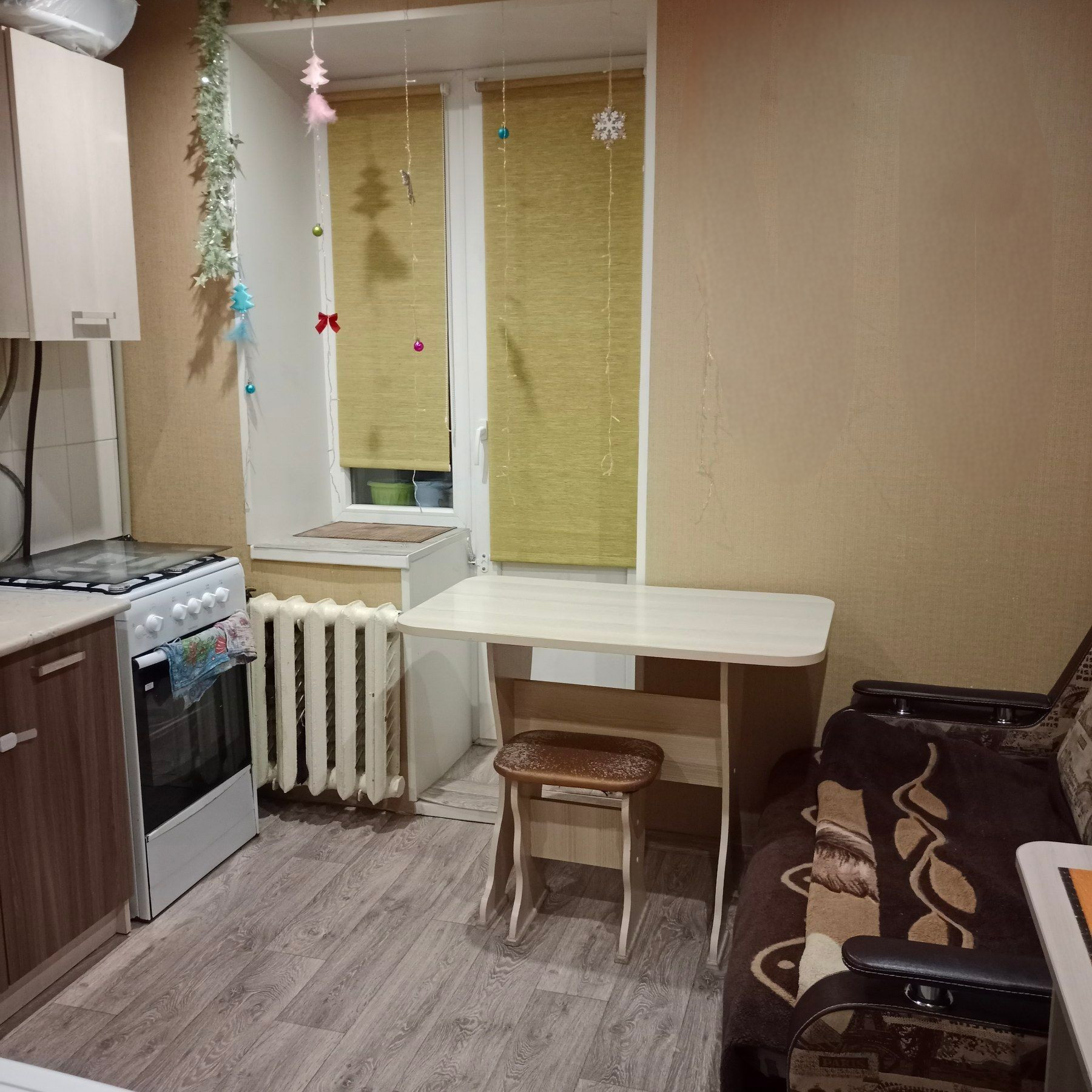 Остается кухонный гарнитур и встроенный шкаф-купе (вместительная гардеробная) в прихожей