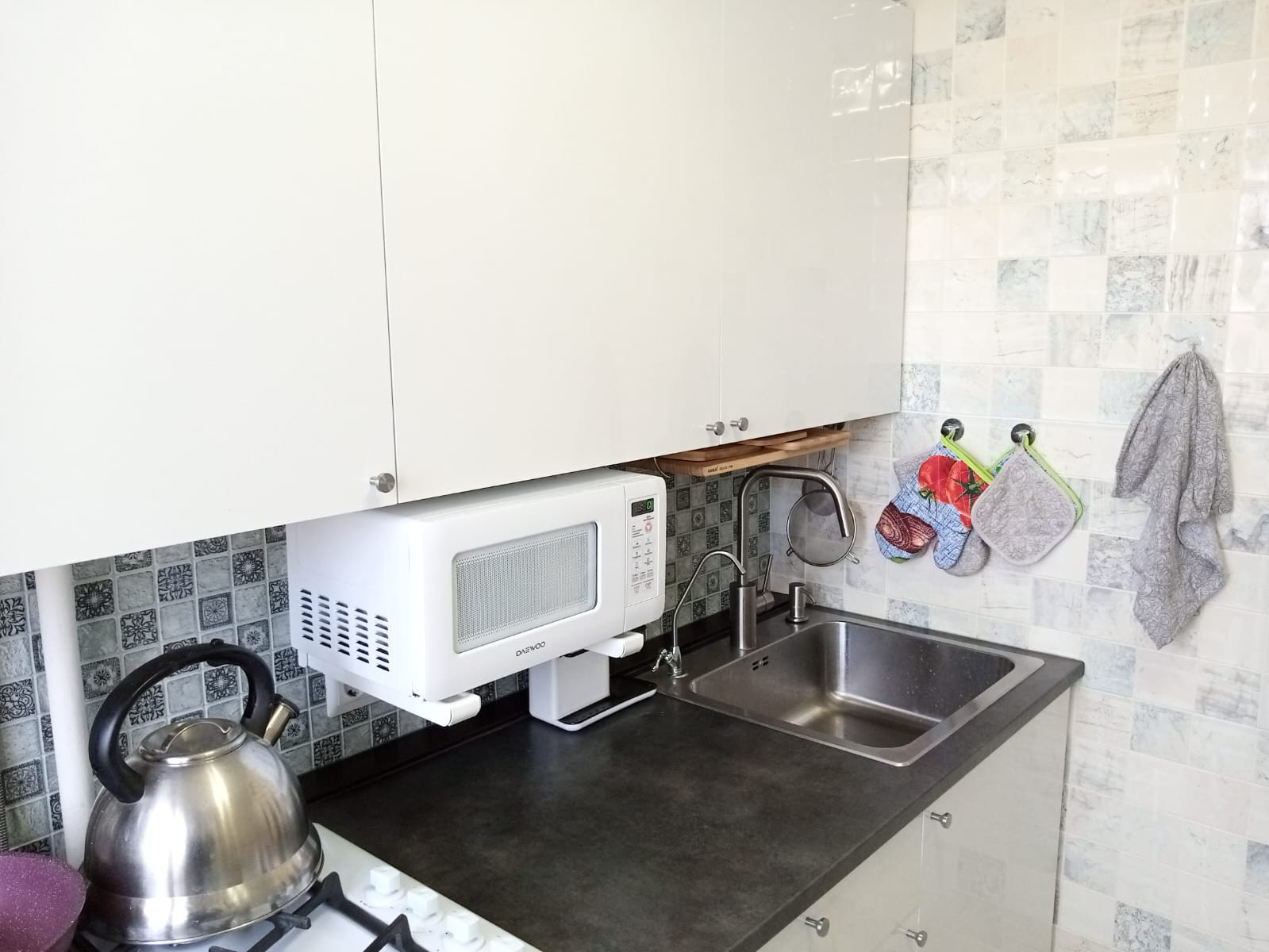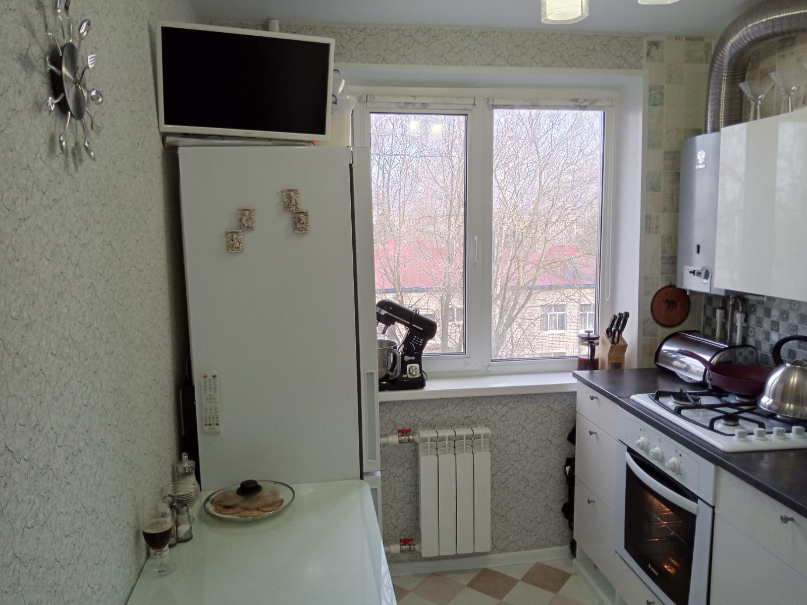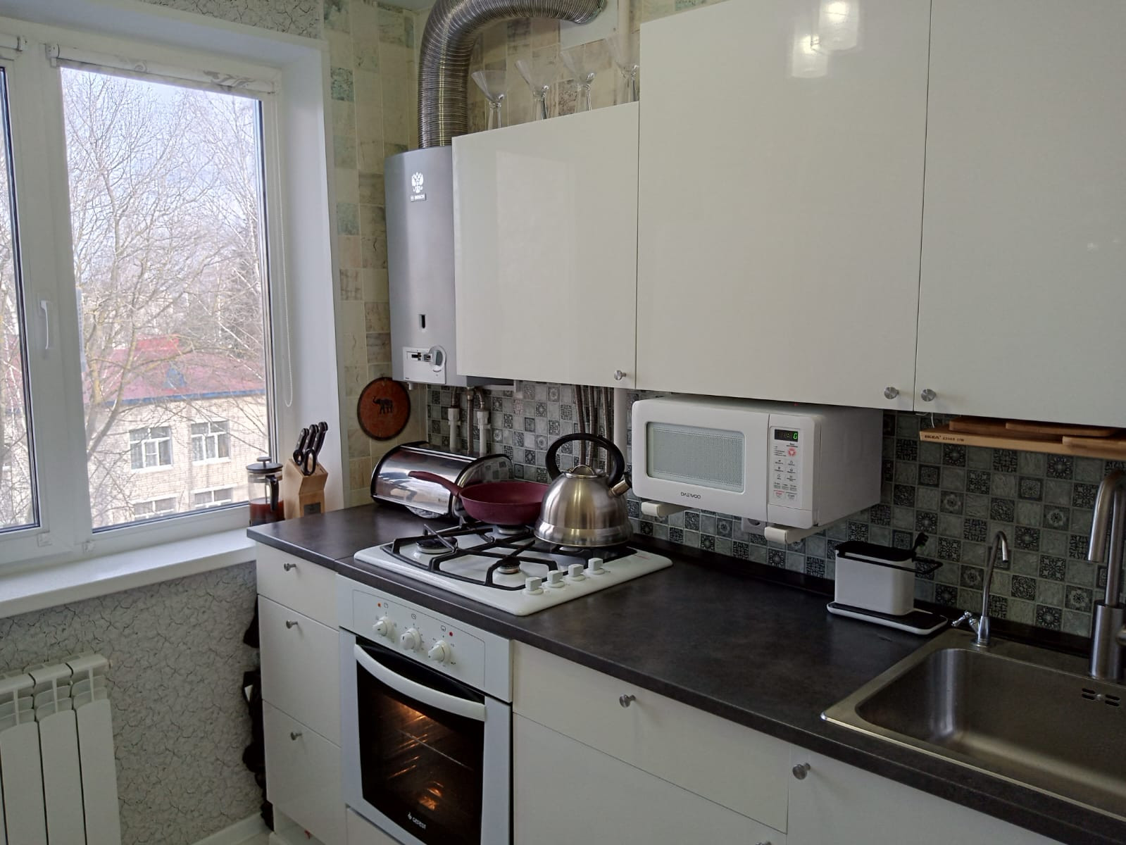 Кухня хоть и не большая, но очень удобная, новым жильцам остается качественный кухонный гарнитур с варочной панелью и духовым шкафом!