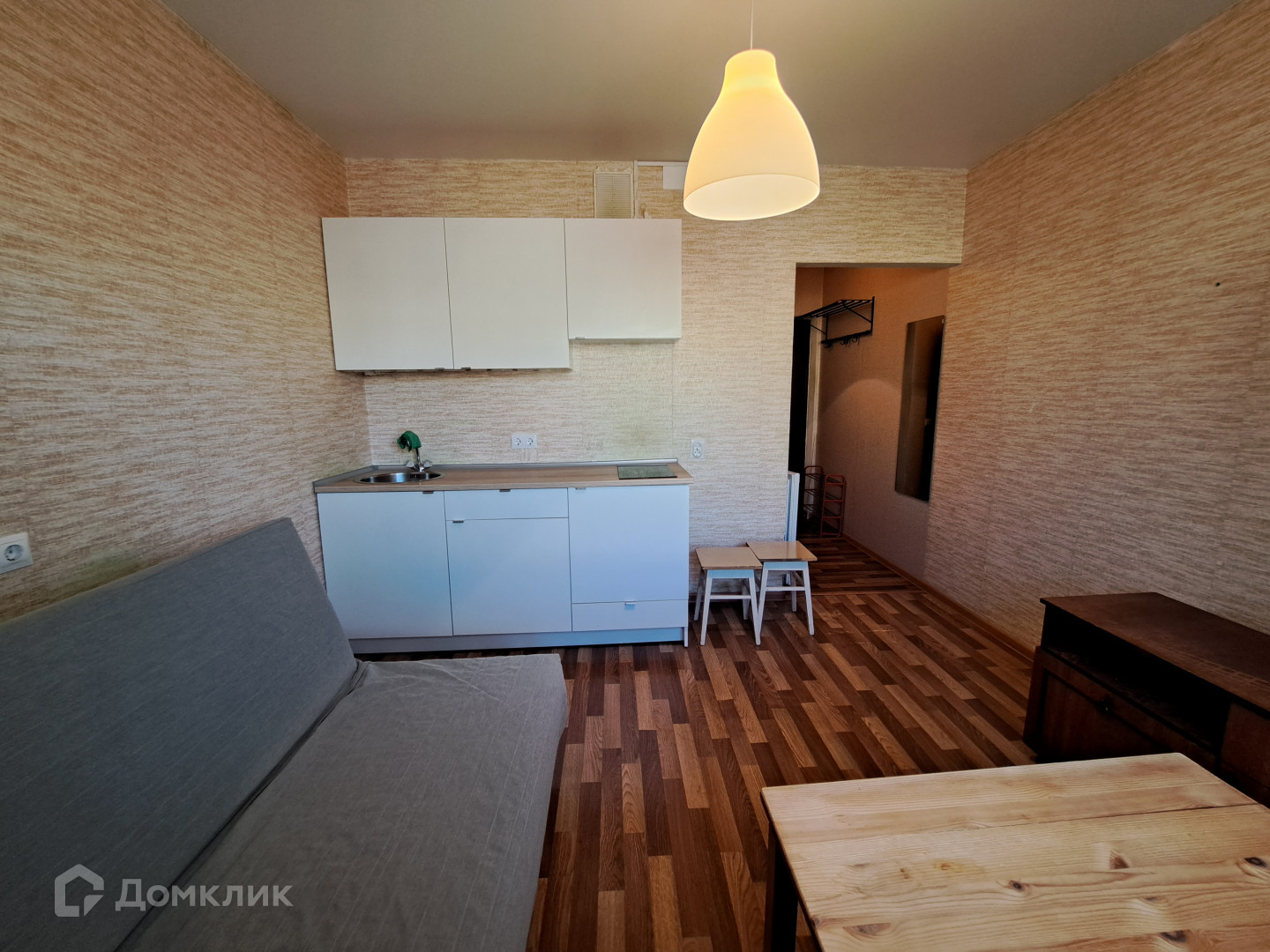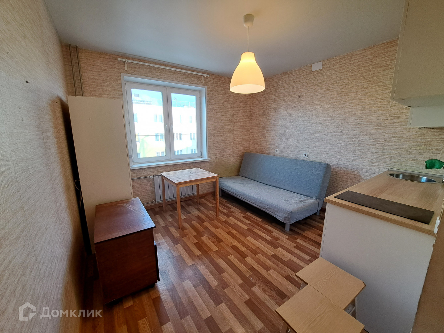 Светлая уютная студия, в новом доме на втором этаже.  Состояние хорошее. Оставляем кухонный гарнитур от Икея, варочная панель, стиральная машинка, холодильник, диван.