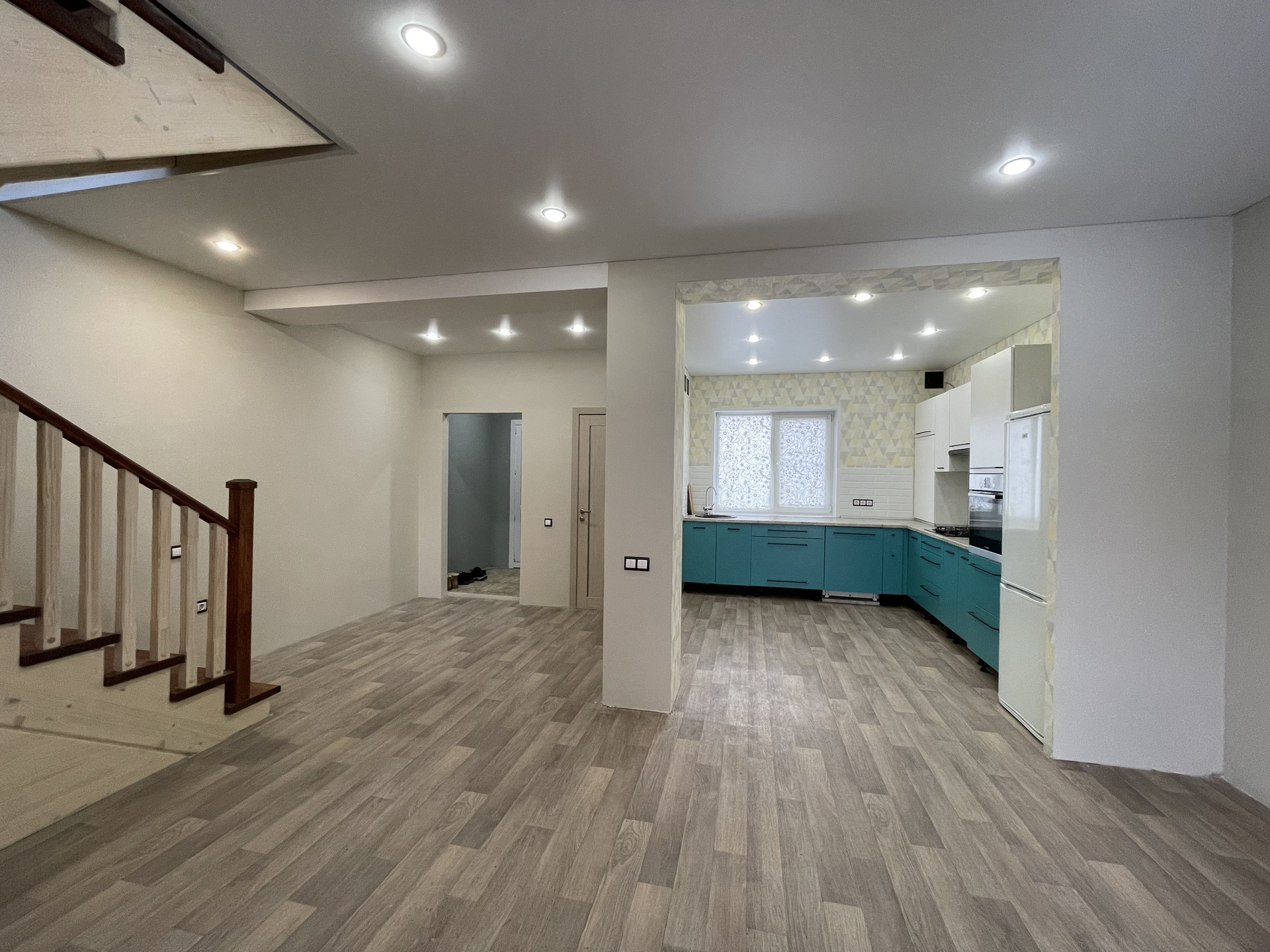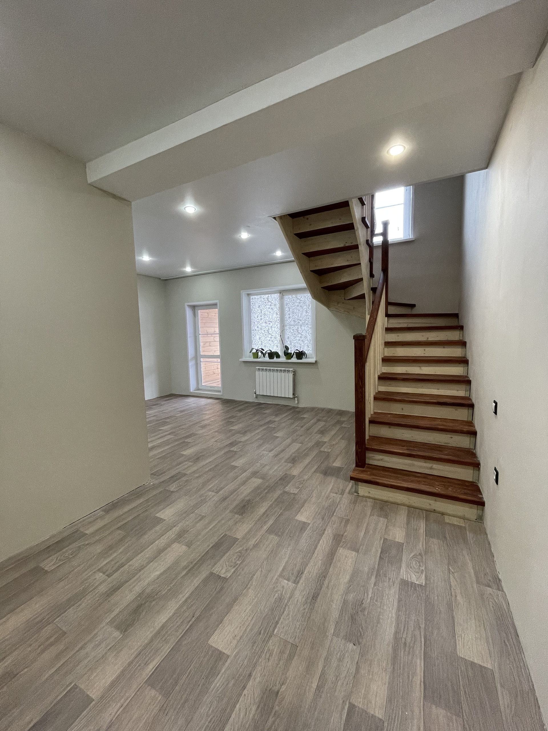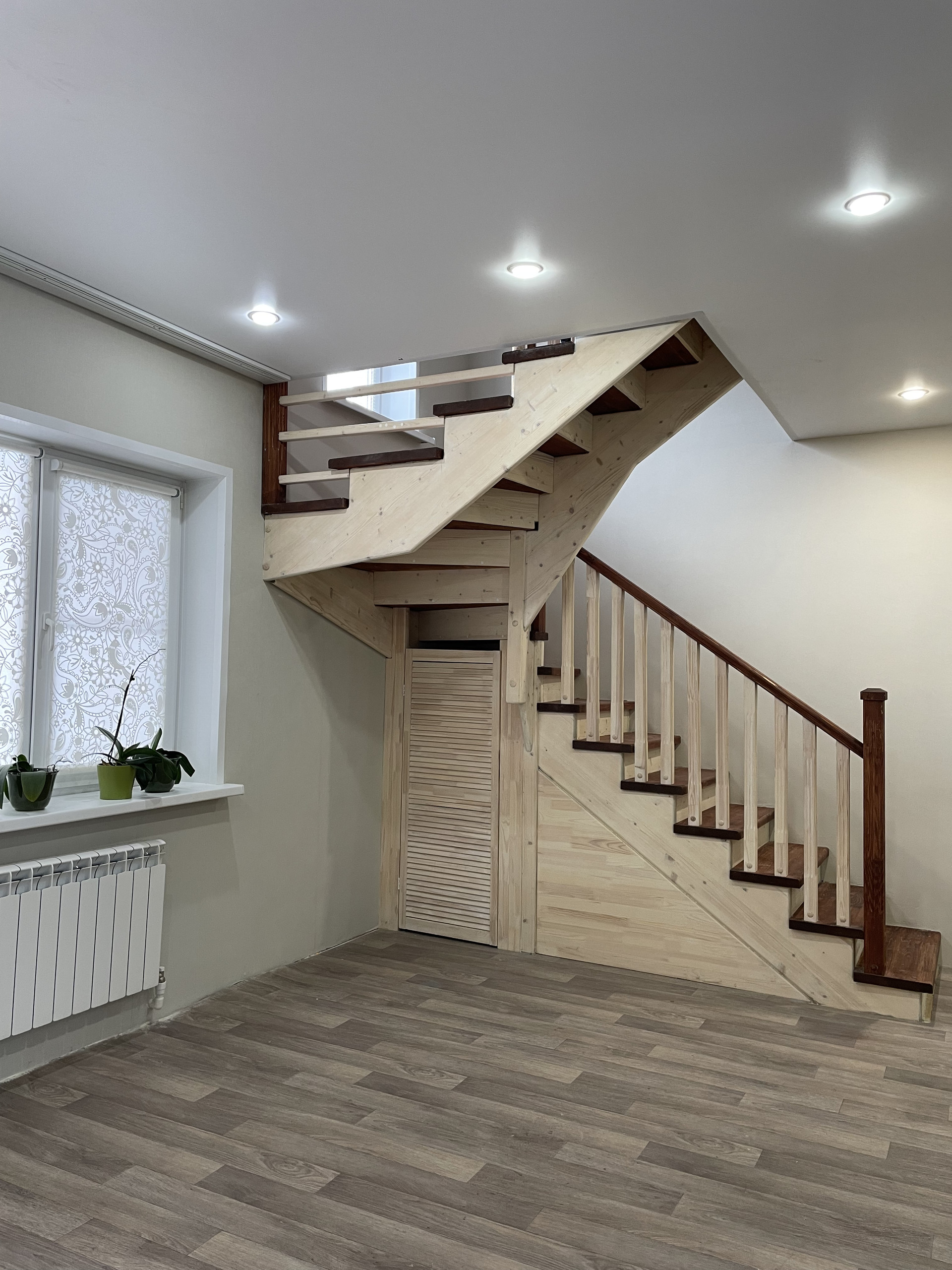 Лестница на второй этаж была полностью переделана, установлены новые ступени, подступенки, балясины, перила и столбы. Под лестницей устроена кладовая и подвал.