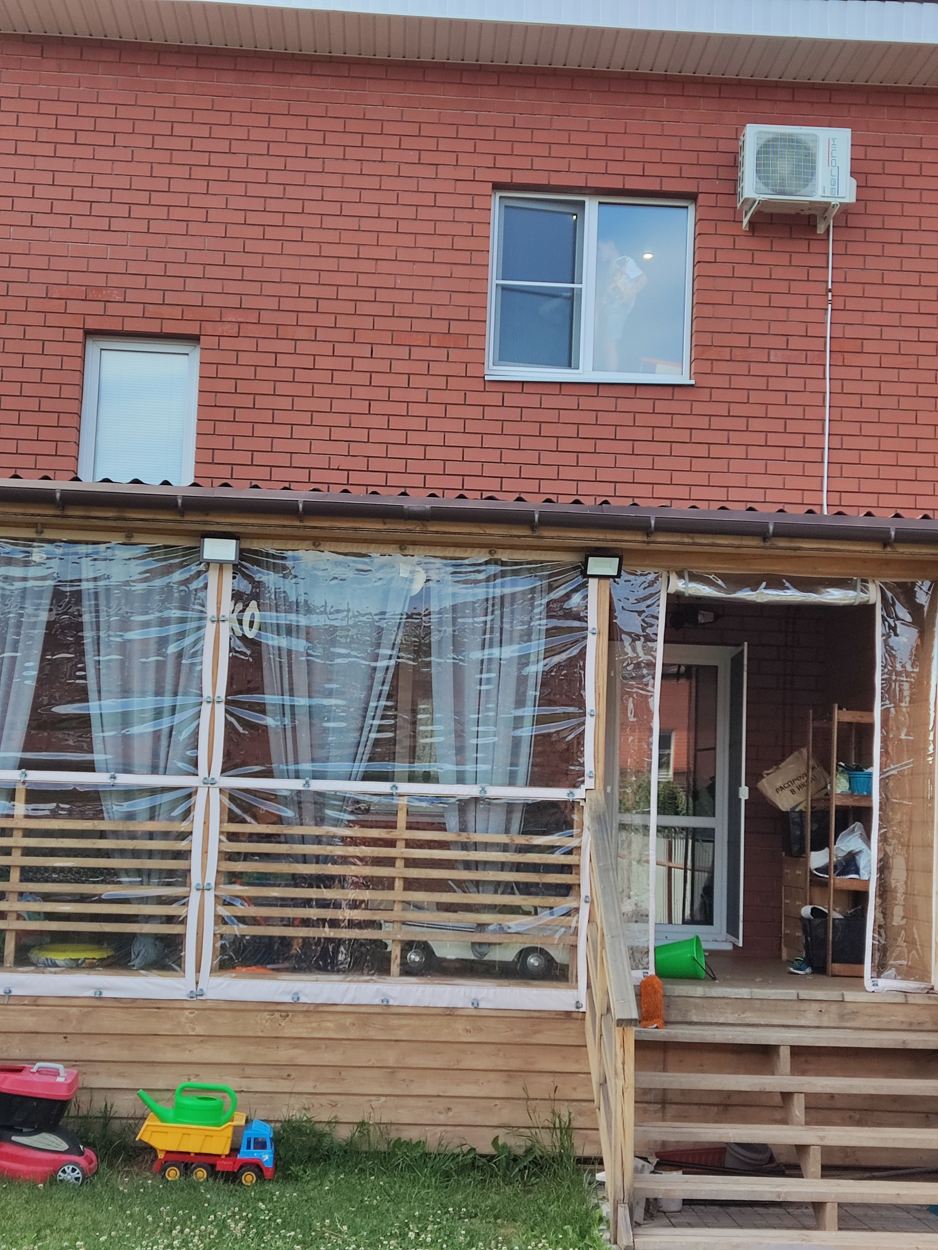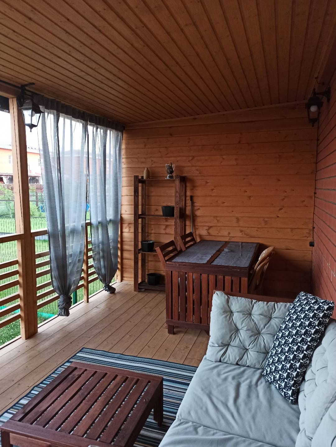 На участке установлен забор с калиткой, брусчаткой выложена площадка для мангала, посажен газон. К дому пристроена деревянная крытая веранда (6м*3м), на ней установлены мягкие окна, проведено освещение. Со стороны заднего участка солнечная, южная сторона. Летом солнце нагревает веранду, на первом этаже остается прохладно.