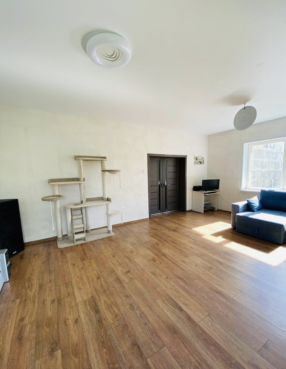 Высокие потолки, большие окна. Очень удобная планировка: кухня гостиная плюс просторная комната (возможно разделить на две комнаты). Дом тёплый и светлый.