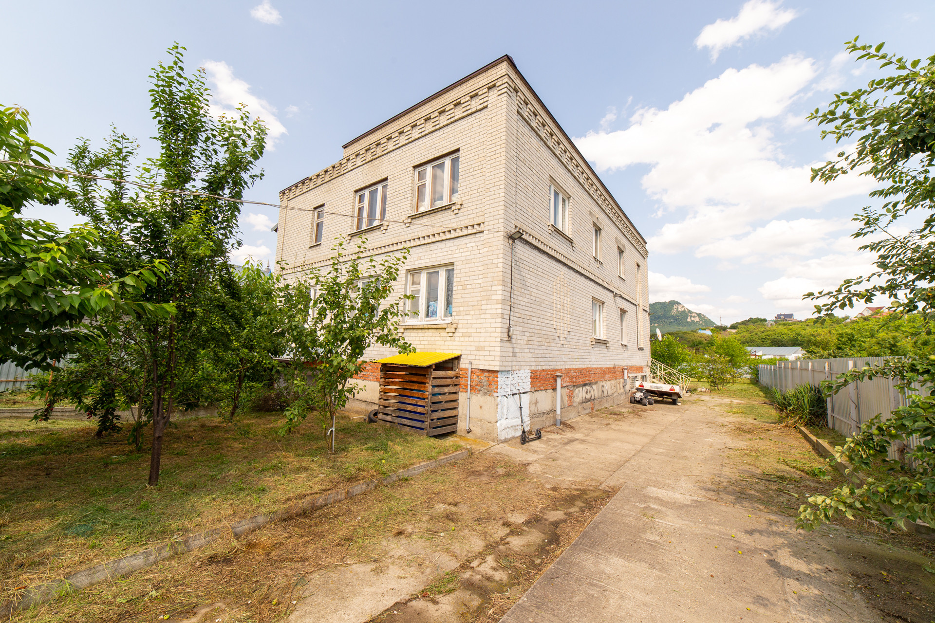 Перед домом высажен молодой фруктовый сад, только начал плодоносить, фрукты яблоки, груши, абрикосы, черешня. Сзади большой свободный участок с несколькими деревьями яблонь и шелковицей.