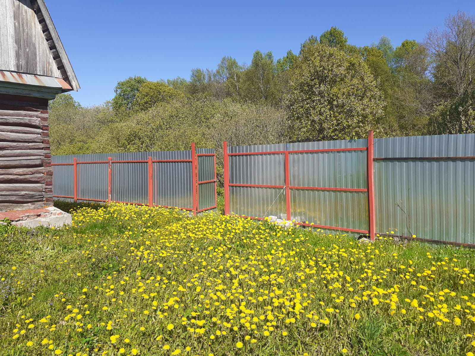 Забор установлен по фасаду и по бокам участка, есть въездные ворота. За забором красивый лес.