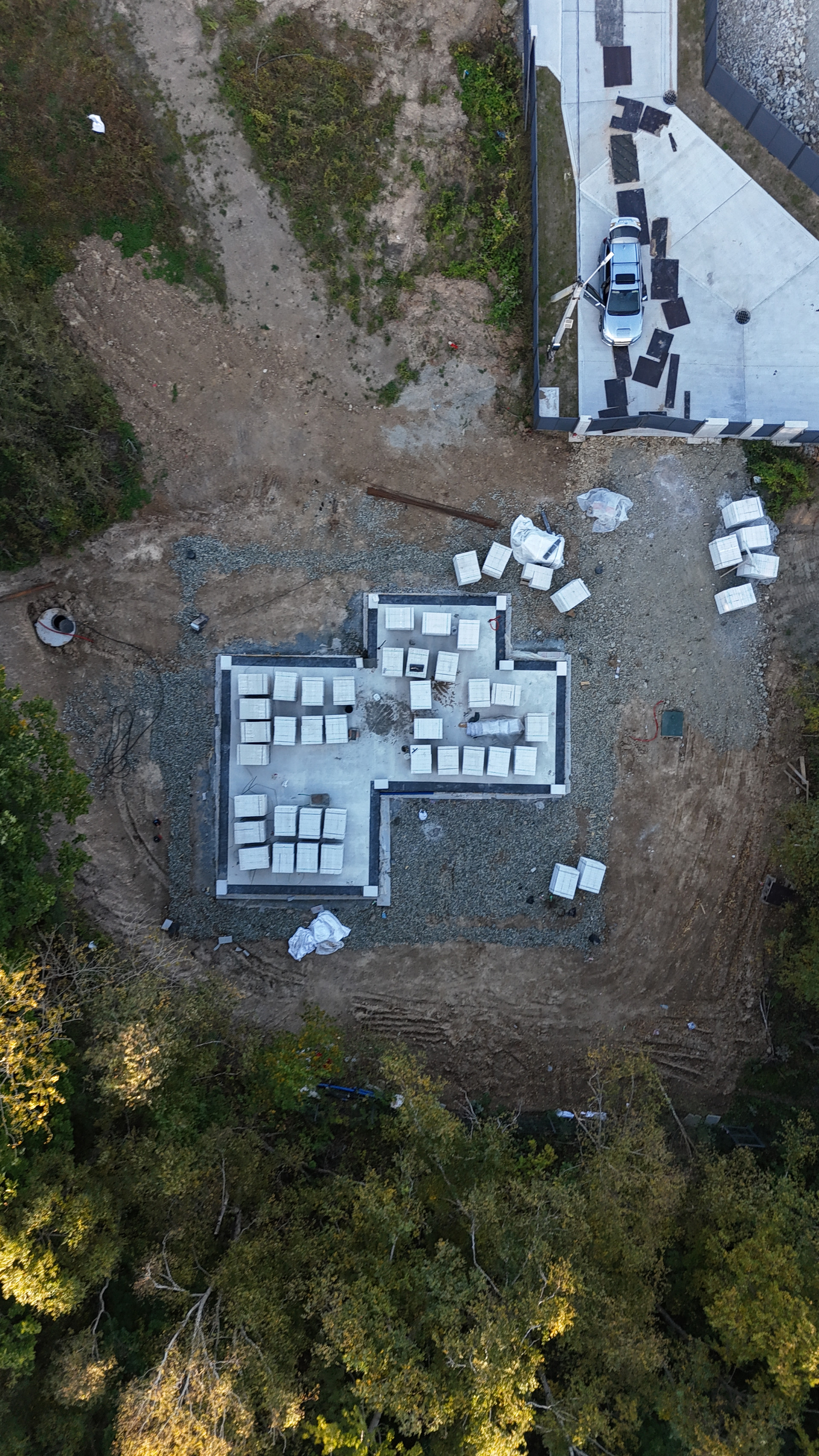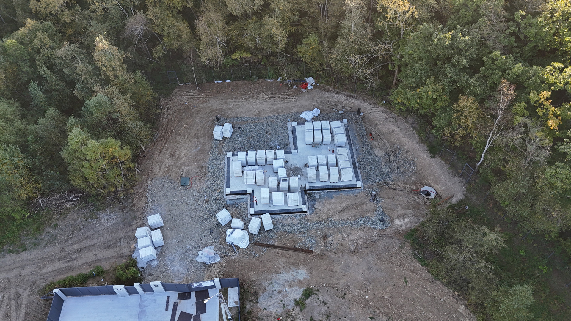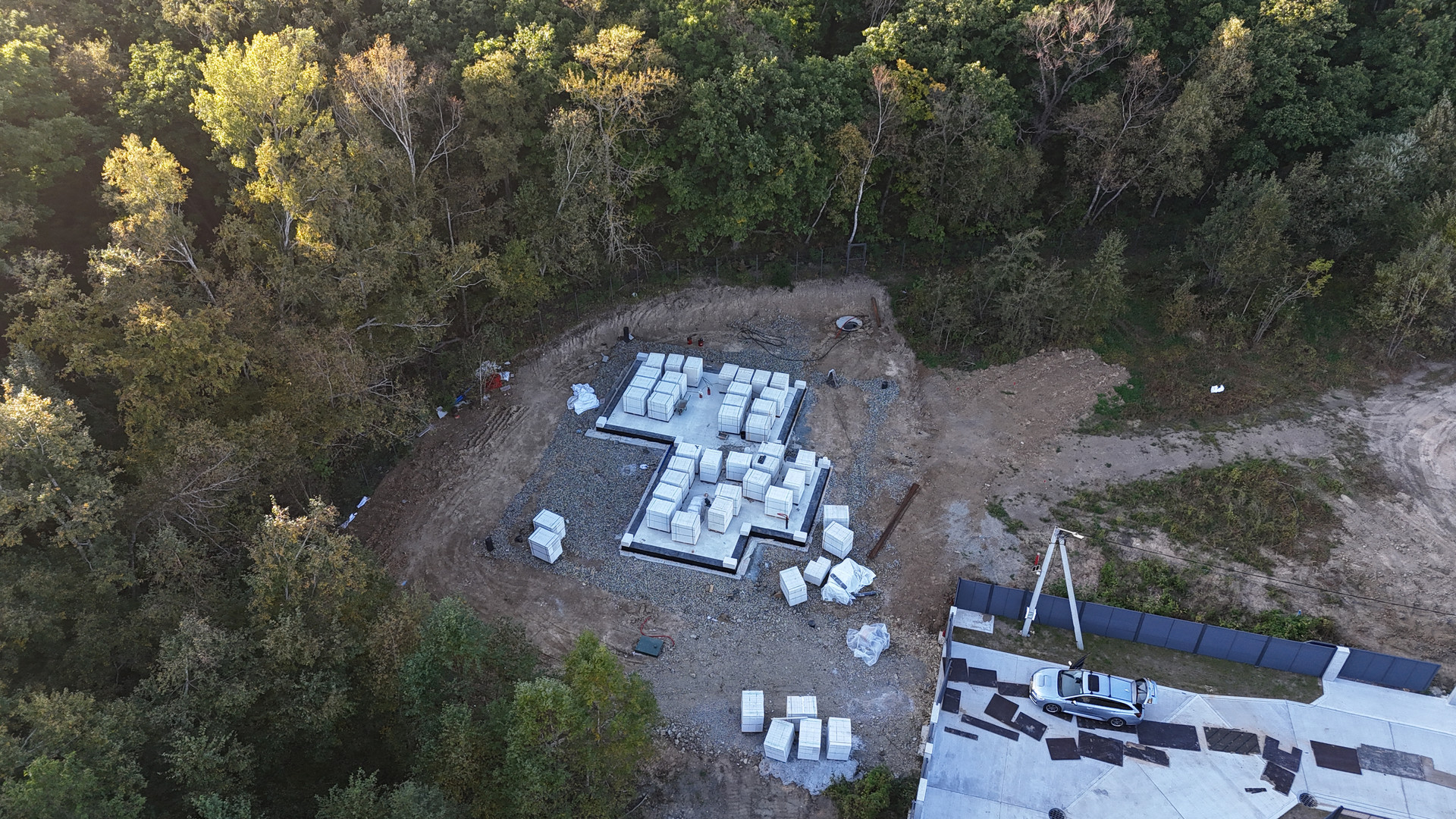 Дом сейчас на этапе активного строительства. Мы уже выполнили все исследования участка, провели анализ почвы, установили сети и залили надежный фундамент. На данный момент строятся стены, и к концу года будет готова коробка — стены, кровля, окна и двери. В зимний период планируем установить все инженерные системы и выполнить черновую отделку.