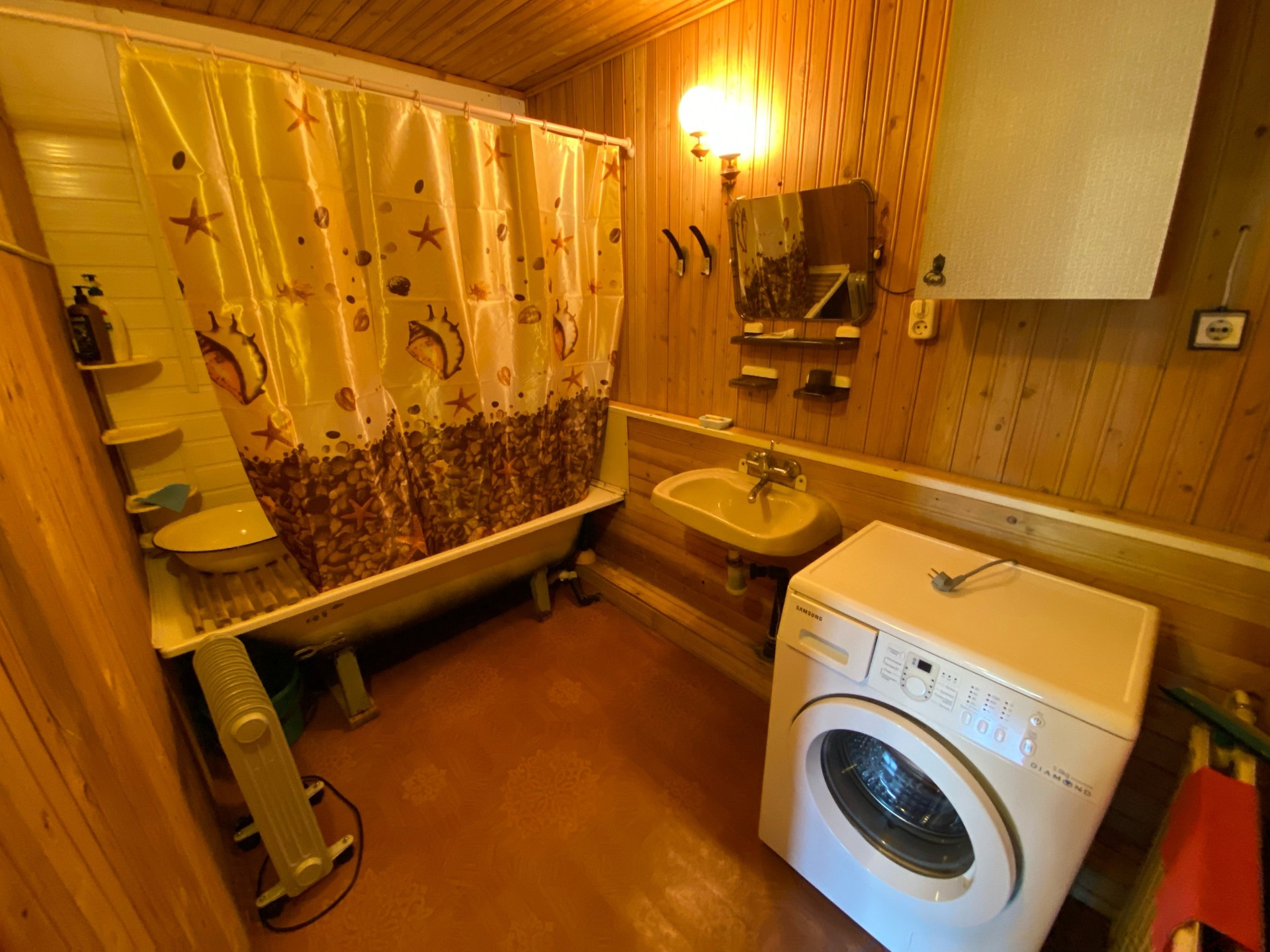 -Материал - бревно, обложенное кирпичом, в доме тепло зимой и прохладно в жаркие дни лета