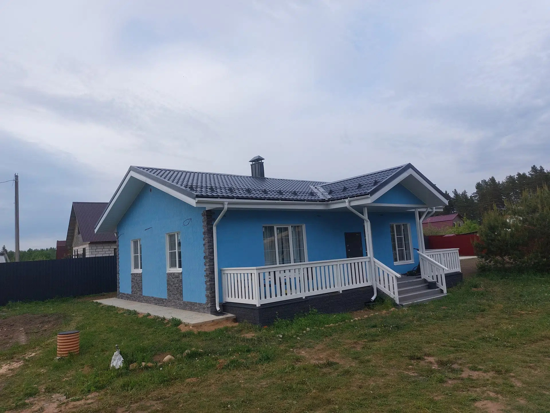 Одноэтажный небольшой дом с террасой, идеально подходящий для семейной пары или семьи с 1-2 детьми. Покупка дома возможна в ипотеку, в том числе по льготной ставке 6% и сельской ипотеке в 3%.