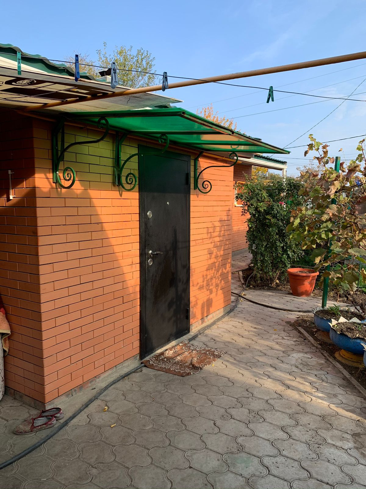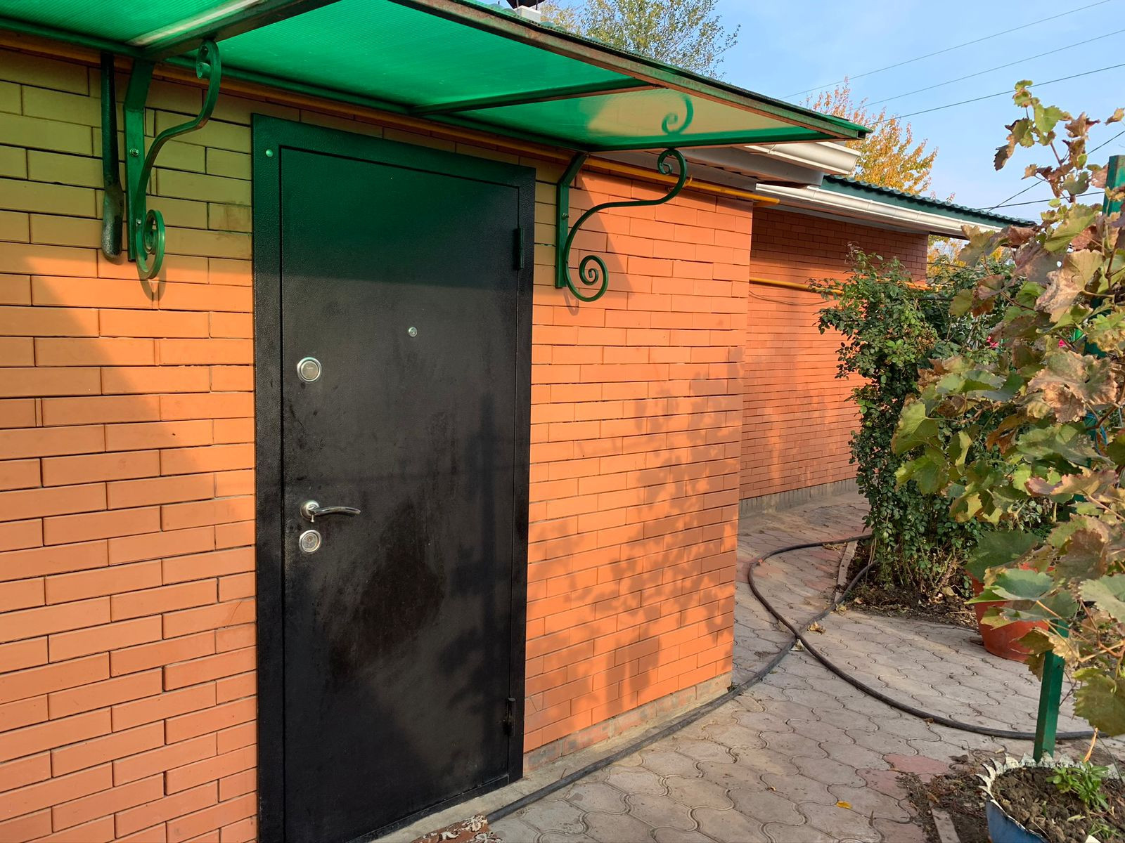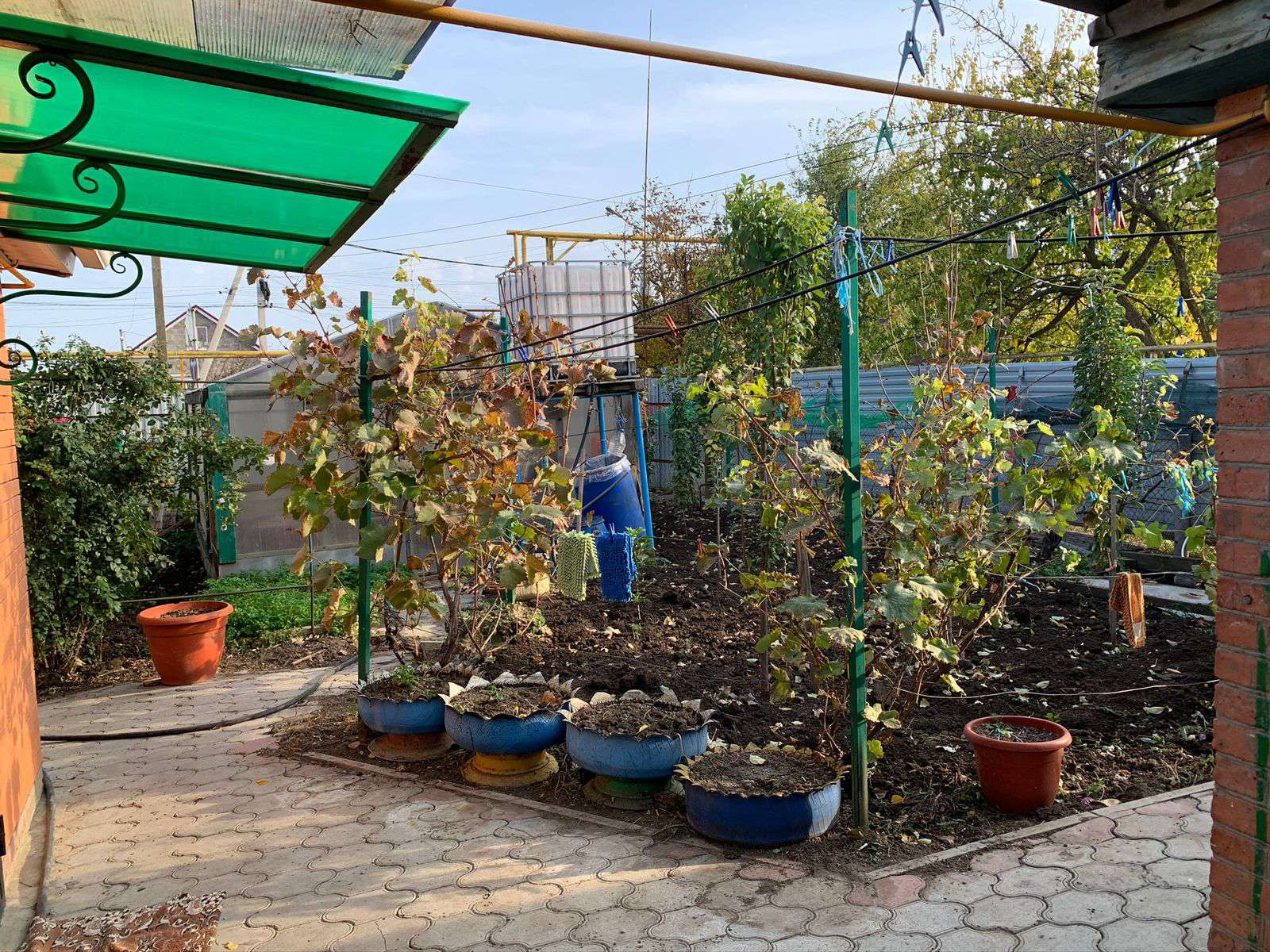 Двор вымощен плиткой. Засажен молодой сад, много кустов винограда, установлены пирамиды для выращивания клубники, что существенно экономит место, а также имеется действующая грибная мини-ферма, от вас требуется только полив и сбор урожая! Также высажены шикарные кусты роз и других цветов.