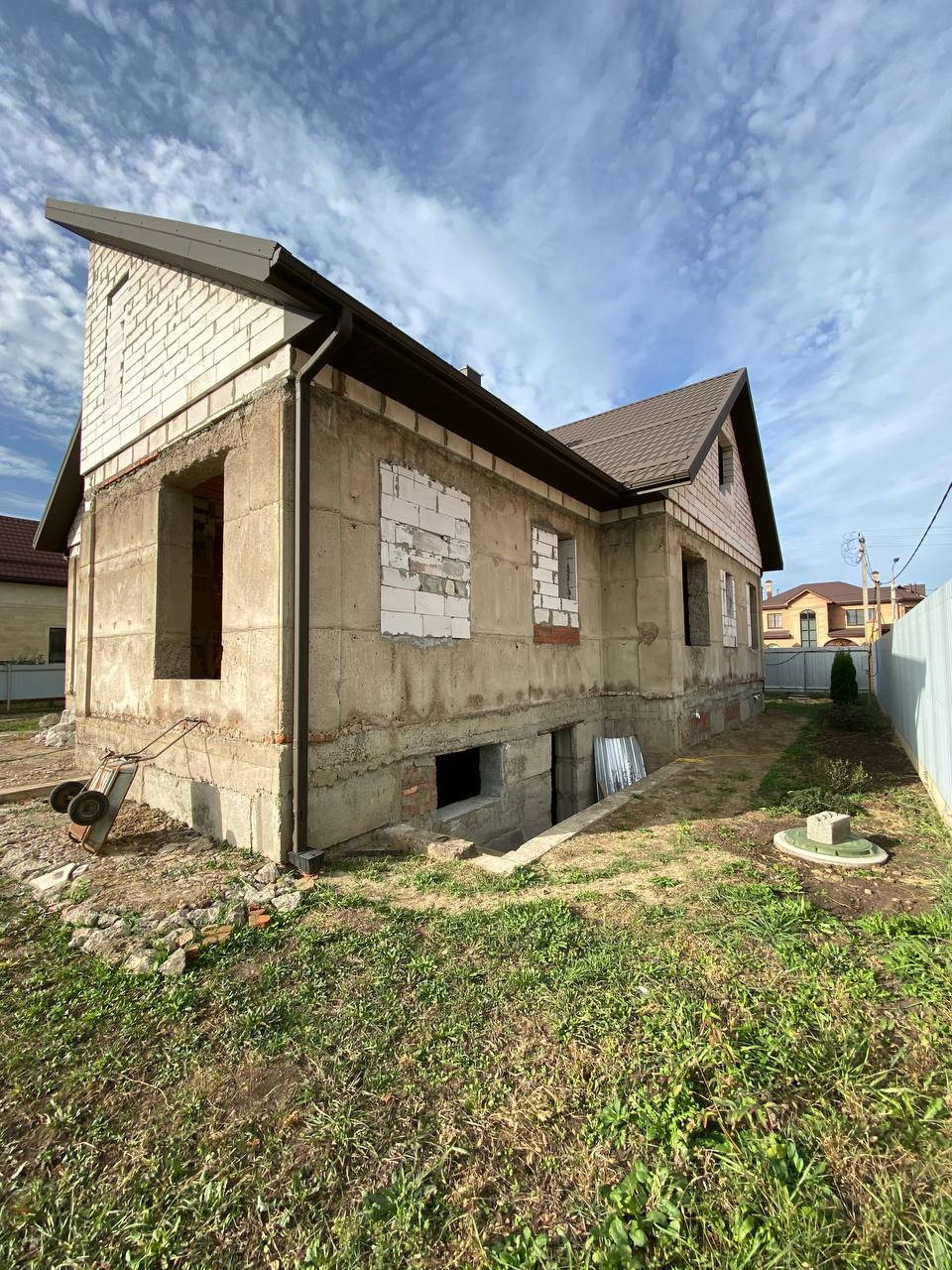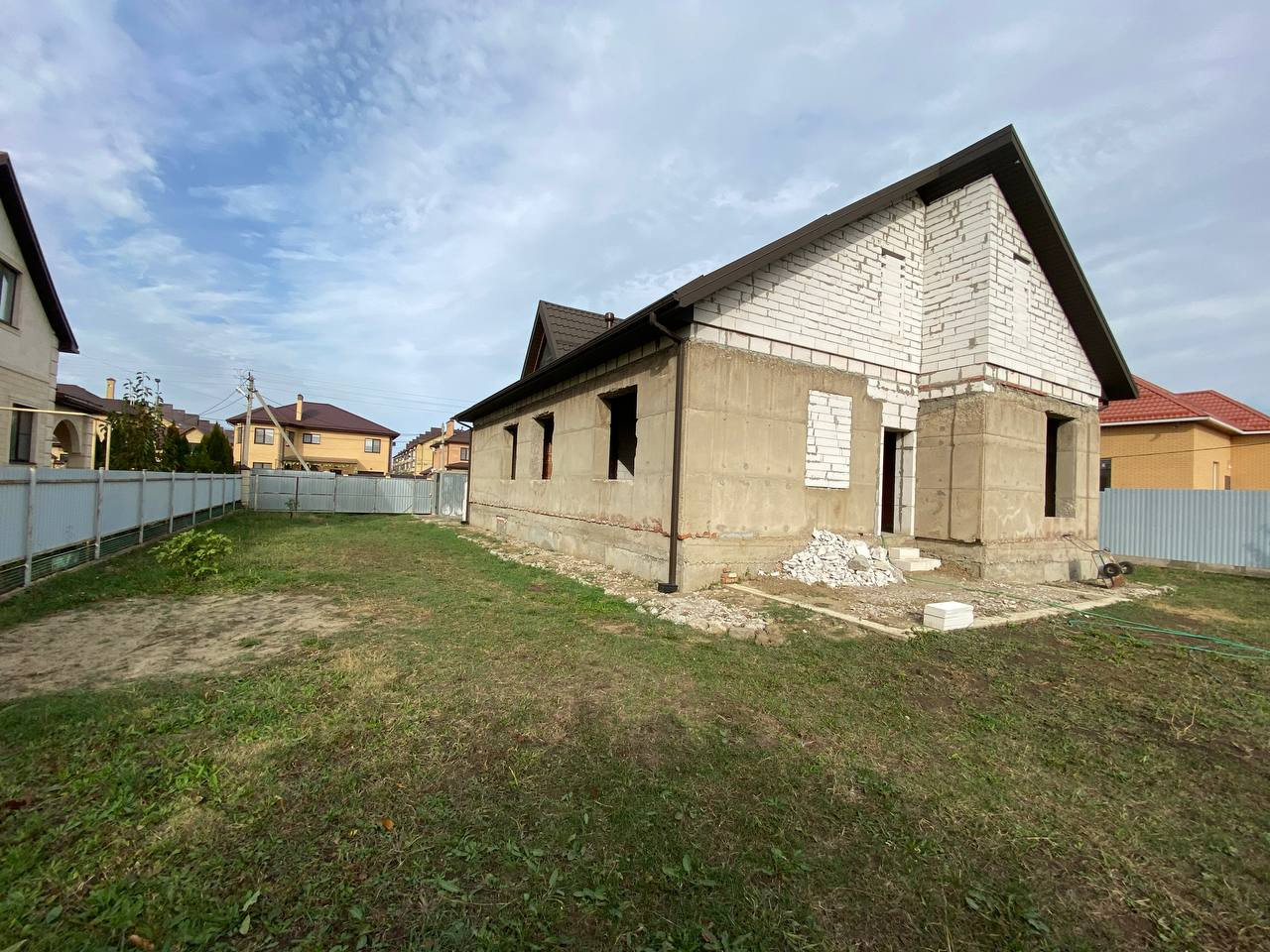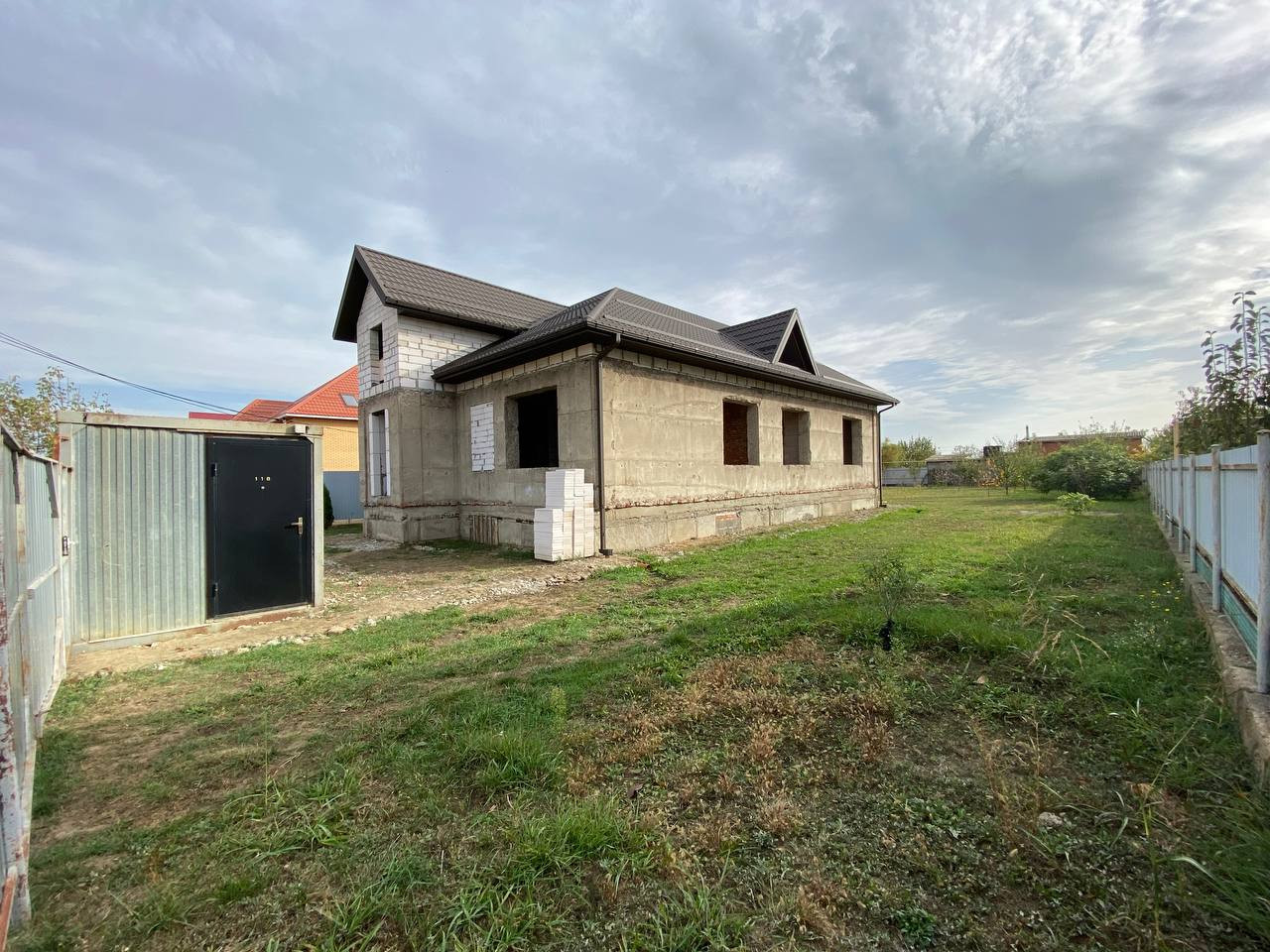 Широкая улица. Перед домом огромная площадка под стоянку и клумбу. Дружные соседи, все славяне. 3-х фазный ток. Водопровод в доме. Молодой плодоносящий сад. Тыльная сторона участка выходит в проулок. Можно разделить участок на два. Планировалась эксплуатация дома двумя родственными семьями. Возможна перепланировка. Подвал под всем домой с входом из дома и улицы. Подвал сухой, септики у всех сухие, фильтрация грунта отличная. Газ по меже, соседи все подключены. По канализации готов только септик глубиной 5м, диаметр 3м. Ливнёвка по одной стороне дома с колодцем 3,5м.