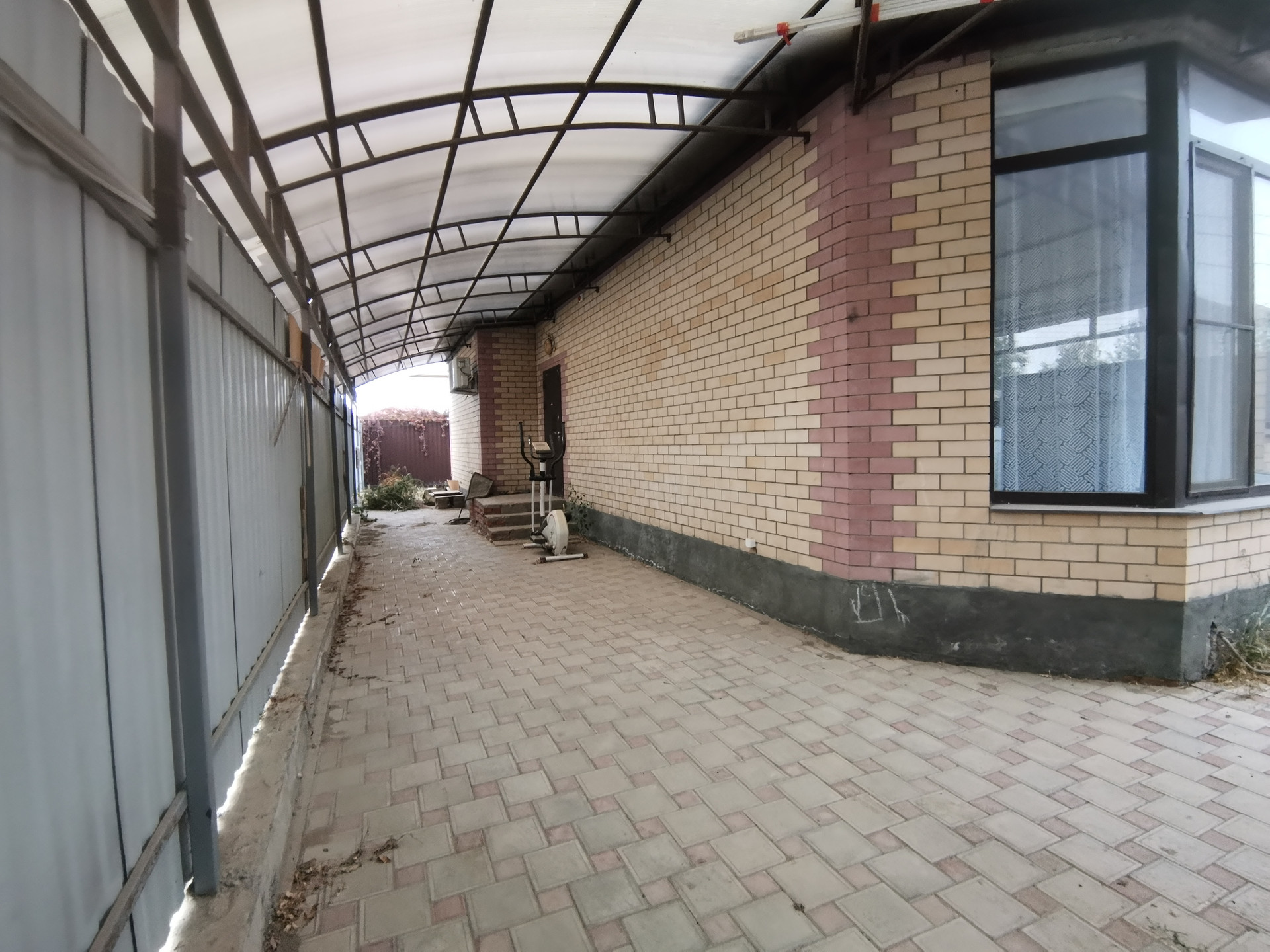 Коттедж располагается на одной второй доле земельного участка 389 м2, земли населенных пунктов для жилой застройки. Двор облагорожен плиткой. Почти на весь двор капитальный навес. Парковка на 2 автомобиля. Откатные ворота. Охрана.