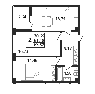 Общая площадь 64 м2