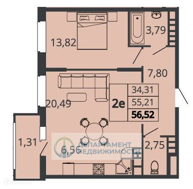 Общая площадь 56.52 м2
