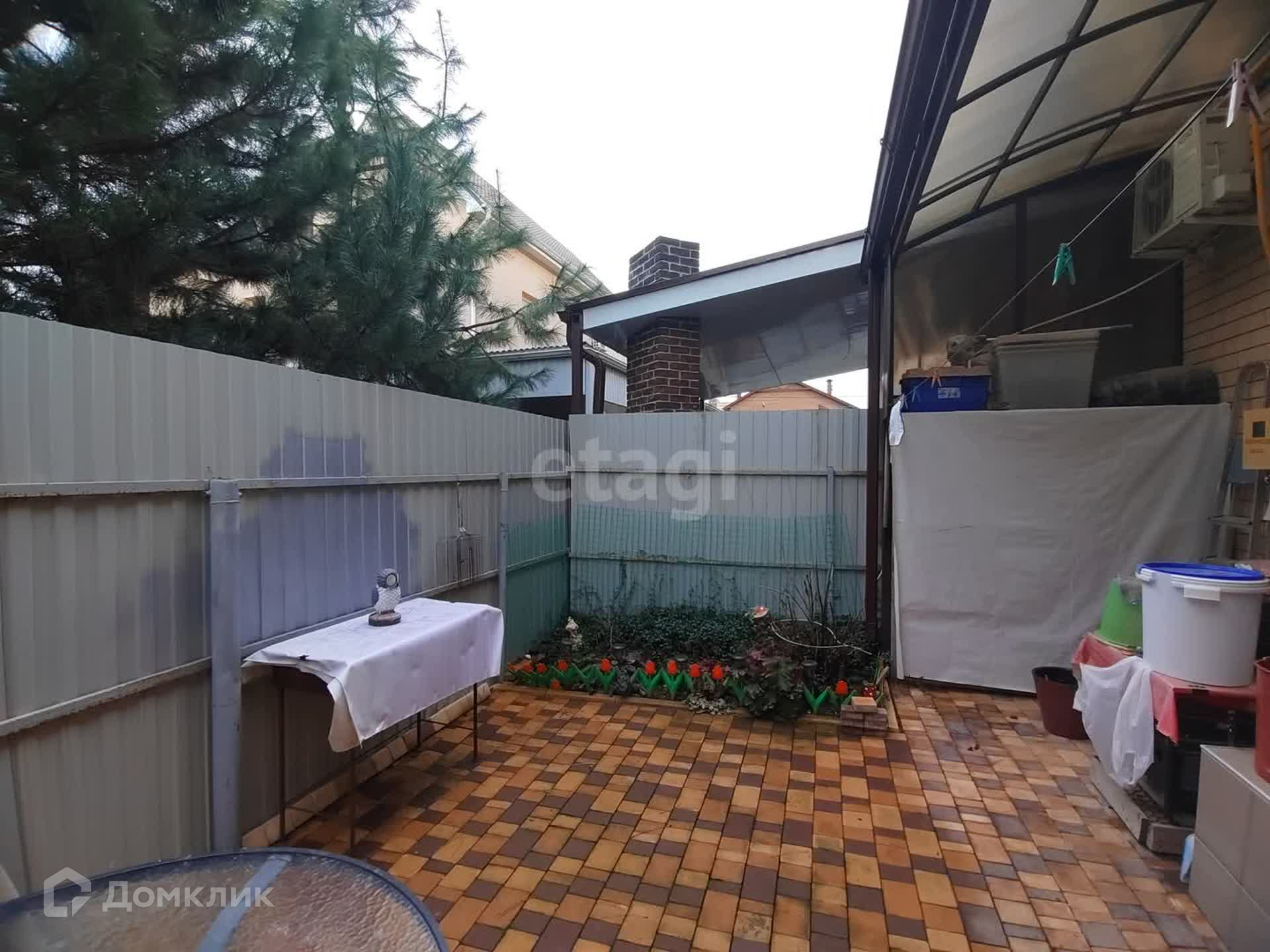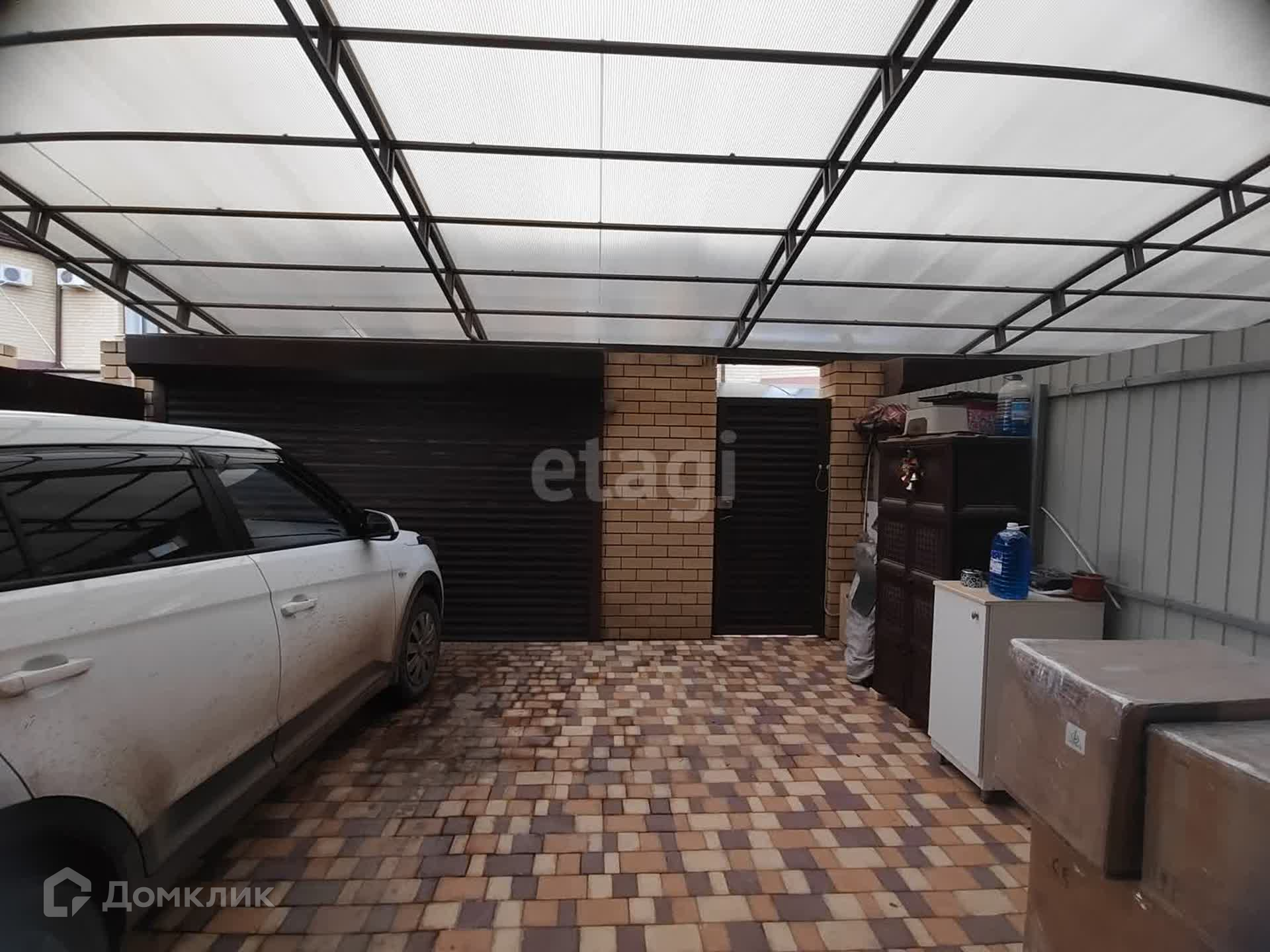 Двор в тротуарной плитке, перед домом навес и место для парковки автомобиля, задний двор - зона барбекю.
