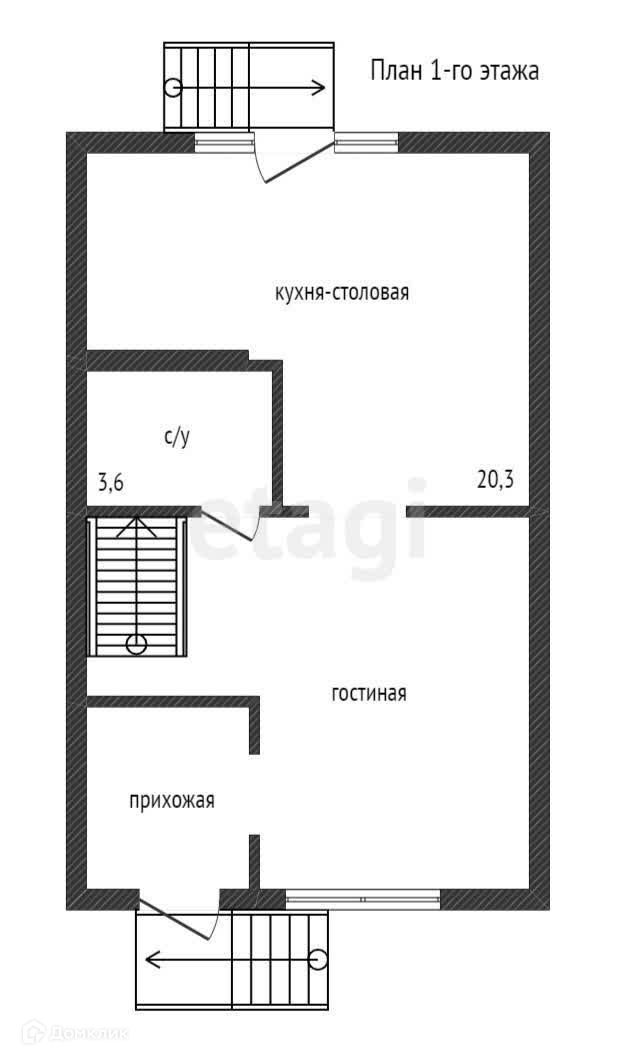На первом этаже гостиная, кухня-столовая, санузел, прихожая со встроенным шкафом-купе.