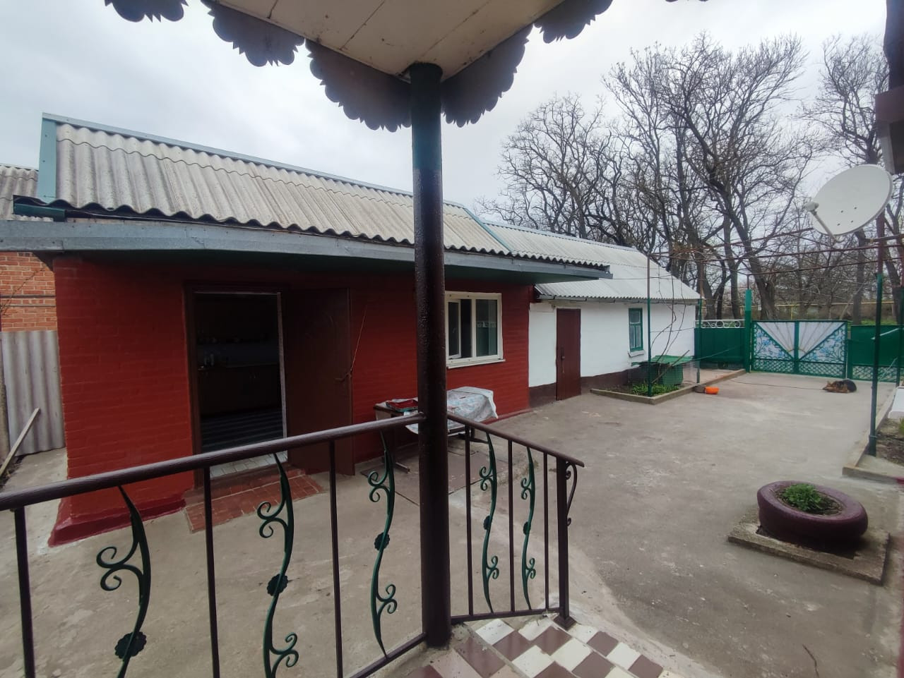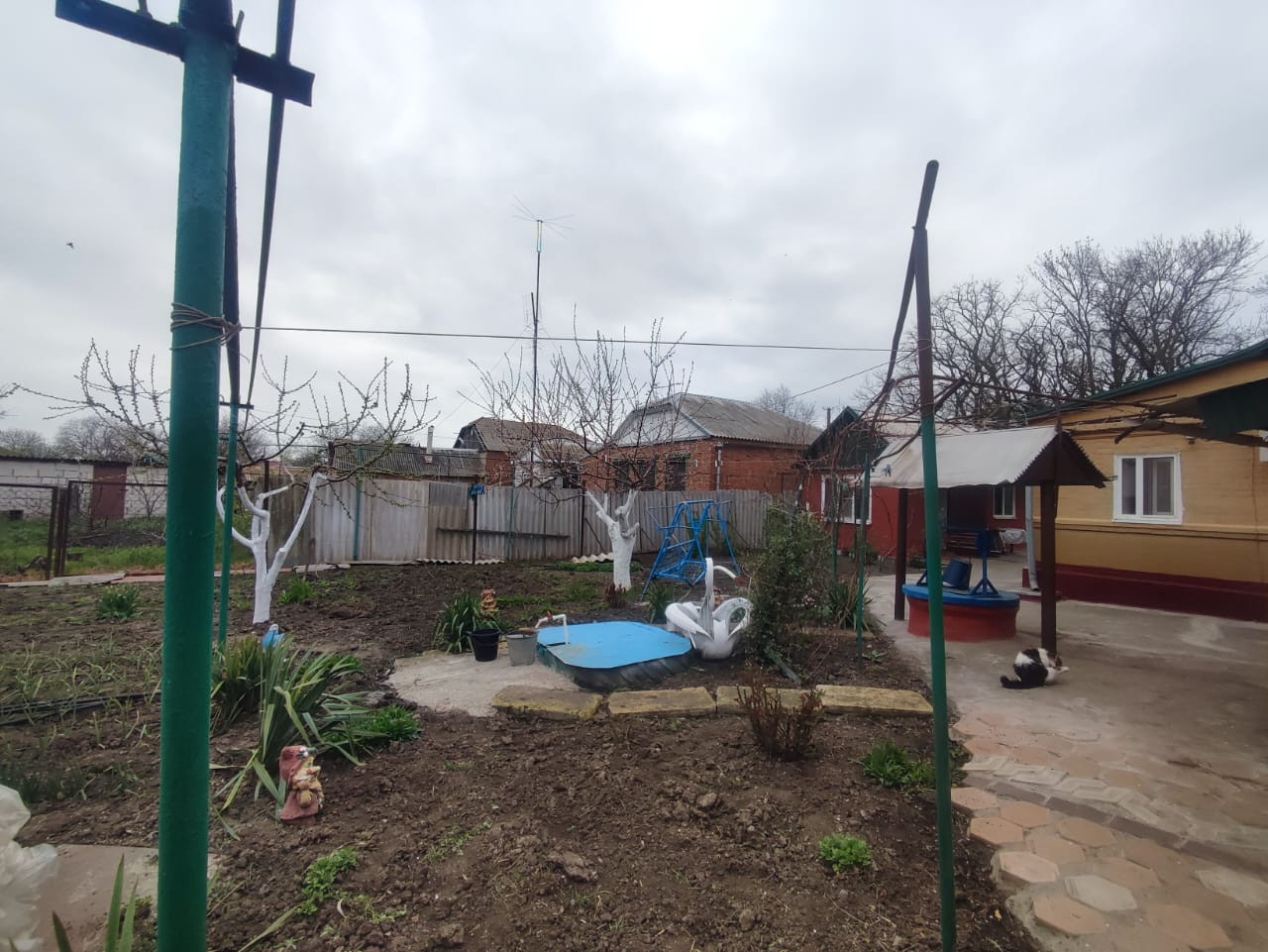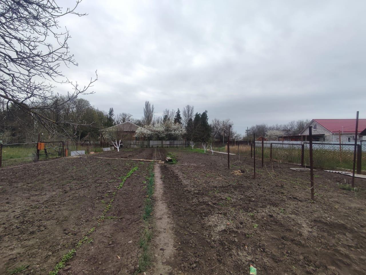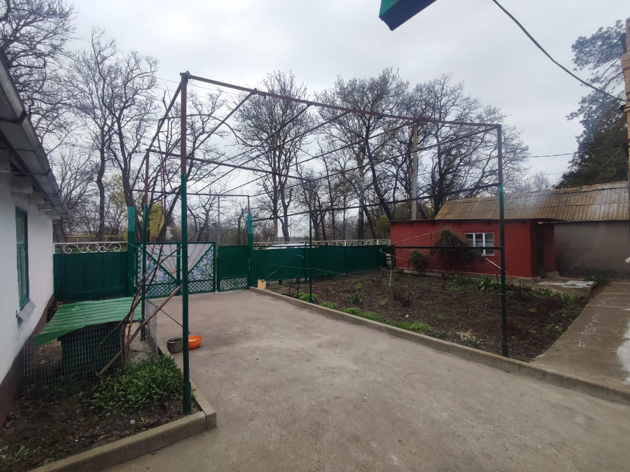 Во дворе плодоносящий сад. Деревья - слива, абрикос, черешня, яблоня, орех, нектарины - 2шт, вишня(молодая) - 3 шт. Виноград белый и чёрный. Малина, красная смородина.