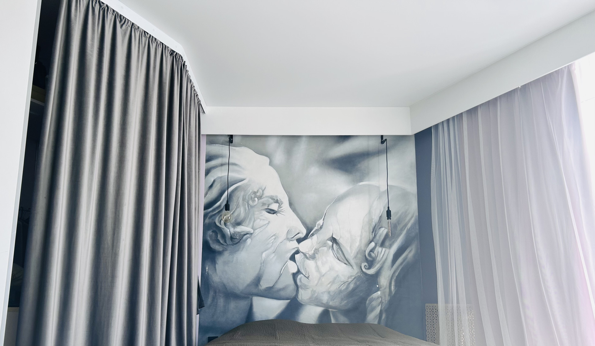 Эксклюзивное граффити от известного Томского художника украшает изголовье кровати, добавляя квартире характера и стиля.