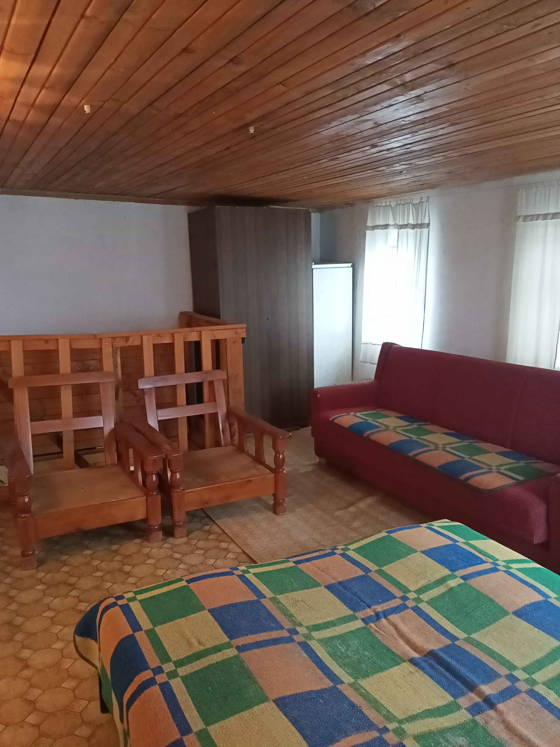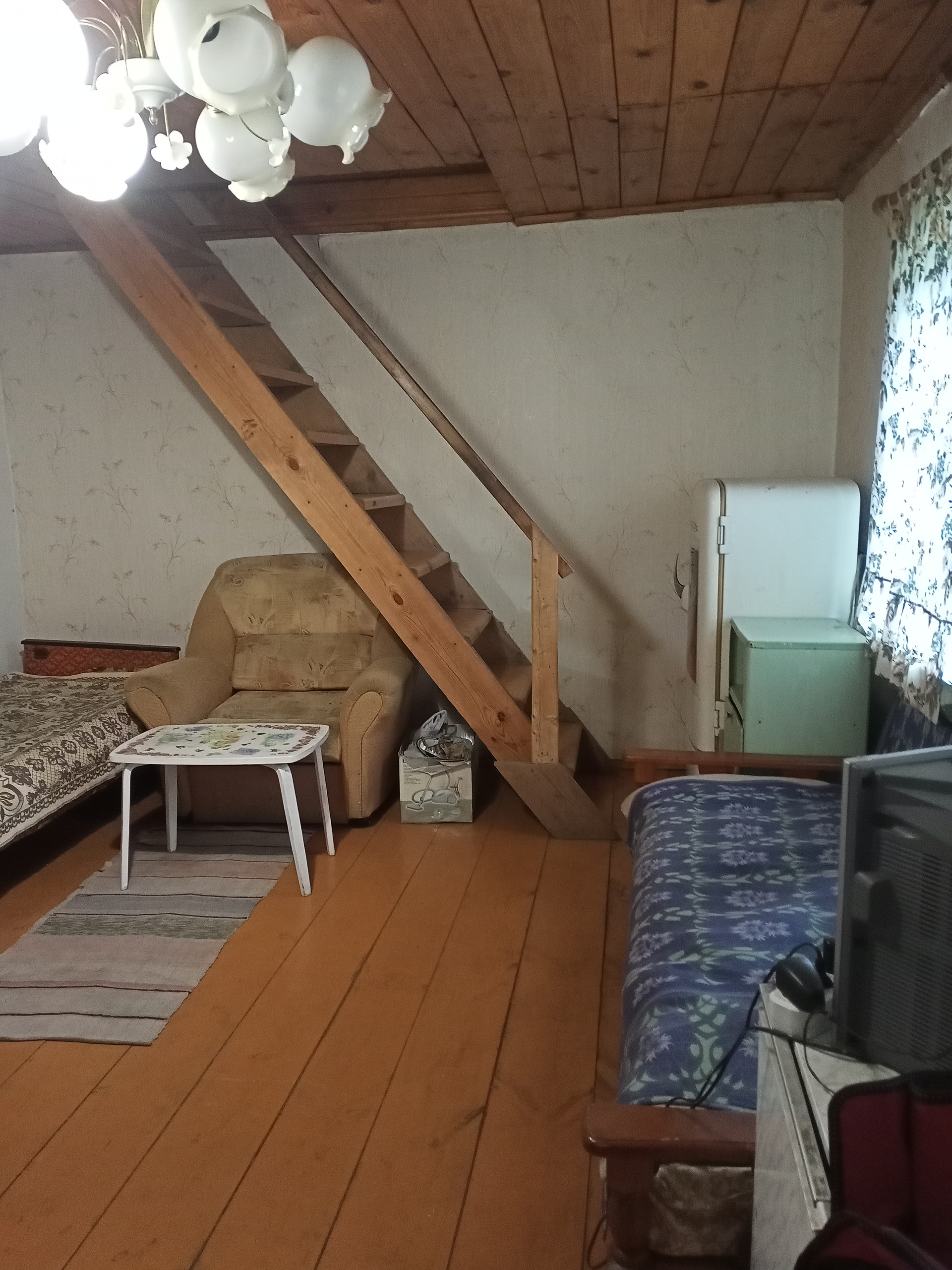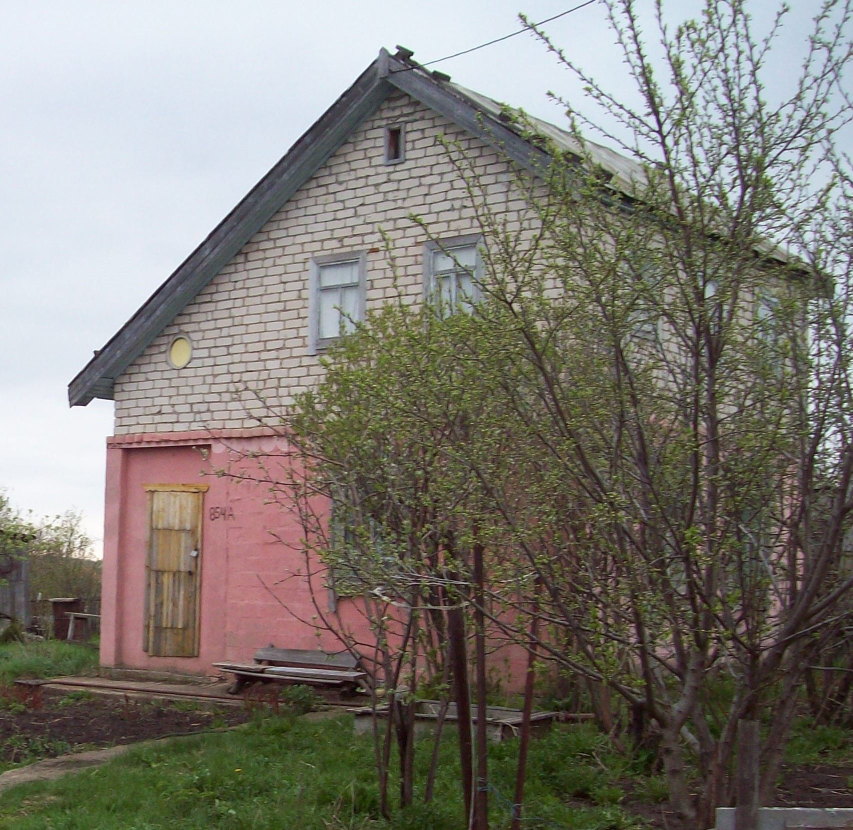 Материал стен - белый кирпич и блоки. Дом строился большим для постоянного проживания, не дачный домик. На первом этаже располагается прихожая, баня и большая гостиная комната, на втором этаже две комнаты, большая и маленькая. Дом в отличном состоянии; без погреба. Теплица 6*3 метра, хоз. блок, туалет. Баня топится ветками за 15 минут. Внутри дома сделано место под печь. Есть железная печь.