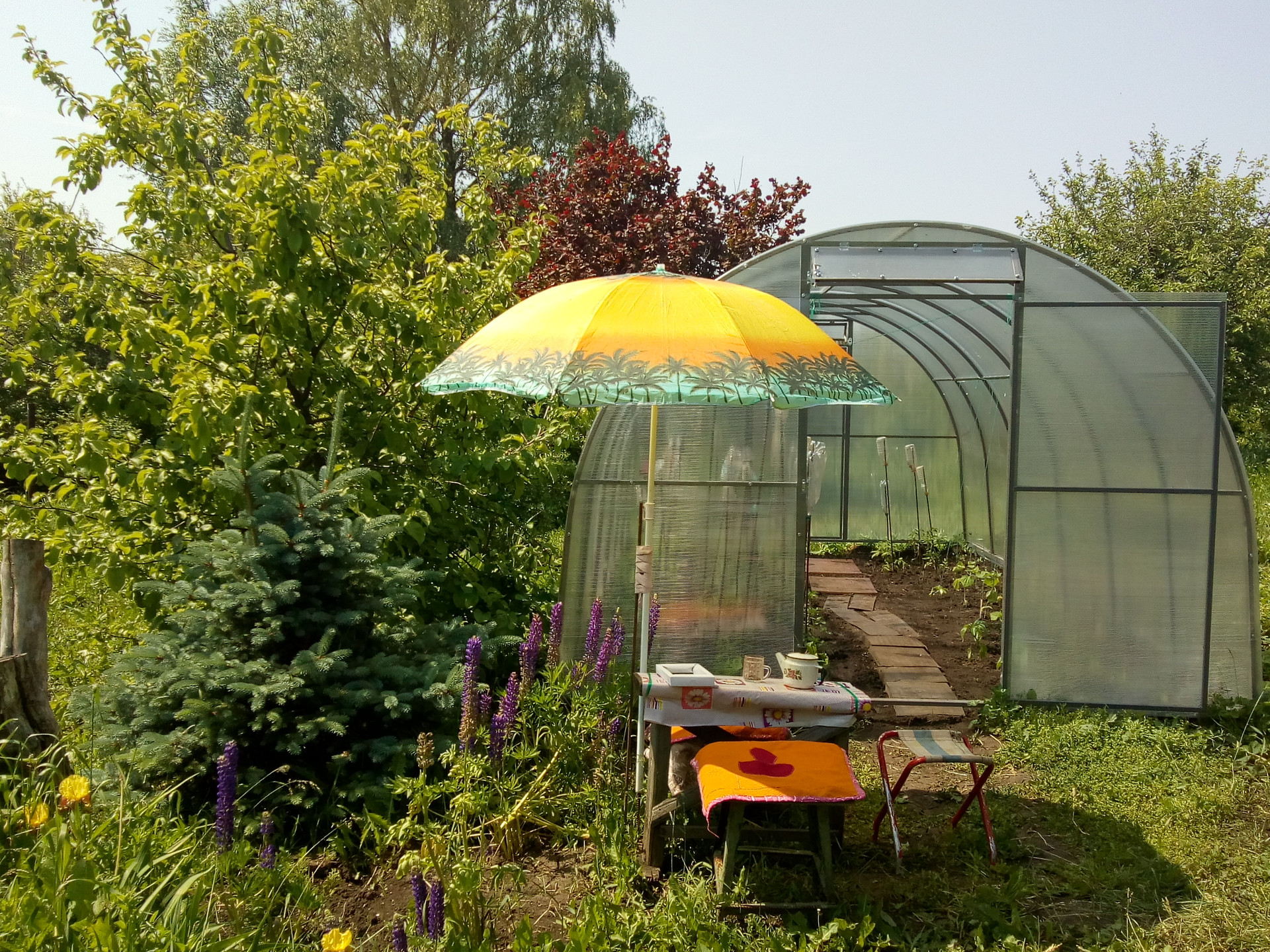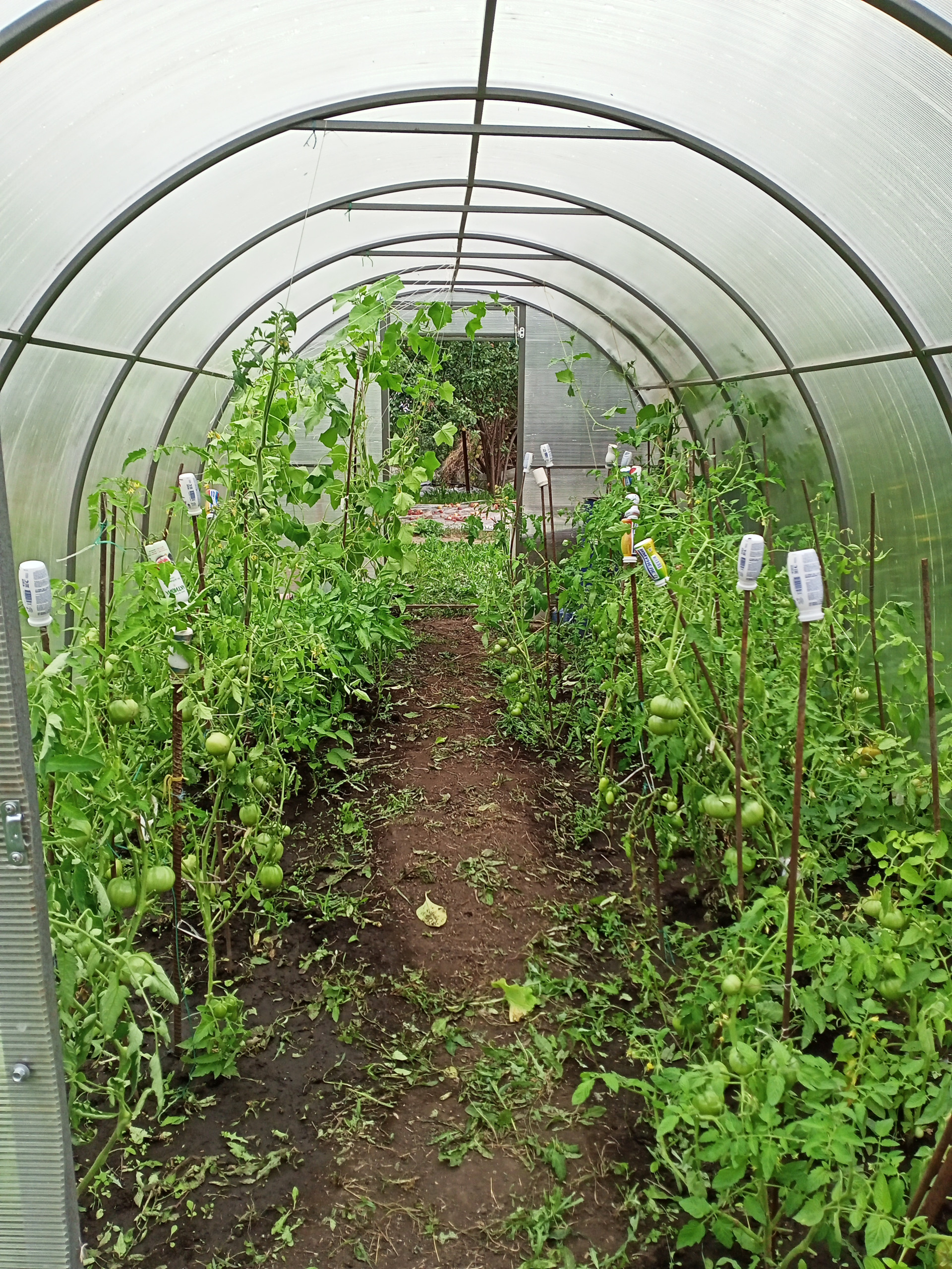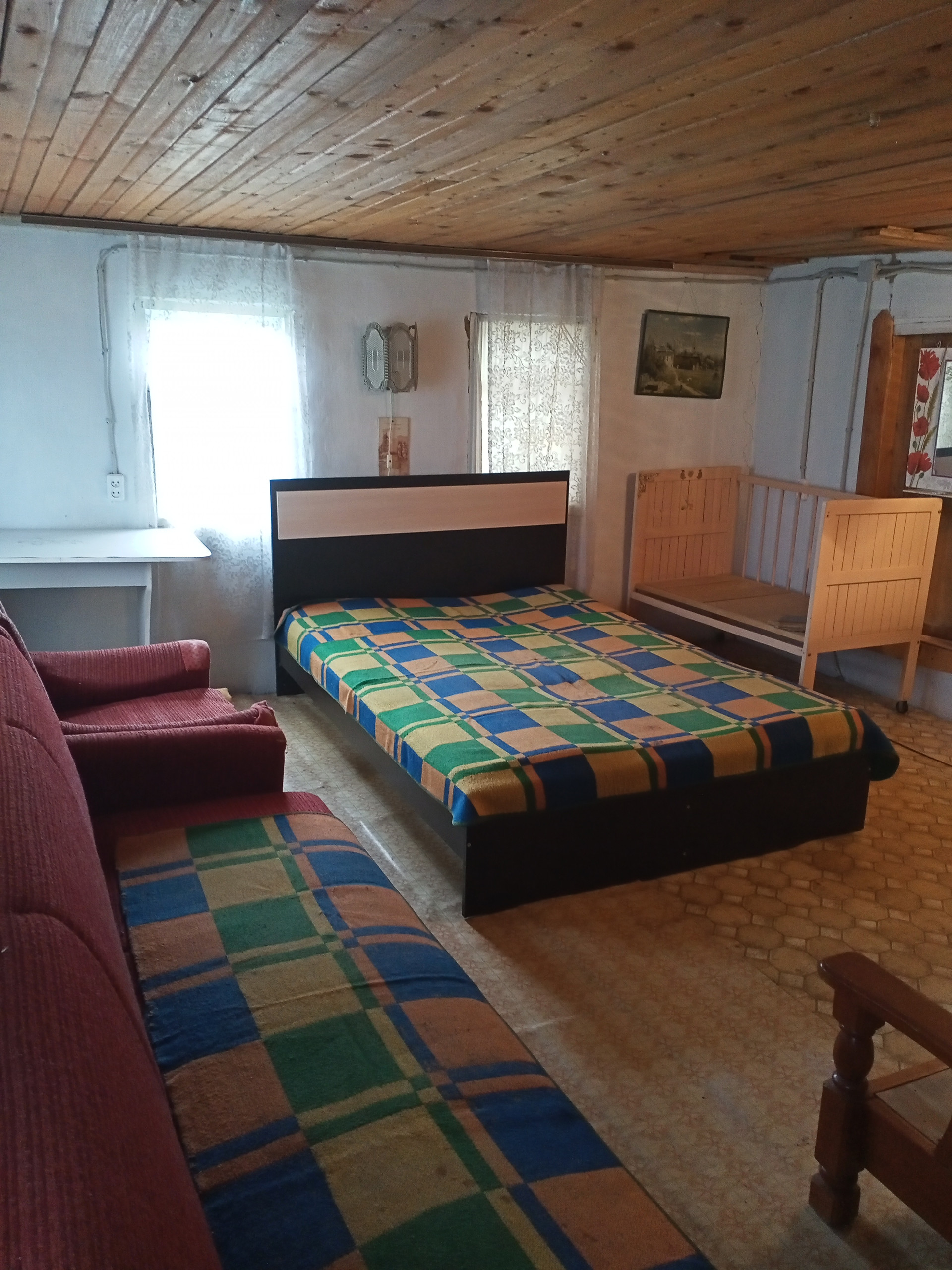 В том же году обновлена вся система полива для растений – пластиковые трубы, с четырьмя отводами для шлангов. Длина шлангов хватает по всему огороду. Полностью была вспахана вся земля. Земля плодородная - чернозем. У дома площадка для машины. Для детей есть песочница и надувной бассейн, кроватка и коляска.