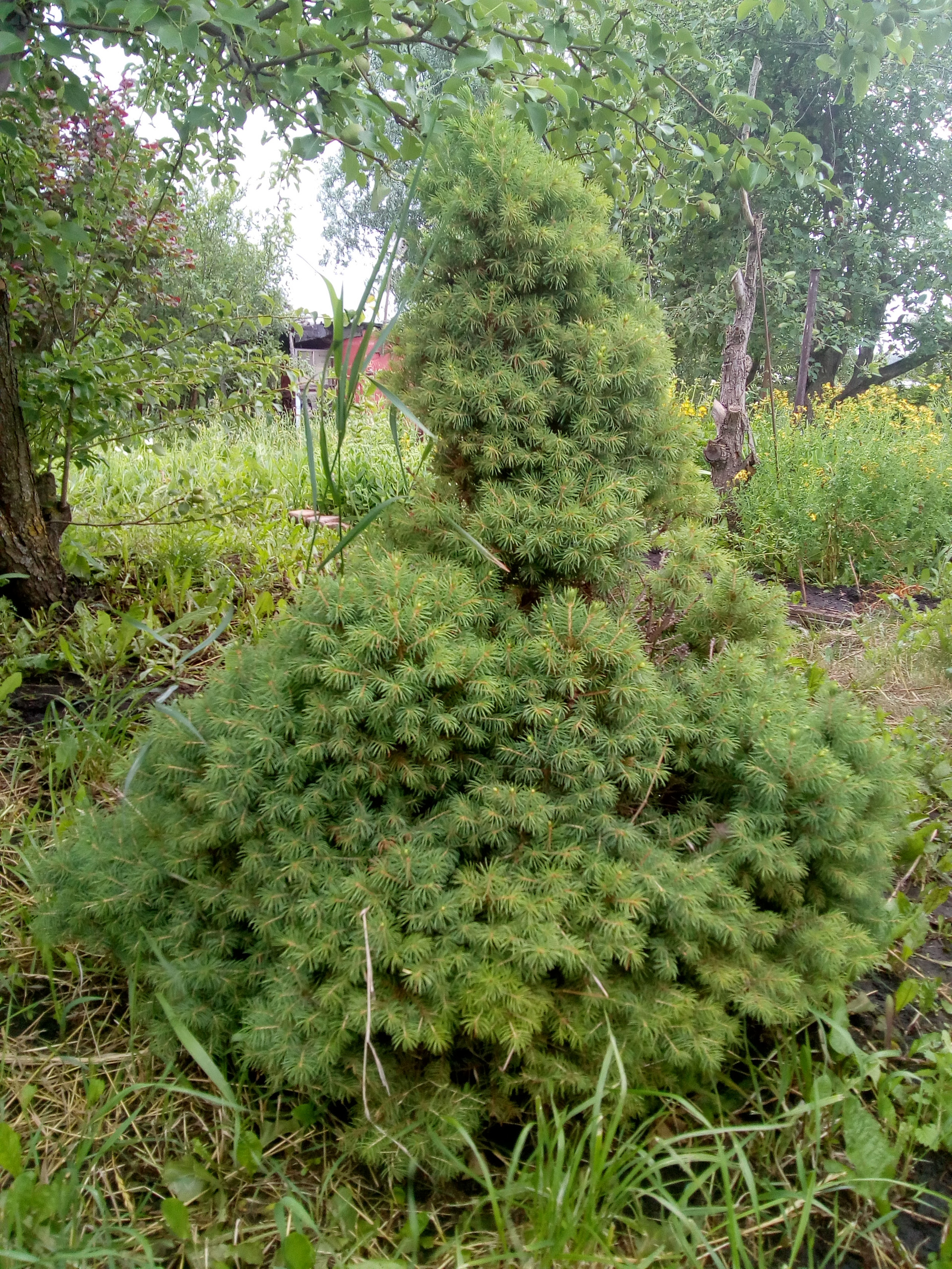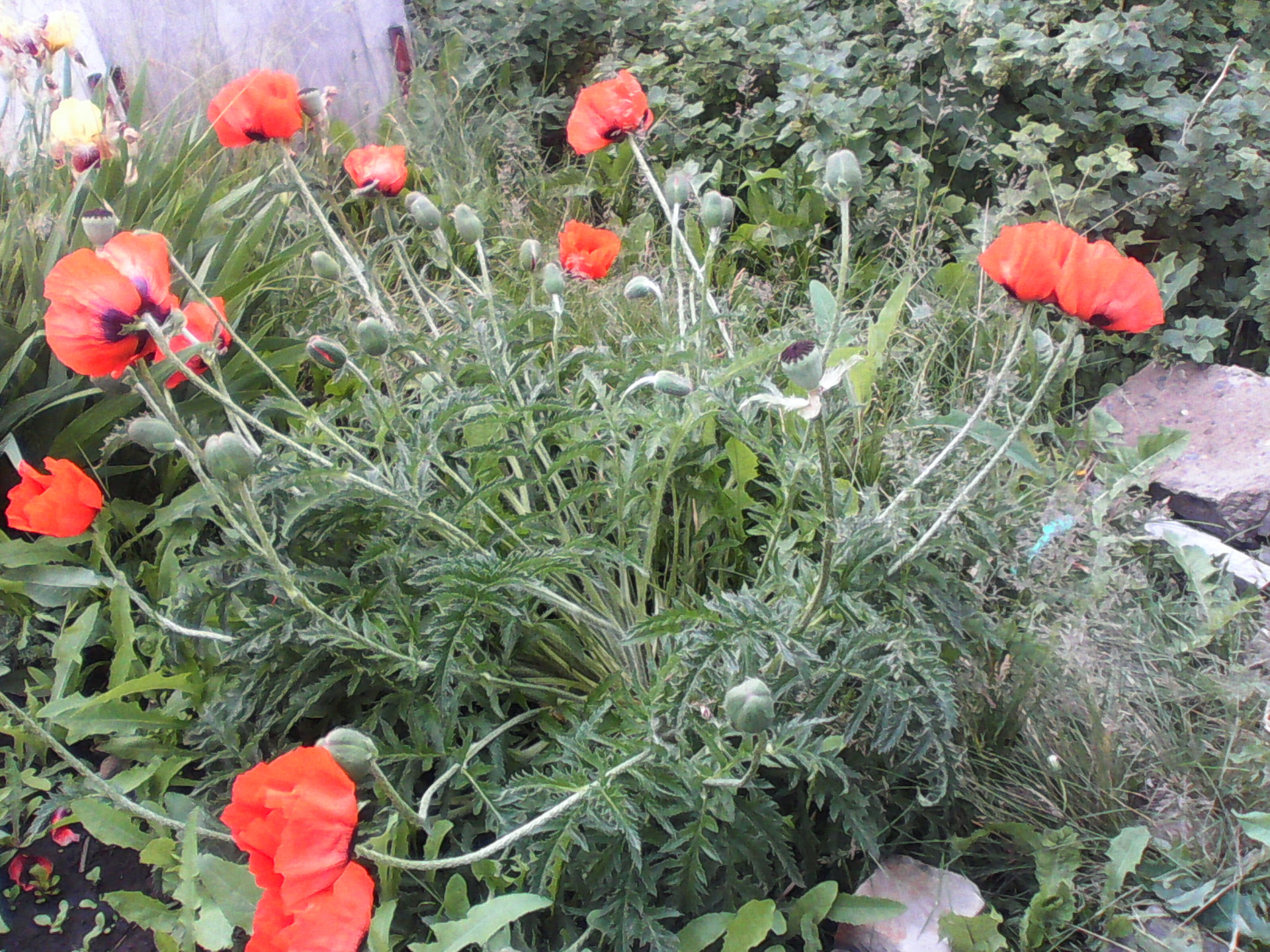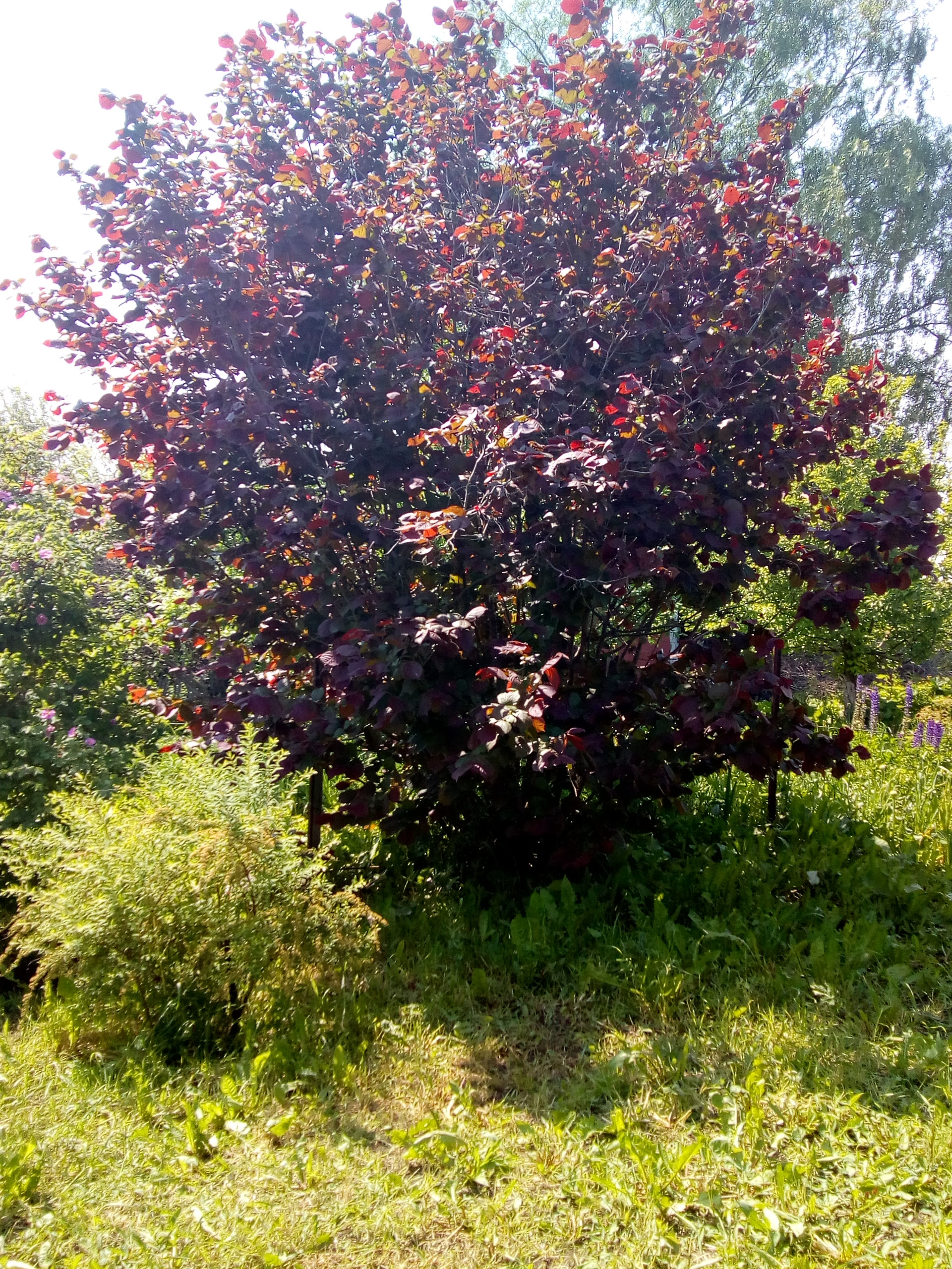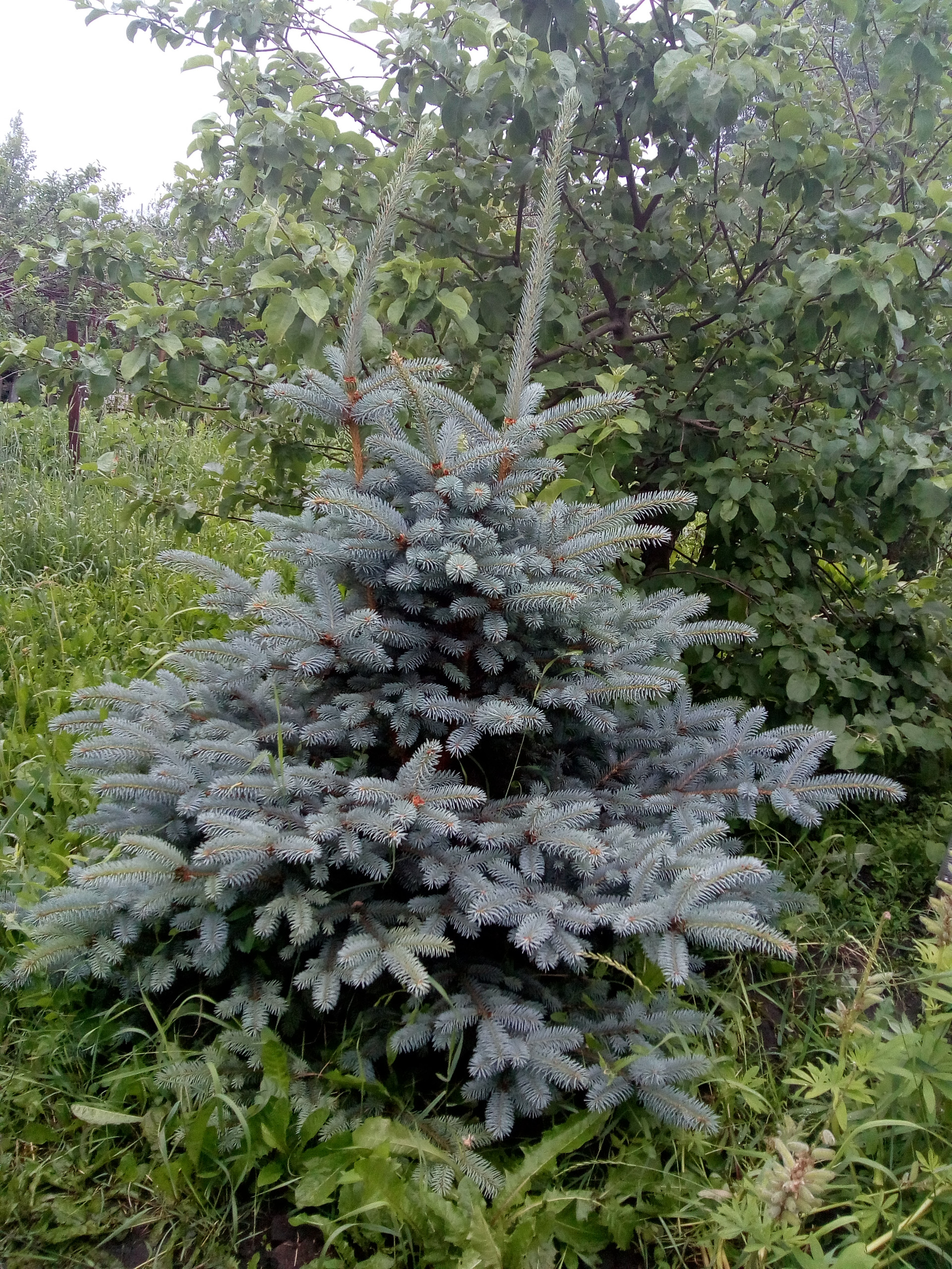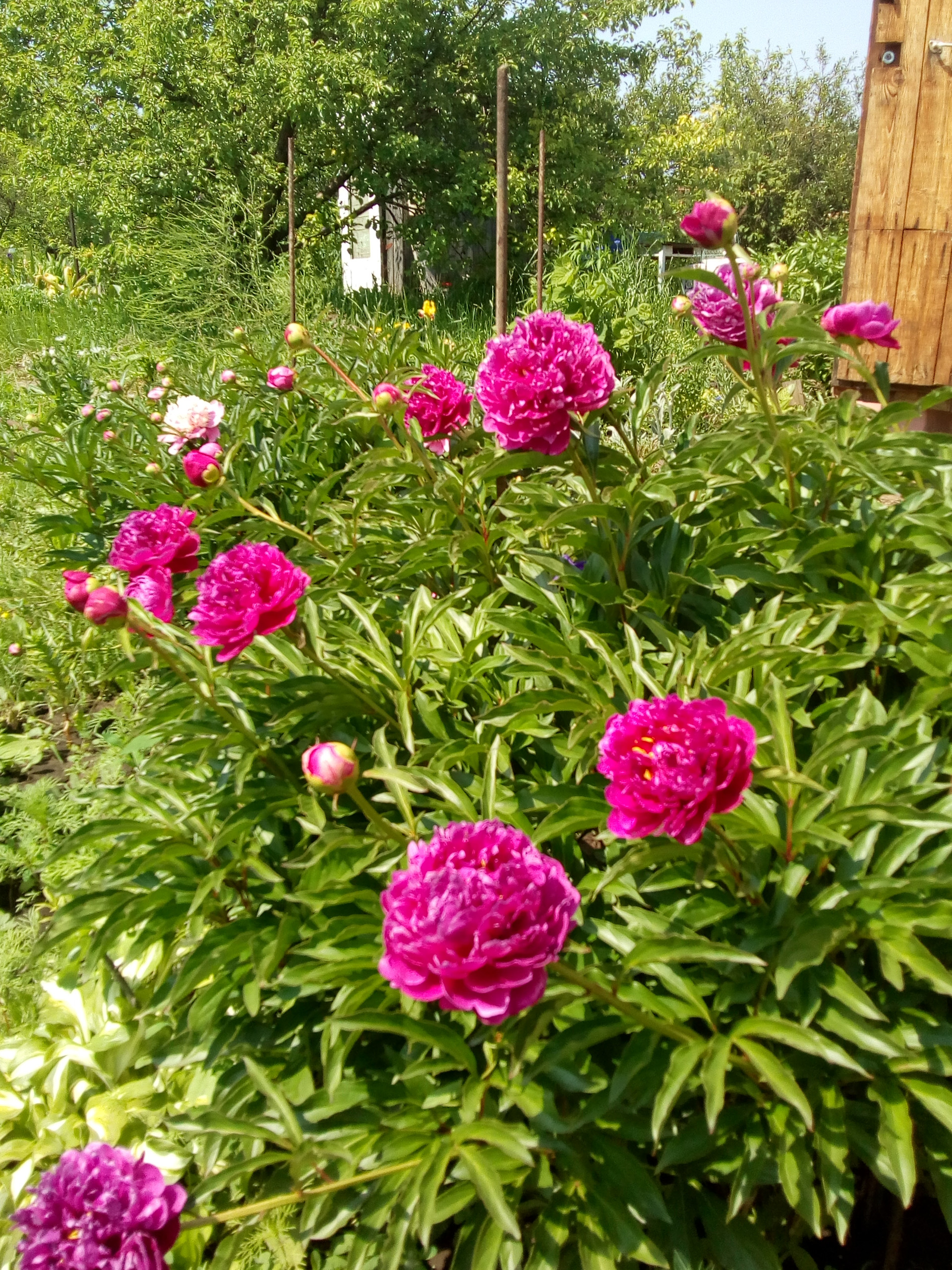 Из декоративных большая голубая ель, елка из московского питомника, белая сирень, жасмин, курильский чай, цветущие декоративные деревья и кустарники, клематис, гортензия, хосты, заячьи уши пионы, ирисы, и много других цветов.