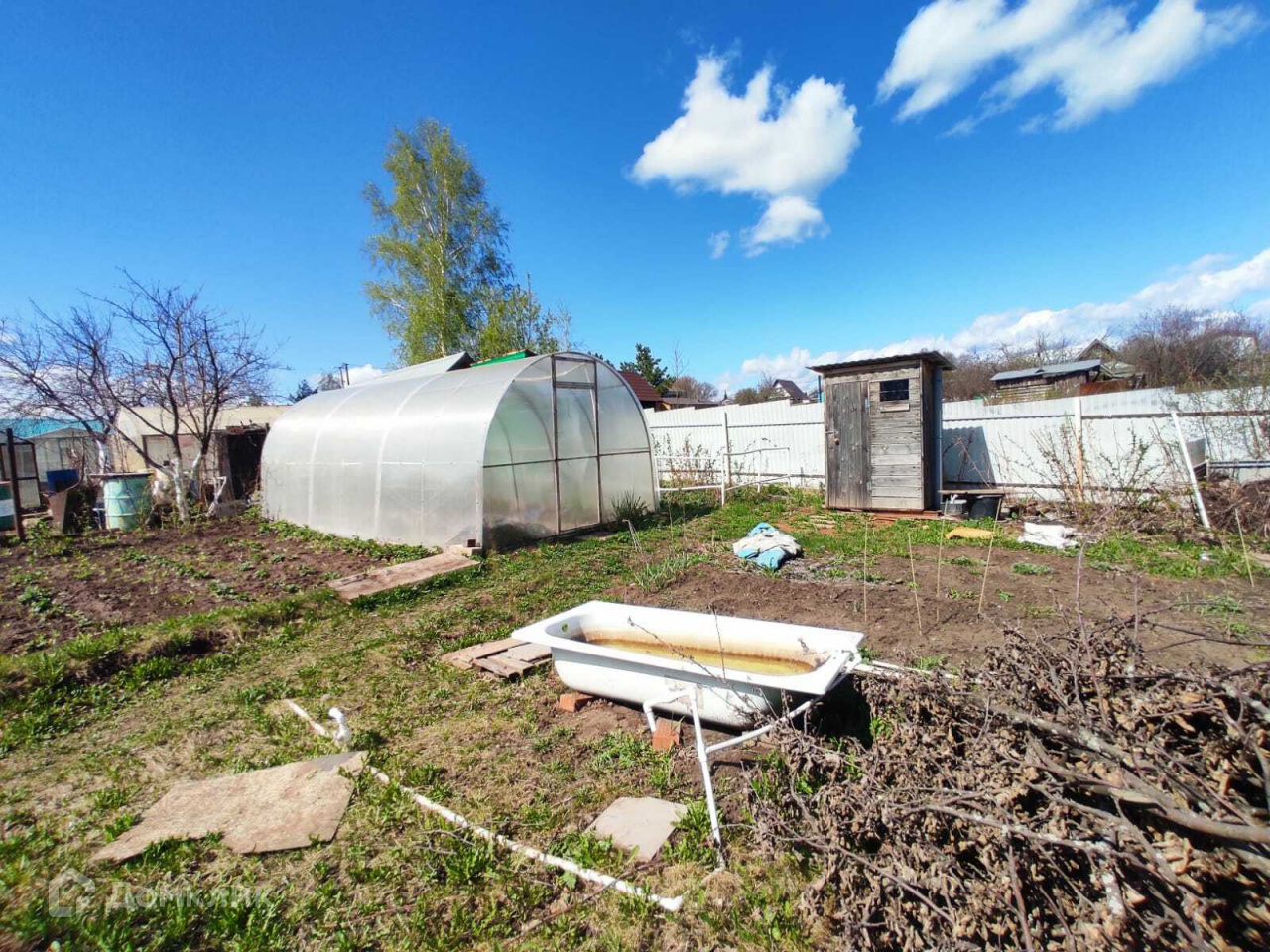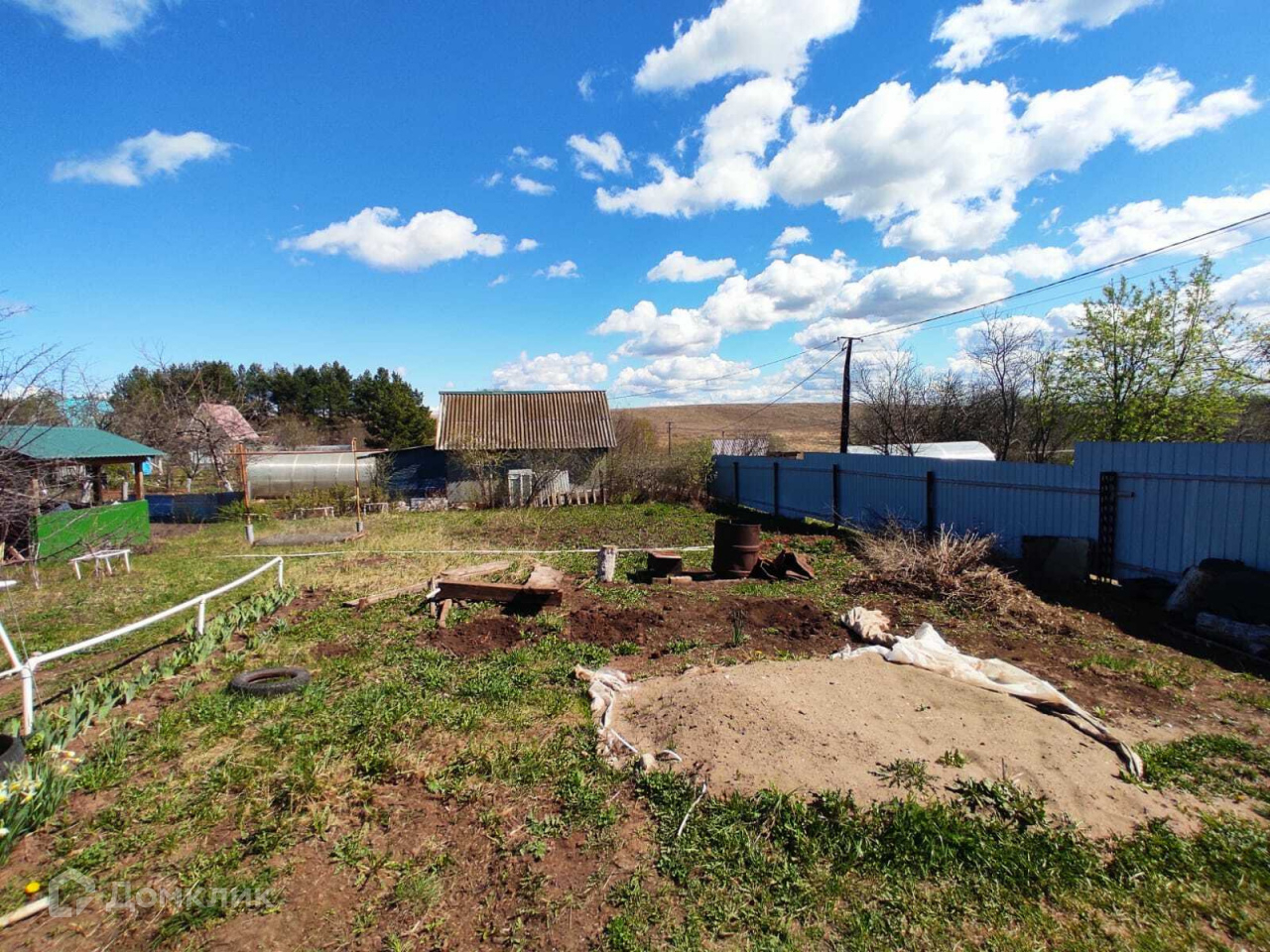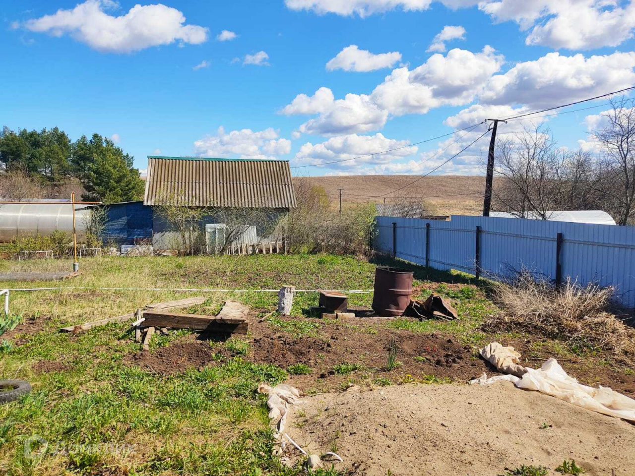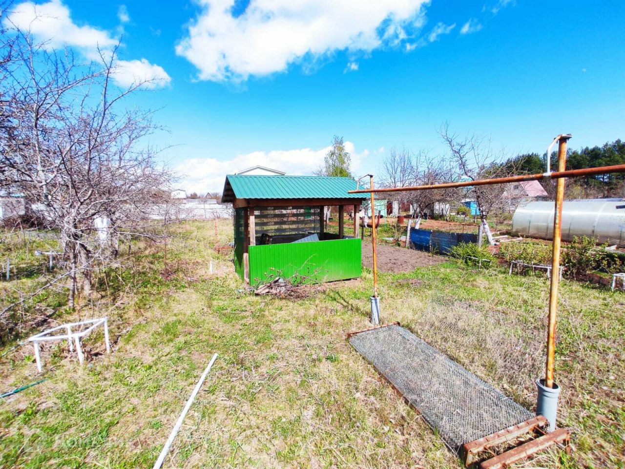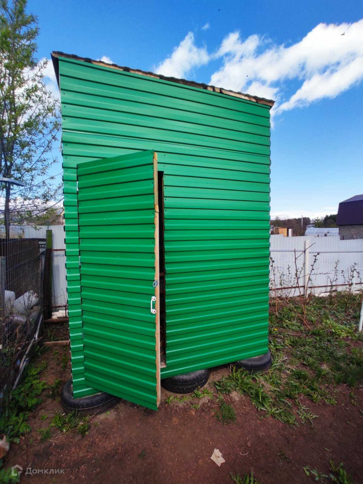 На участке есть хозблок из профнастила, уличный туалет, беседка, место для мангала.