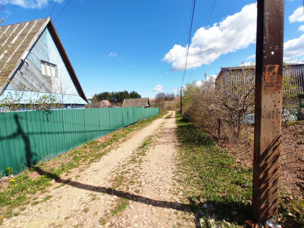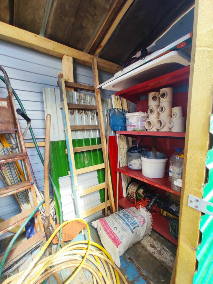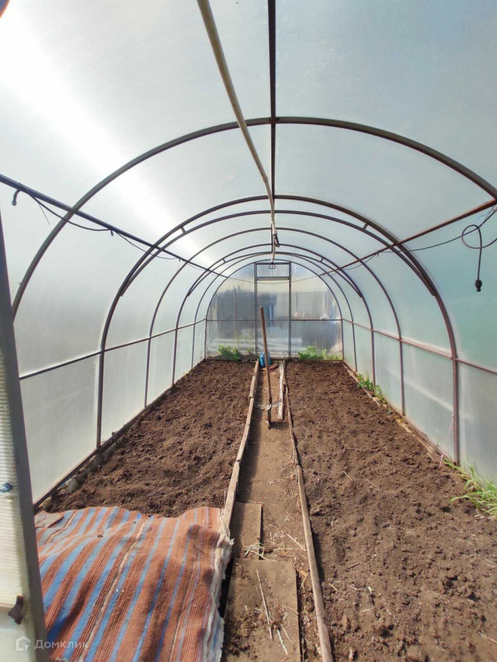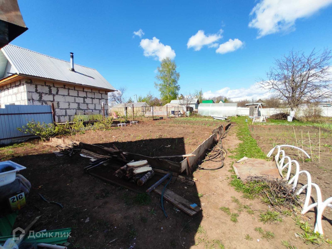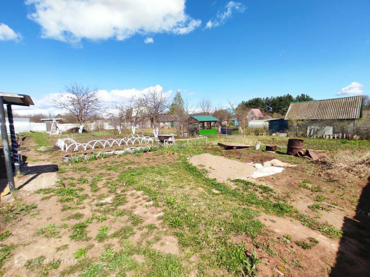 На участке есть хозблок из профнастила, уличный туалет, беседка, место для мангала.