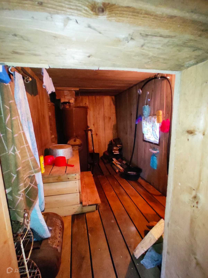 В домике - веранда, жилая комната, баня, мансарда с местами хранения.